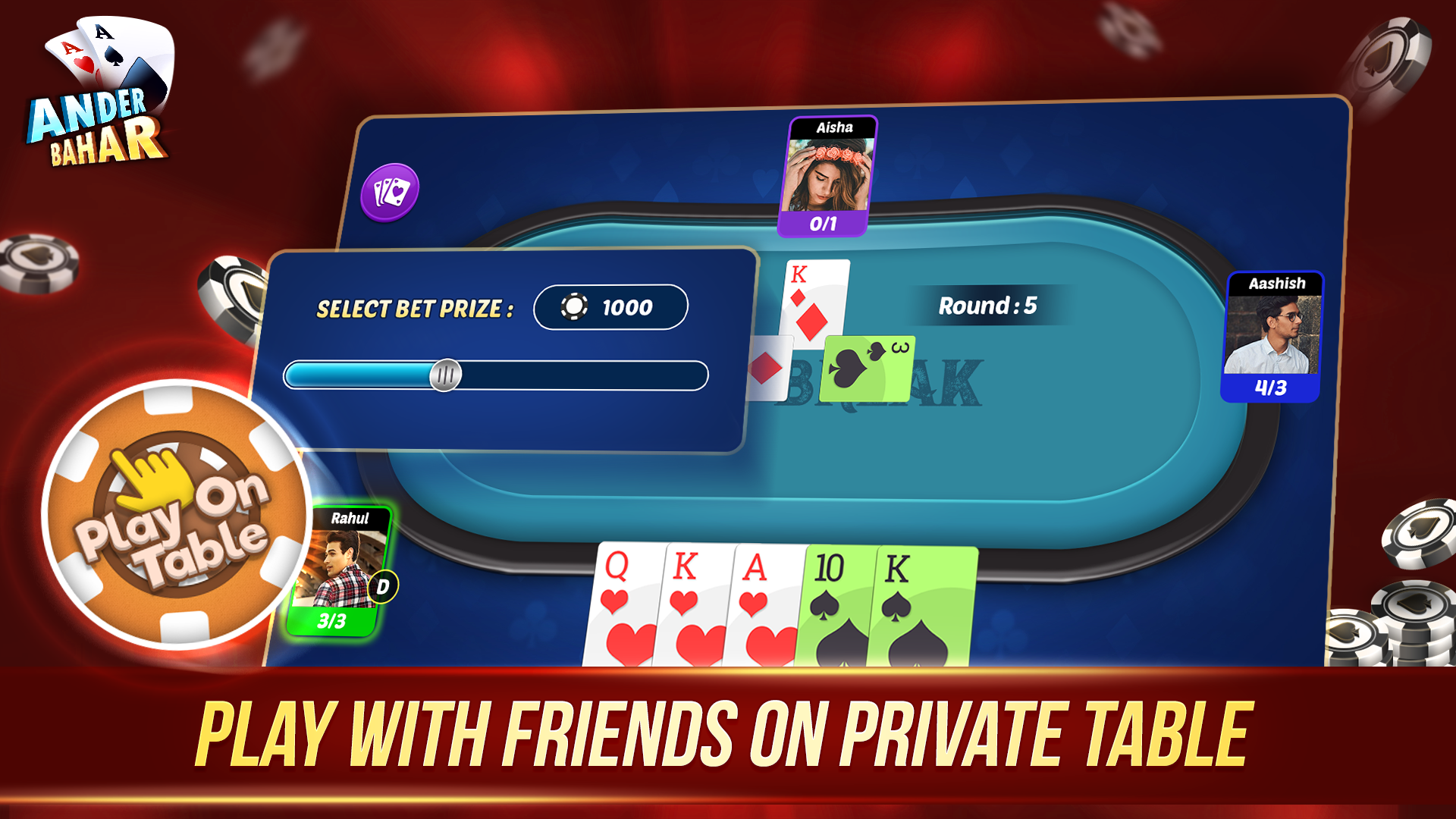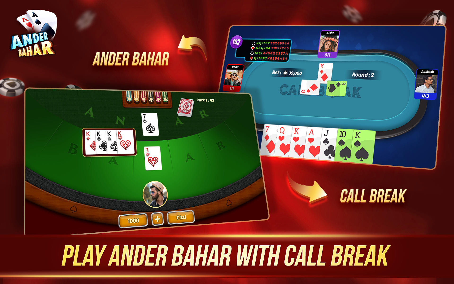Наслаждайтесь игрой Андара Бахара часами без определенной стратегии и логики. Все зависит от того, как вы предсказываете. Играйте в эту увлекательную игру со своими друзьями и семьей с уникальными специализированными игровыми режимами и невероятно плавной графикой. Карточная игра Call break — это классическая и популярная карточная игра в магазине Google Play с функцией сетевой многопользовательской игры. Карточная игра Call Break, в которую играют четыре игрока со стандартной колодой из 52 карт. Карточная игра Call Break - это стратегическая игра, основанная на трюках, похожая на Spades. Цель अंदर बाहर गेम — выбрать места в Андаре или Бахаре, где появится карта. Карточная игра Andar Bahar проста в освоении, и в этой игре нет фиксированной стратегии. Функция, которую вы получите в приложении Andar Bahar Card Game: - Захватывающие ежедневные бесплатные фишки. - Смотрите видео в любое время и зарабатывайте бесплатные фишки. - Совершенствуйте навыки прогнозирования и ВЫИГРЫВАЙТЕ. - Уникальная анимационная тема. - Простой и освежающий интерфейс. Чрезвычайно удобная и расслабляющая карточная игра. Узнайте больше о अंदर बाहर गेम: Andar Bahar Game — это традиционная индийская карточная игра со ставками, которая зародилась в Бангалоре много веков назад. Andar Bahar Card Game — это очень простая игра, основанная на удаче 50/50, в которой используется одна колода карт. Карточная игра अंदर बाहर в некоторых регионах также известна как Катти и Мангата. Andar Bahar Card Game – это игра, в которой вы можете испытать свою удачу. Просто выберите карту, сделайте ставку и пожелайте, чтобы ваша карта выиграла. В приложении Andar Bahar игрок должен делать ставки, на чьей стороне, по его мнению, выпадут карты. Результат сильно зависит от удачи и правильного предсказания карт. Андар Бахар Геймплей: - Карточная игра Андара Бахара посвящена тому, чтобы испытать свою удачу. - В таш-игре есть два места под названием «АНДАР» или «БАХАР». - Игрок должен выбрать одно из мест на столе, на которое он хочет сделать ставку в अंदर बाहर गेम. - Для игры в Andar Bahar Game используется одна колода. - После выбора раздела ставок карты сдаются на стол. - Если карты сданы в соответствии с прогнозом игрока, он ВЫИГРЫВАЕТ. - Дилер сдает одну карту лицом вверх в центр стола, а затем продолжает раздавать карты лицом вверх в секции Андар и Бахар. - Когда появляется карта, которая соответствует значению средней карты, игра заканчивается. В этой таш-игре игрок может увеличить сумму ставки, играя в карты, нажав кнопку «плюс», указанную под профилем пользователя. В приложении Andar Bahar также есть функция мультиигр, если вам наскучила одна игра, начните играть в карточную игру Call Break. В карточной игре Call Break могут участвовать 4 игрока. В карточной игре Call Break 5 раундов. Пики — козырные карты. Call Break Card Game — это стратегическая карточная игра, в которой есть трюки и торги. В некоторых регионах Индии и Непала карточная игра Call Break известна под многими названиями, такими как игра таас и лакди. И так, чего же ты ждешь? Развлекайтесь, играя в карточную игру Andar Bahar and Call Break. Карточная игра Andar Bahar предназначена только для развлекательных целей, где вы можете играть и выигрывать фишки в игре. Andar Bahar Game известна как таш-игра и представляет собой карточную игру со ставками в британском стиле азартных игр. Приложение Andar Bahar не поддерживает какие-либо «азартные игры на 