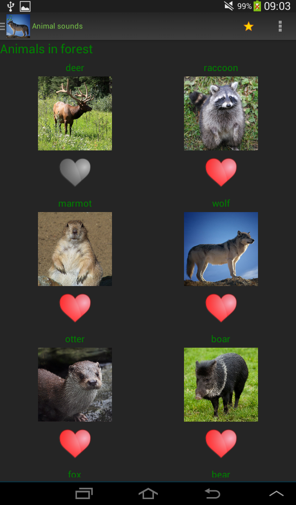 Каждое животное может быть отнесено в избранное.