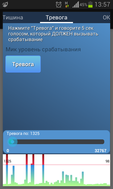 Особенностью Радионяни является то, что Вы сами точно определяете уровень, при котором приложение сообщит о появлении звуков в помещении, тем самым исключая звонки при слабом шуме (шорохи, кряхтение и прочее). Радионяня определяет уровень звука в комнате и реагирует только в случае превышения заданного уровня звука.