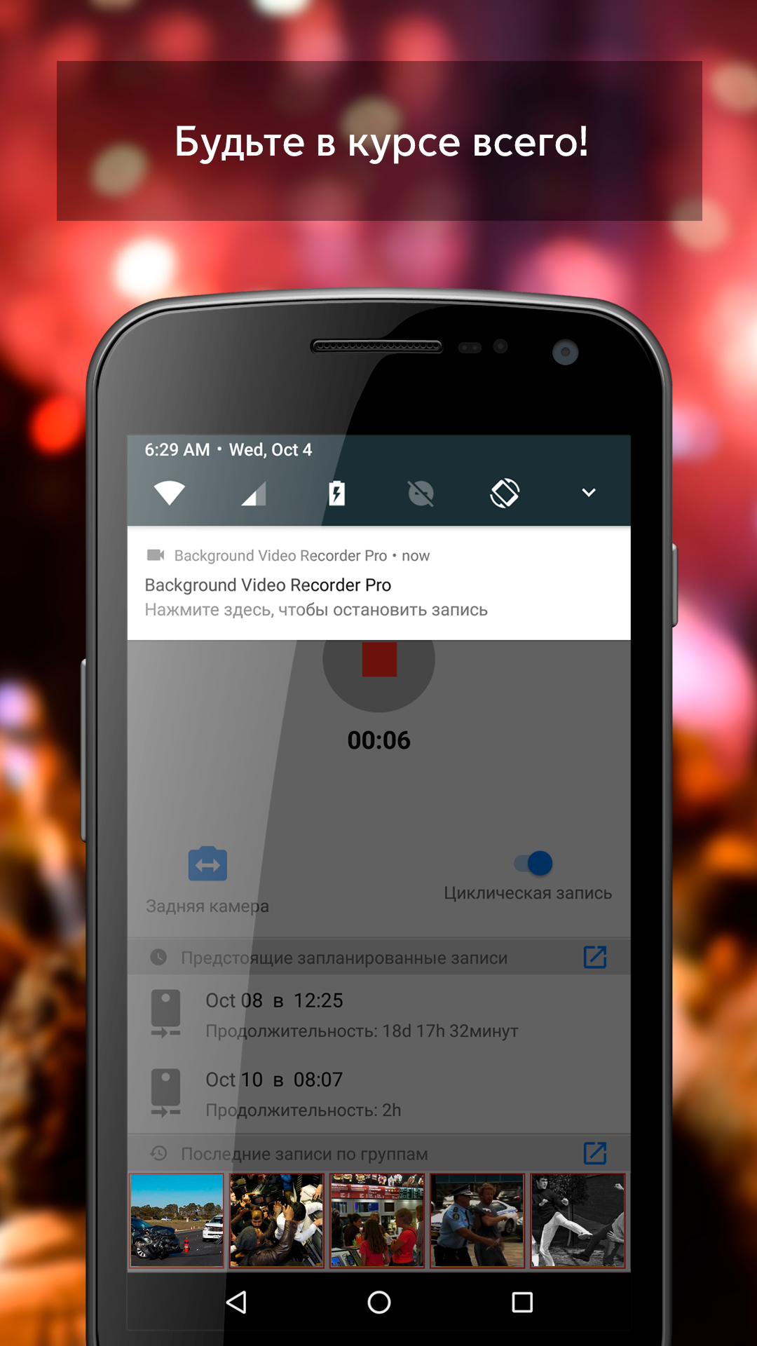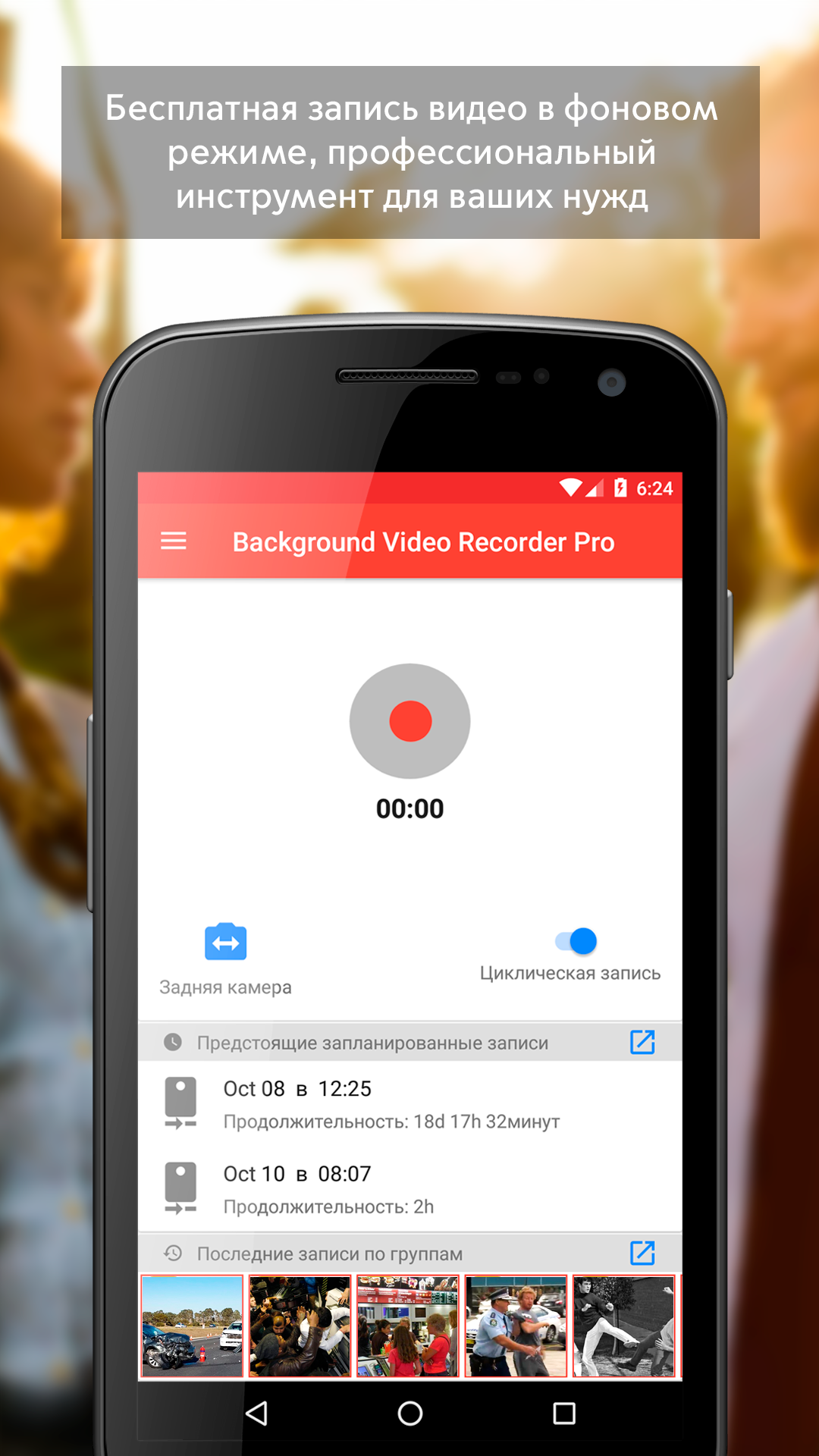 Простое приложение, которое позволяет записывать видео в фоновом режиме, даже когда телефон находится в режиме ожидания. Записывайте видео не только задней, но и фронтальной камерой. Запланируйте секретную запись & записывайте каждый момент на устройстве и автоматически загружайте все в CloudЗапустить фоновое видео вы можете с виджета на главном экране, c главного екрана приложения или даже по расписанию – вы решаете, когда видео начнется и закончится.
