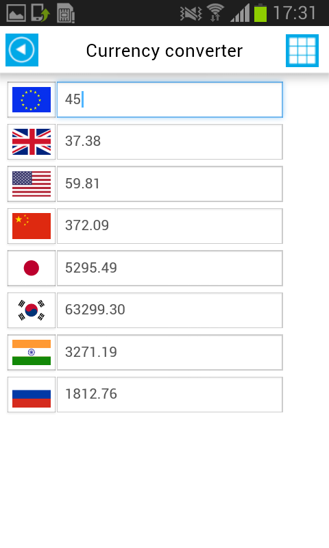 - Курс валют: евро, британский фунт, доллар США, китайские Youan, японская иена, корейский вон, рупия, русский рубль (Offline)