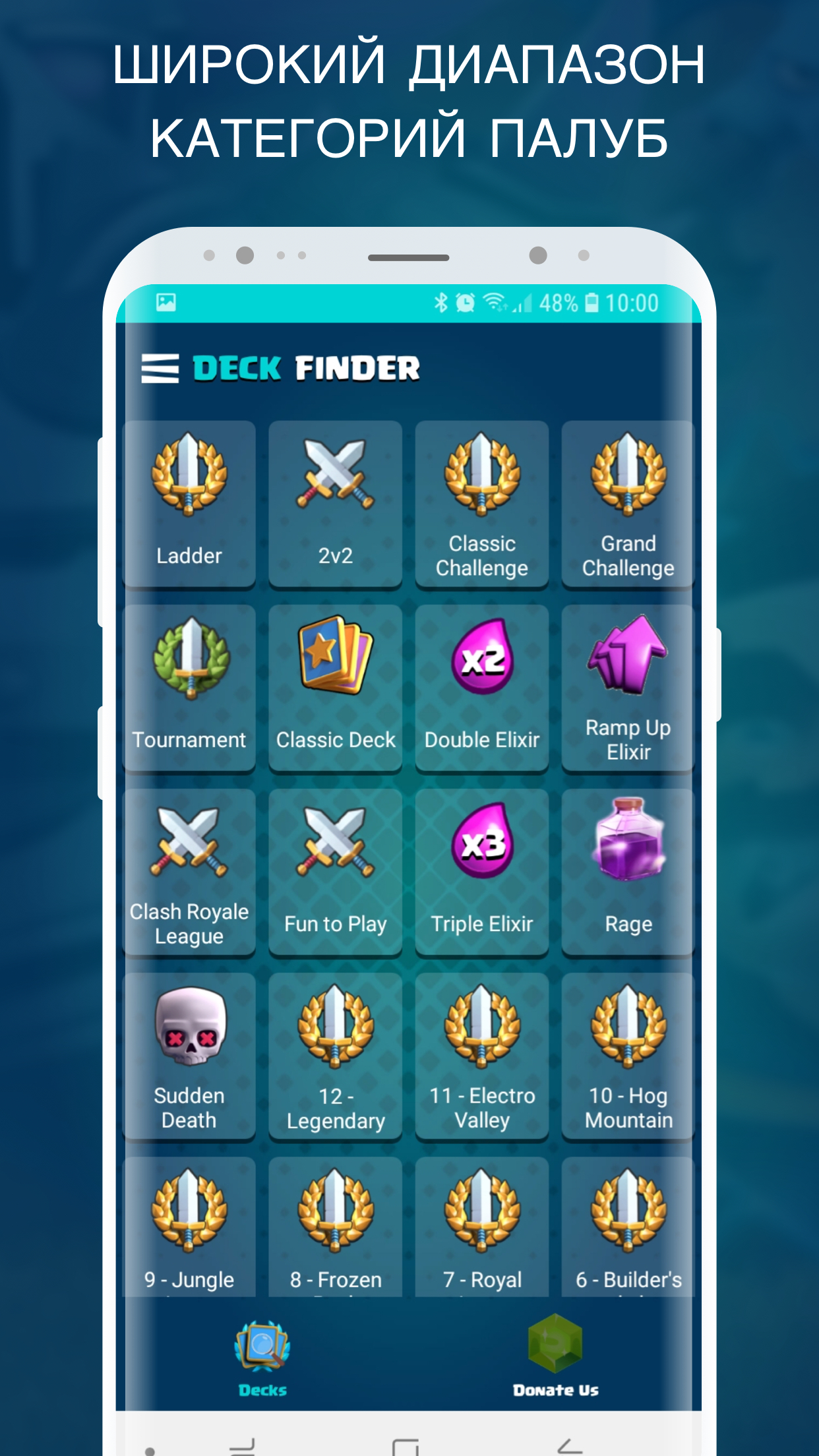 Устали играть одной и той же колодой снова и снова? В нашем приложении собраны лучшие колоды в зависимости от режима игры. Хотите выиграть вызов? Зайдите в приложение и ищите колоды с лучшим винрейтом, мы включаем колоды для всех арен, для глобальных турниров, для испытаний и многого другого. Приготовьтесь к битве!! Вот наш полный список функций: * Колоды для всех типов игровых режимов: Ярость, Двойной и Тройной Эликсир, Испытания, Глобальные турниры, Внезапная смерть, Повышение эликсира, Лестница, 2 на 2 и многое другое. * Мы будем отправлять вам уведомления, когда добавляем новые колоды * Приложение многоязычное * Предназначен для работы на любом устройстве с любой версией программного обеспечения. * Мы сделали его настолько быстрым и простым в использовании, что вы сможете играть в Clash Royale Challenges за считанные секунды! * Мы будем постоянно обновлять наше приложение, чтобы поддерживать более широкий спектр функций. … .И многое другое в ближайшее время! Скачать сейчас! Decks Royale для Clash Royale БЕСПЛАТНО в Play Store! Отказ от ответственности Этот контент не является аффилированным лицом, не одобрен, не спонсируется и не одобрен специально Supercell, и Supercell не несет за него ответственности. Для получения дополнительной информации см. Политику в отношении содержания фанатов Supercell: www.supercell.com/fan-content-policy.