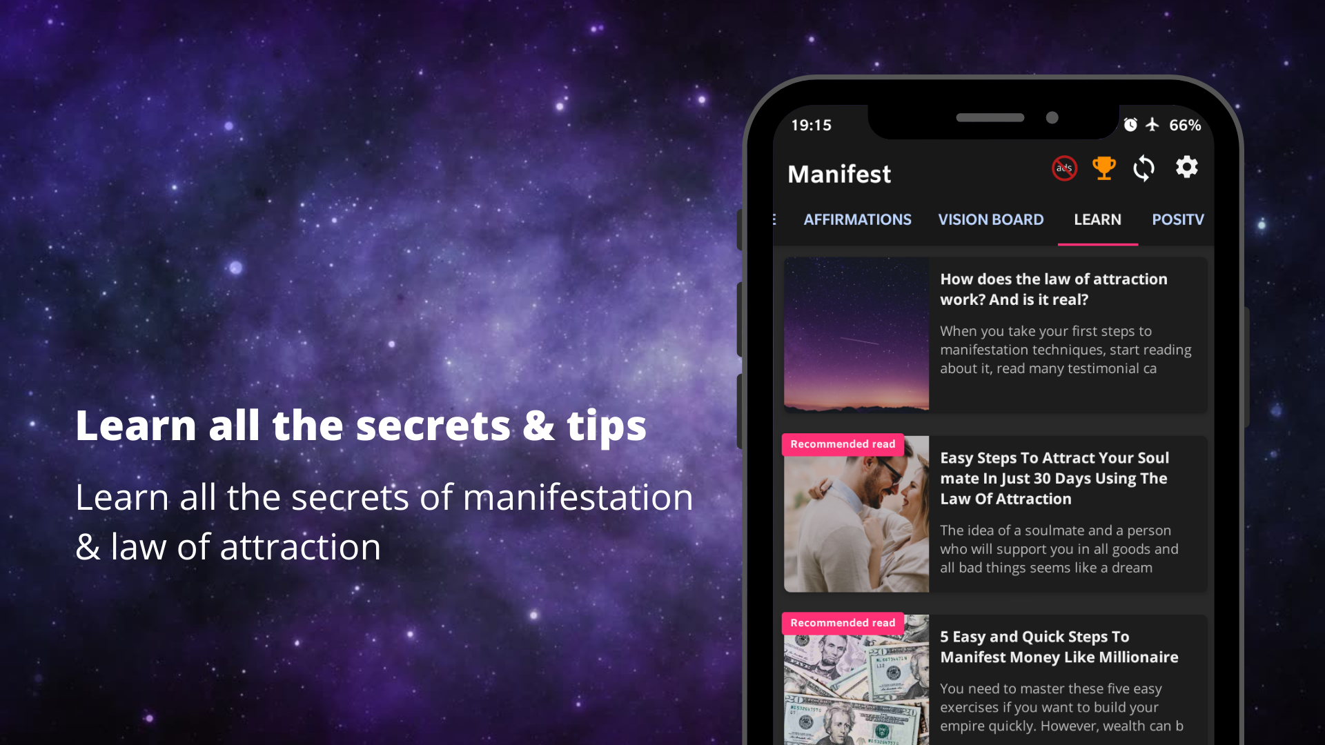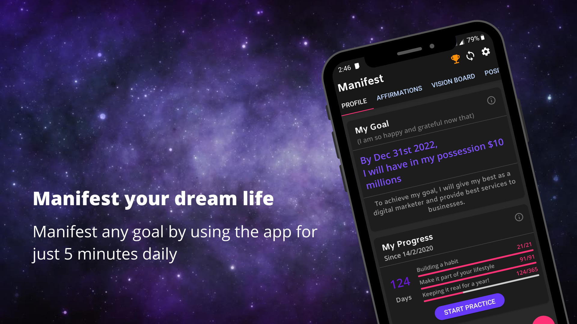 Use the Manifest app to apply the 'Law of attraction' every day using ‘The Secret' 🌟 and achieve any goal, dream, or desire.