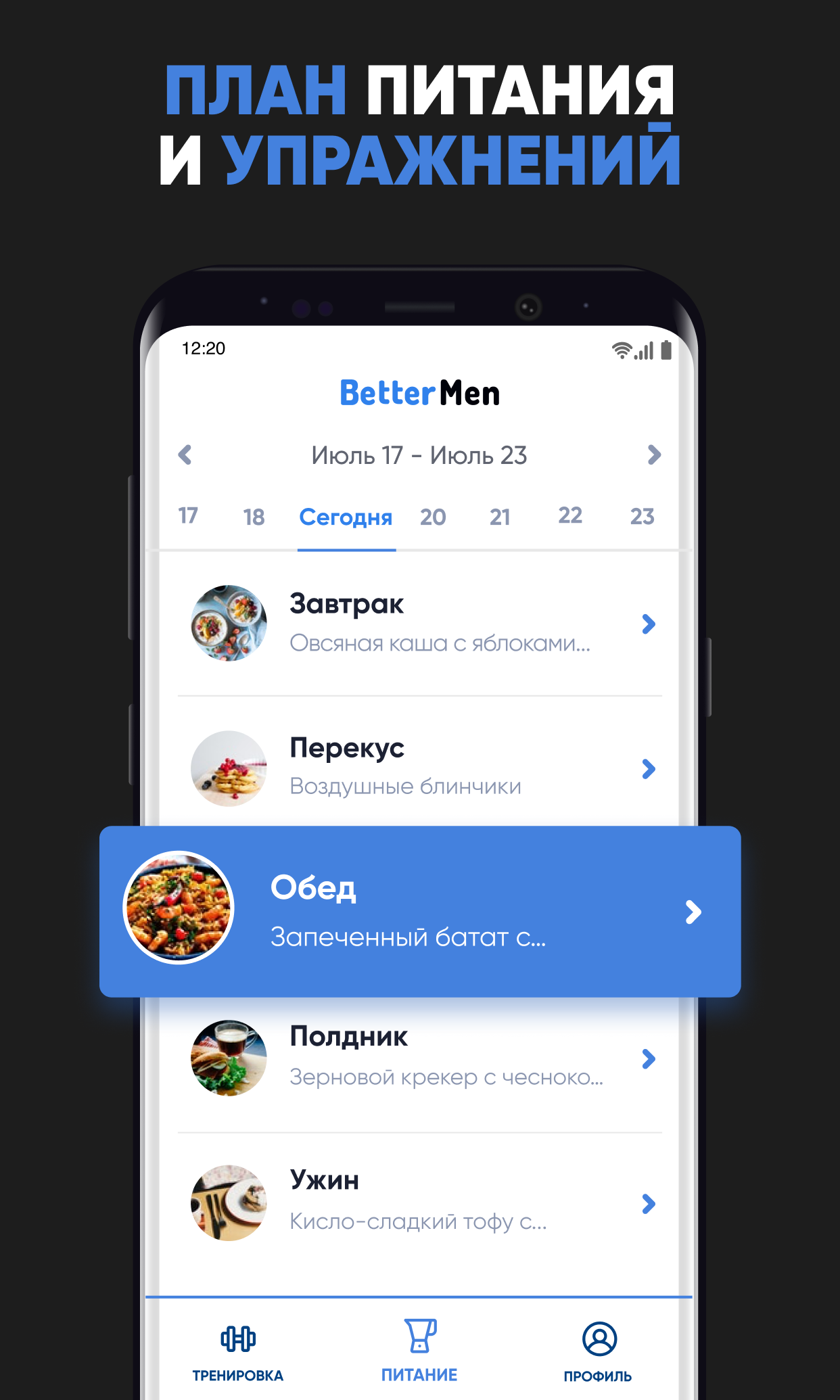 🥗 Приложение BetterMen предложит вам список сбалансированных и разумных планов питания, составленных с учетом ваших пищевых привычек и потребностей. Оно будет оказывать вам поддержку на каждом этапе трудного пути к созданию лучшей версии себя. Это будет выполнено следующим образом: