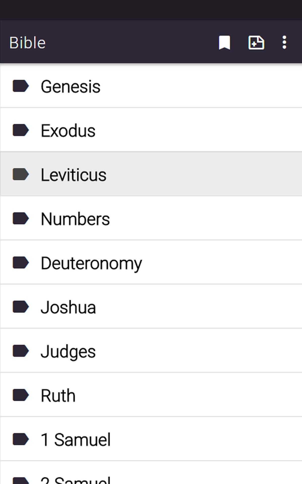 - Книги Закона (или Пятикнижия): Бытие, Исход, Левит, Числа, Второзаконие.