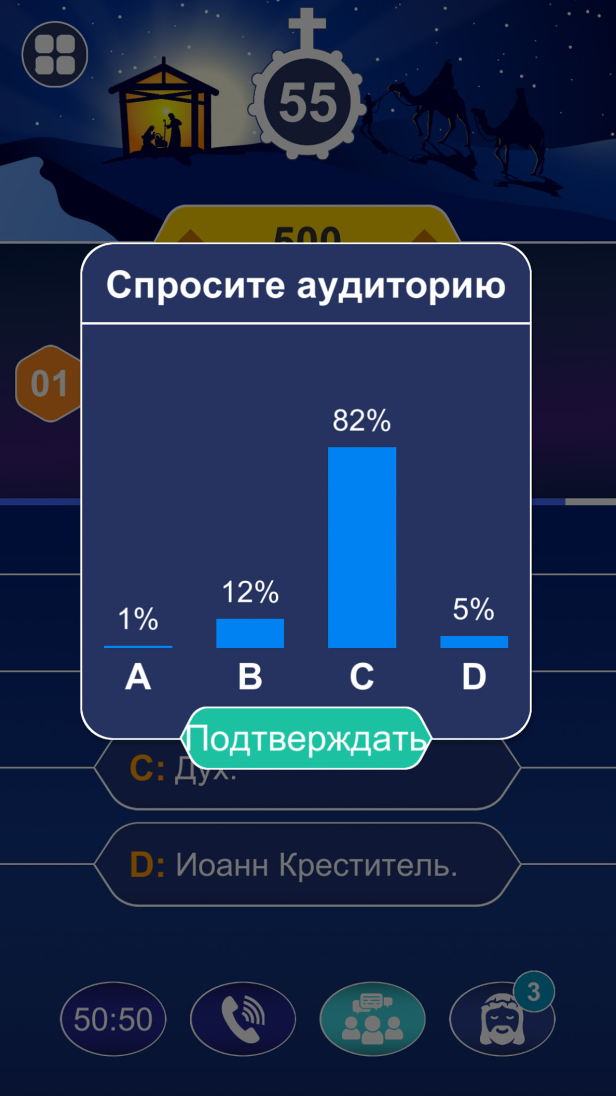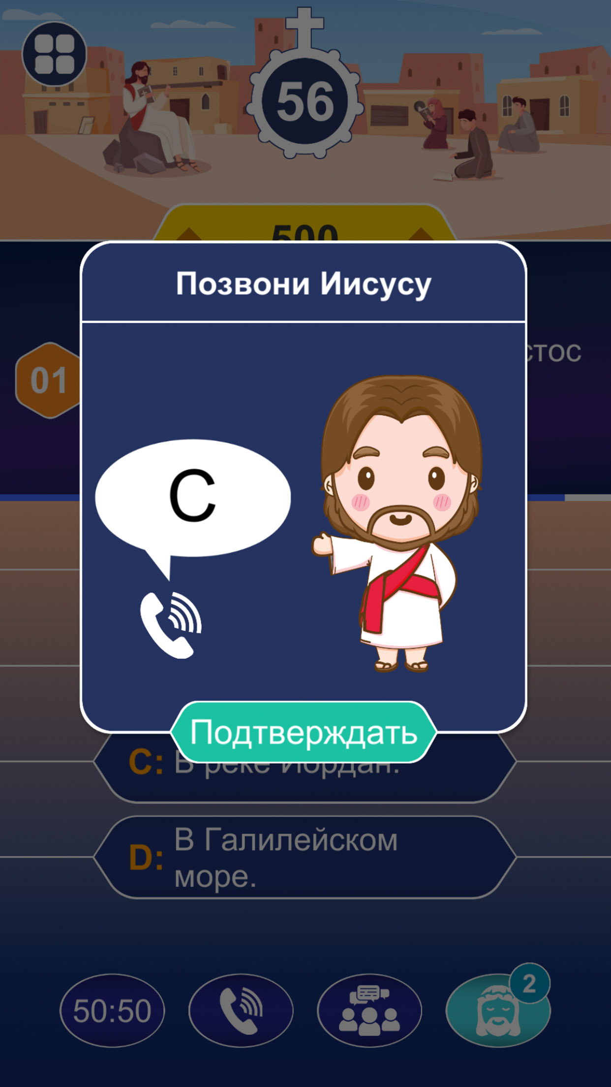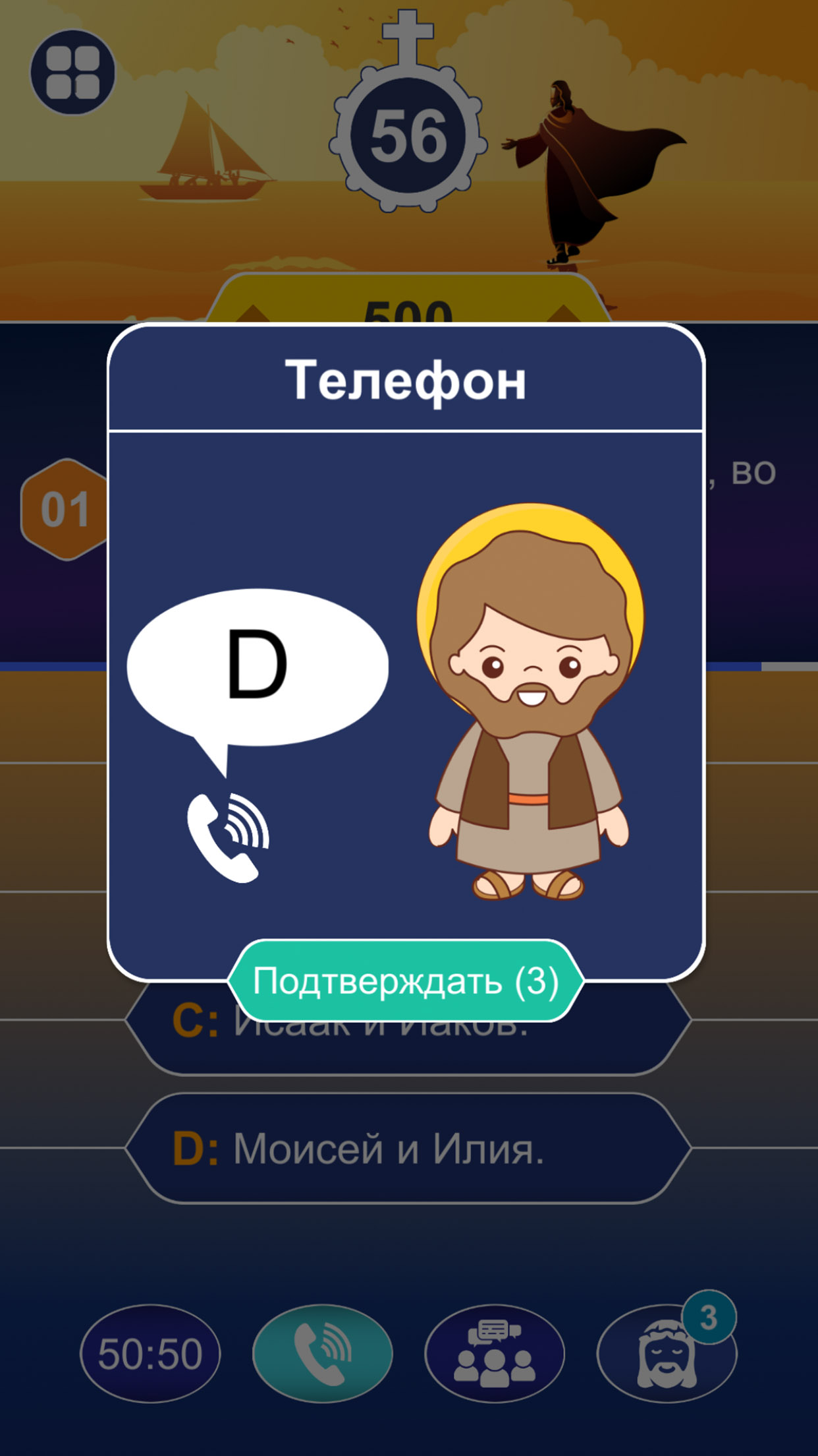 Если вы столкнулись с трудным библейским вопросом, вы можете воспользоваться справкой 50:50, посоветоваться с аудиторией или позвонить близкому человеку. Особенно знатоки Библии: Мария, Святой Иосиф, Святой Папа Иоанн Павел II и Иисус всегда здесь, чтобы помочь вам в вашей победе.