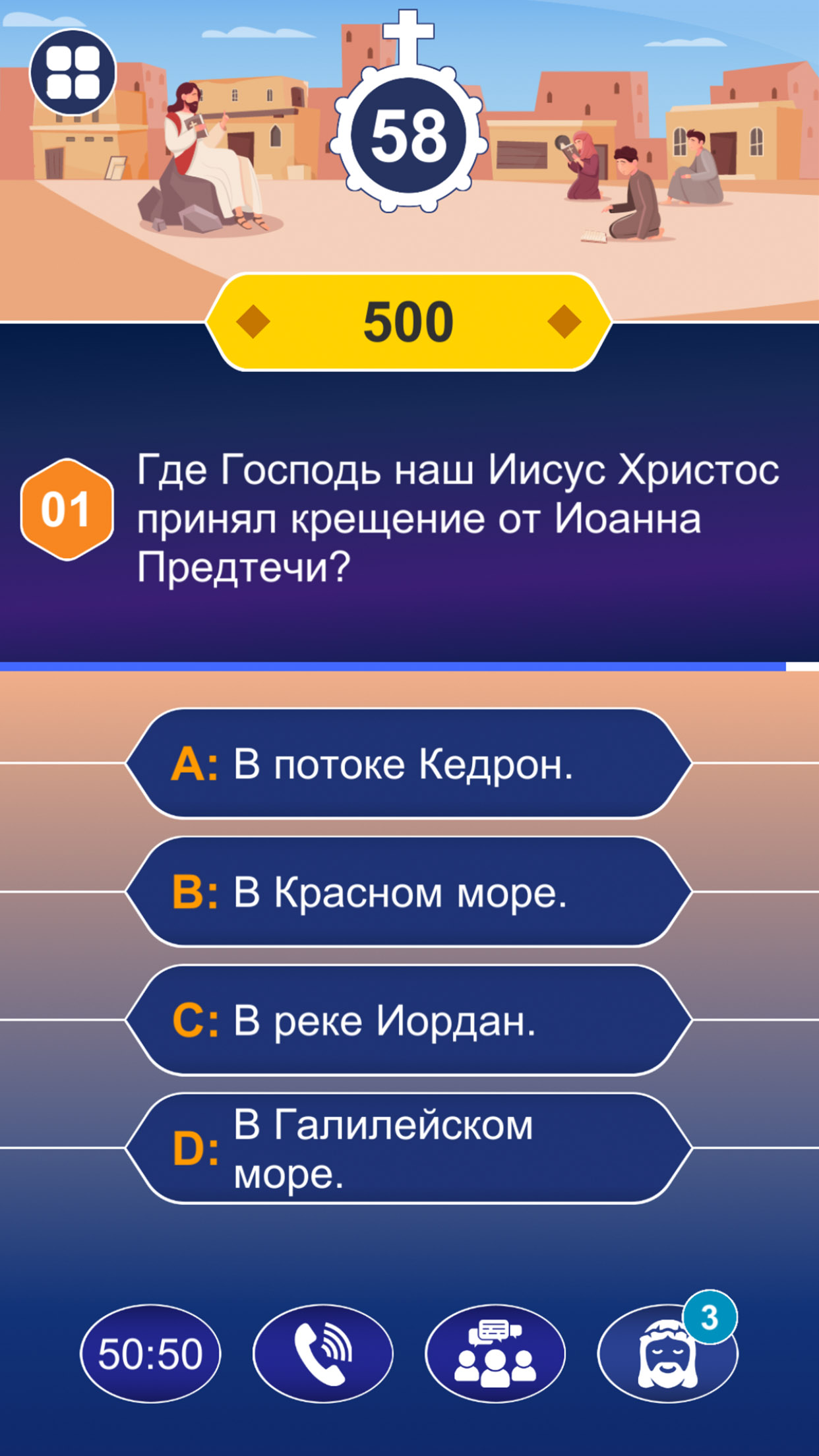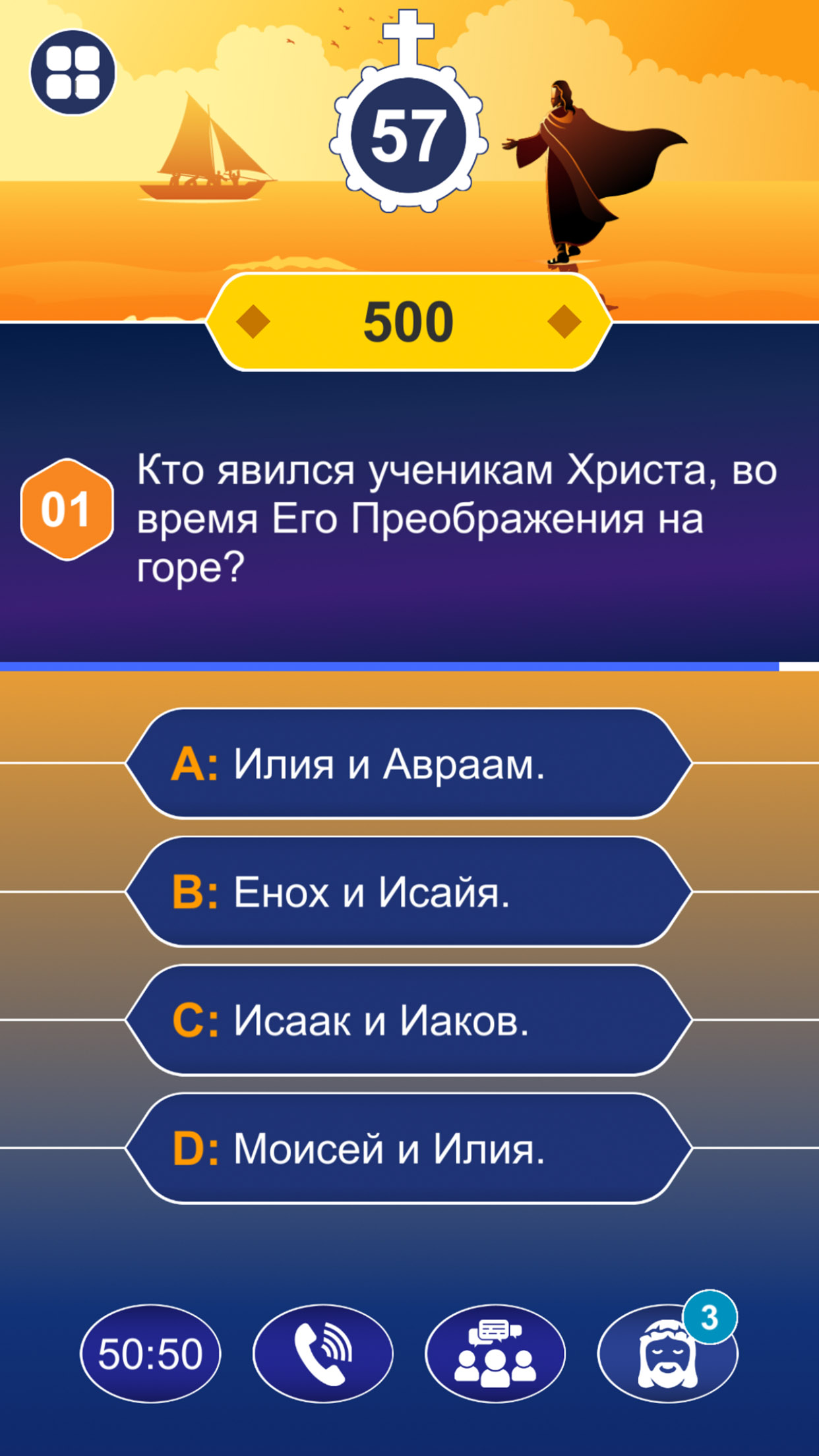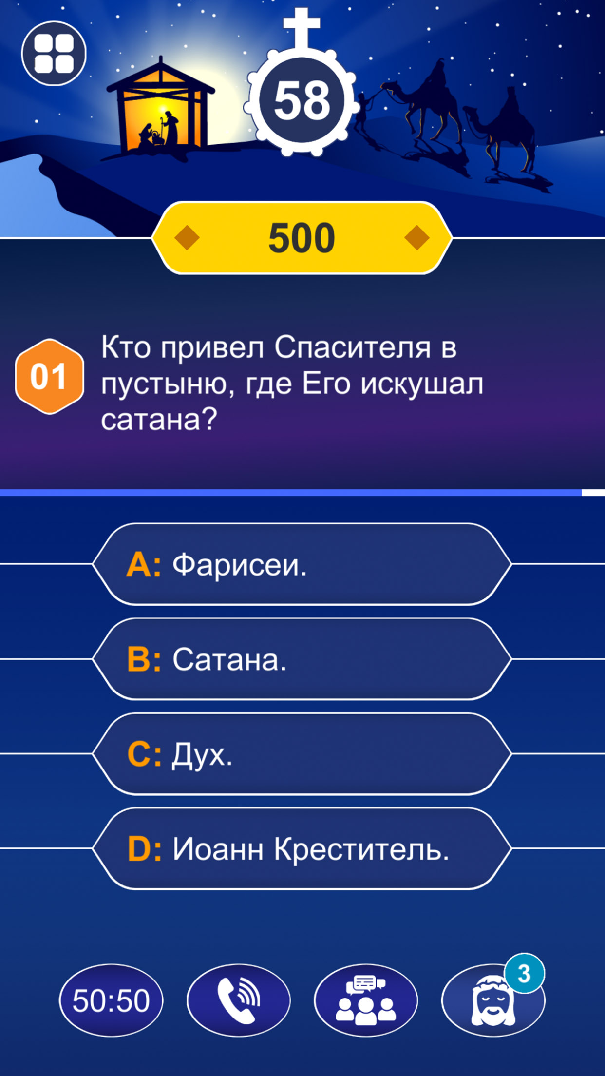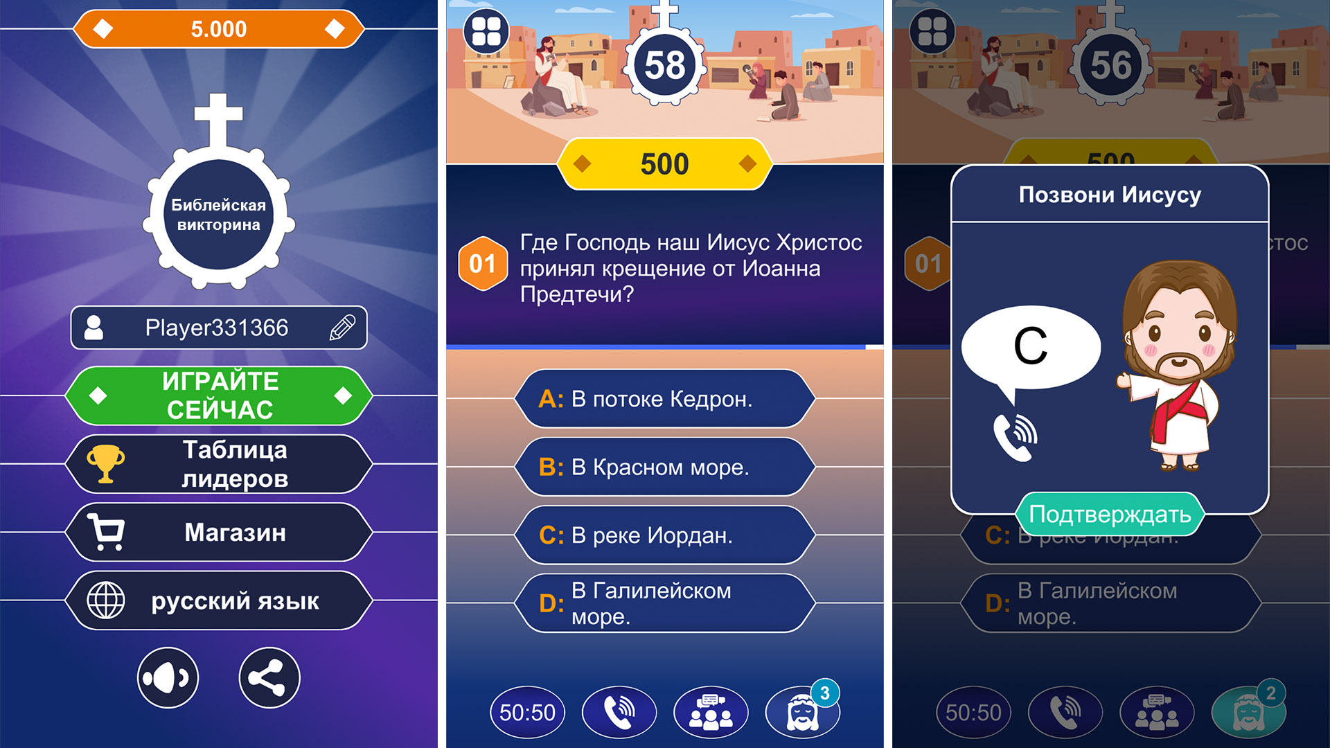 Если вы столкнулись с трудным библейским вопросом, вы можете воспользоваться справкой 50:50, посоветоваться с аудиторией или позвонить близкому человеку. Особенно знатоки Библии: Мария, Святой Иосиф, Святой Папа Иоанн Павел II и Иисус всегда здесь, чтобы помочь вам в вашей победе.