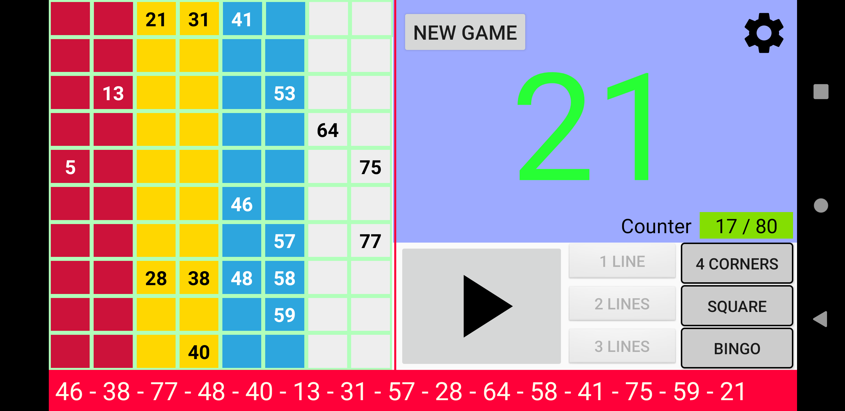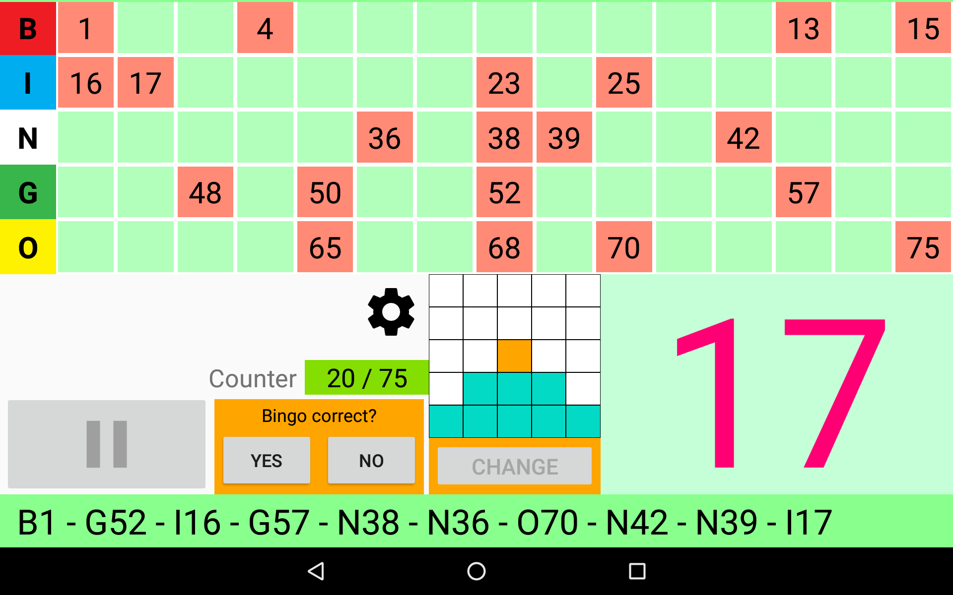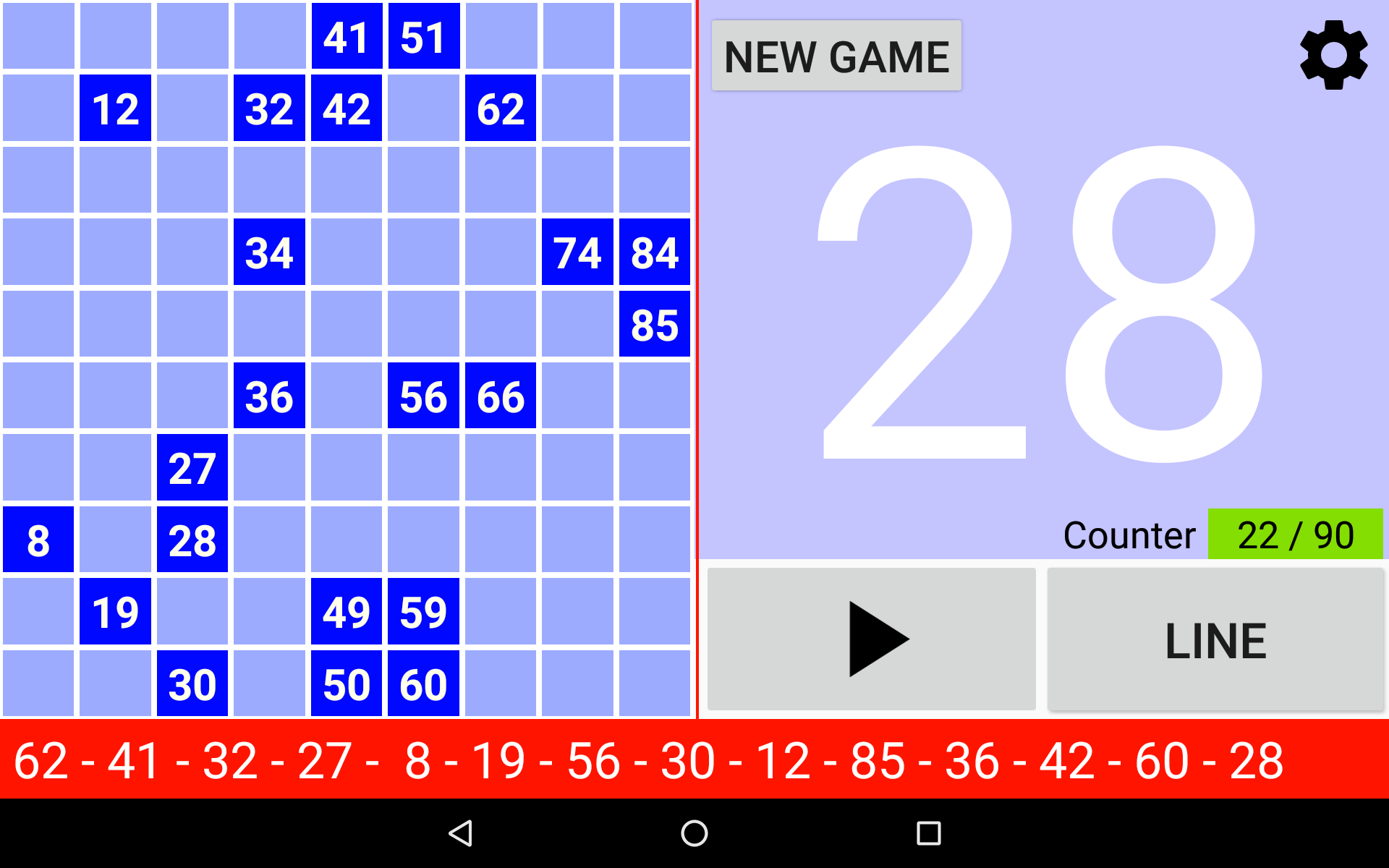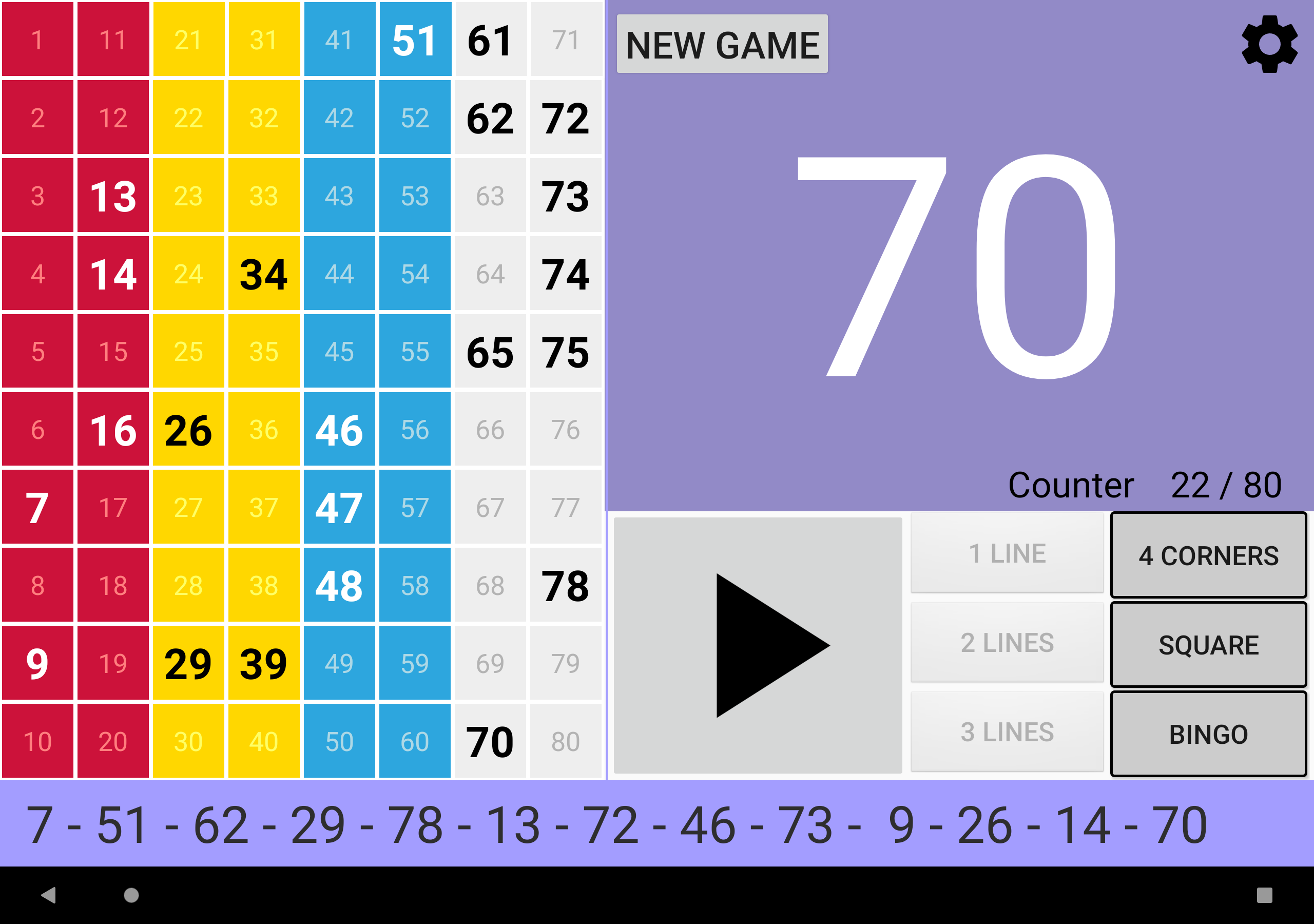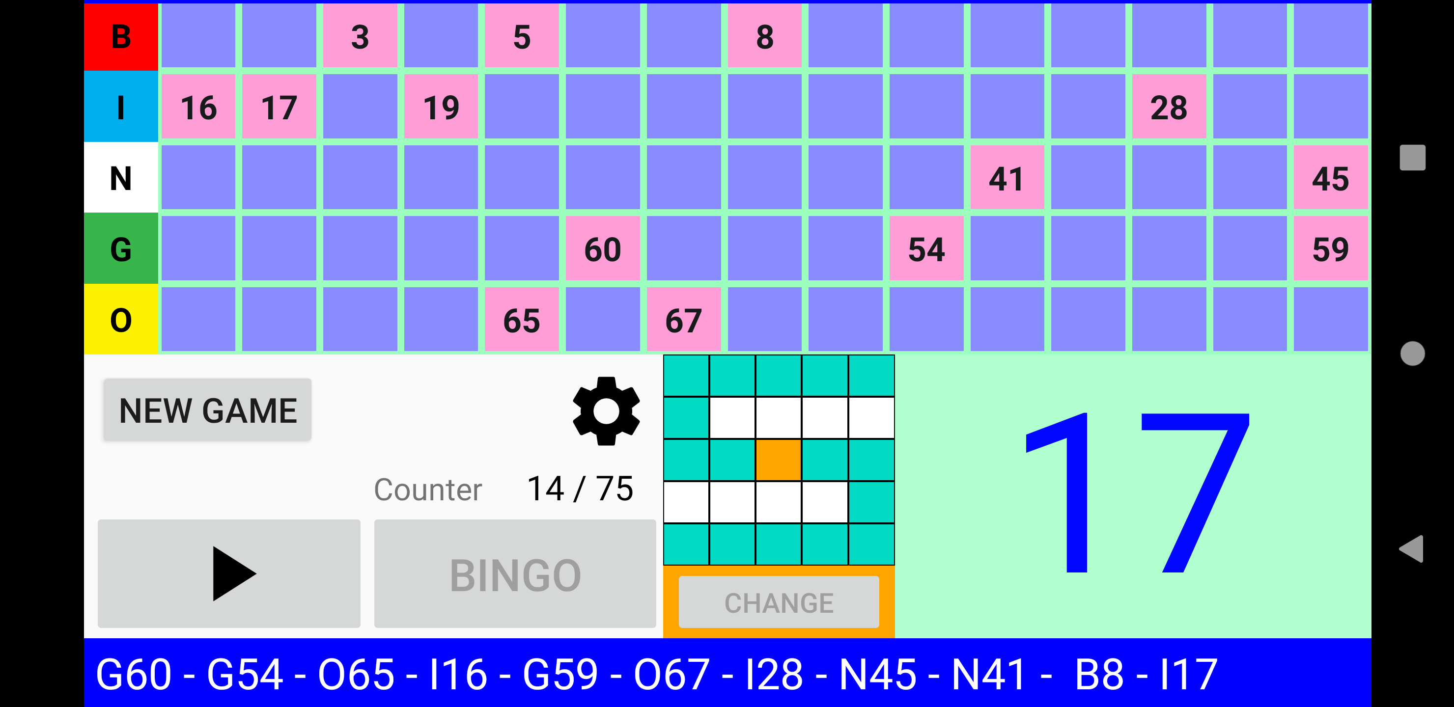 Простая, но мощная программа для вызова бинго. Четыре режима игры: 90 Ball Bingo, 80 Ball Bingo, 75 Ball Bingo и 30 Ball Bingo. Легко играйте с семьей или друзьями. Он работает на вашем планшете или телефоне. Большой размер номера для удобного просмотра. Распечатайте свои карты или используйте свое устройство в качестве карты с помощью приложения Bingo RS Cards, доступного в магазине Google Play, и начните веселье! Настраиваемые функции: ►Вы можете регулировать скорость автоматического извлечения шаров или извлекать шары вручную. ►Вы можете включать и выключать, чтобы звонить по номерам. ►Если вы включите звонки по номерам, вы сможете включать и выключать для звонков дополнительные звуки, например, при запуске игры или возобновлении игры. ►В 80 Ball Bingo, если включен вызов номеров, можно активировать и деактивировать вызов цветом столбца вызываемого номера. ►Если активированы дополнительные звуки, все сообщения можно настроить. ►Bingo RS можно настроить с вашими любимыми цветами. Попытайся! Или вы можете использовать цвета Bingo RS по умолчанию. ►Вы можете настроить визуальные эффекты появления номеров на панели для быстрой локализации: визуальный эффект текста и визуальный эффект фона набранного номера. ►Вы можете выбрать, будут ли отображаться все номера на панели, а набранный номер будет выделен, или будут отображаться только те номера, которые были вызваны. ►Вы можете выбрать, будет ли вызываемый номер выделен жирным шрифтом на панели. В 75 Ball Bingo вы также можете активировать и деактивировать визуальные эффекты букв БИНГО на панели: визуальный эффект буквы и визуальный эффект фона буквы, соответствующей вызываемому номеру. ►В конфигурации 75 Ball Bingo шаблонами можно управлять: можно добавлять, редактировать и удалять собственные шаблоны. ►Можно настроить отображение цветов в счетчике чисел. ►Вы можете выбрать, будет ли счетчик увеличиваться или уменьшаться. ►В 75 Ball Bingo вы можете выиграть, позвонив в Бинго и, при желании, позвонив по линии. ►В 75 Ball Bingo вы можете играть в случайном порядке или вручную. ►В Бинго на 80 шаров вы можете выиграть, позвонив в Бинго, а также, по выбору, набрав 1 линию, 2 линии, 3 линии, 4 угла или 4 номера в центре. ►В 30 Ball Bingo вы можете выиграть, вызвав бинго, а также, при желании, вызвав линию, столбец или диагональ. ►Возможность повторить набранный номер. ►Возможность звонить на двузначные номера один за другим. Например: 28 два-восемь. ►В Бинго на 75 шаров, если вы решите называть двузначные числа одно за другим, вы можете выбрать, следует ли называть букву B-I-N-G-O перед двумя числами. ►Возможность отображения обратного отсчета в секундах до розыгрыша следующего шара. Время отображается в числовом и графическом виде. Другие функции: ►Вы можете купить Премиум версию без рекламы. В любой игре зайдите в Настройки -> 3-кнопочное меню вверху справа -> Купить Премиум. ►Поддержка светлой и темной темы. ►Когда игра поставлена на паузу, вы можете прокручивать текст последних чисел влево и вправо, чтобы иметь возможность проверить все числа в игре в порядке их появления. ►В 75 Ball Bingo есть более 100 шаблонов на выбор. Каждая игра будет уникальной. ►Bingo RS использует механизм синтеза речи Google. Если на языке устройства доступно несколько голосов, выберите свой любимый голос, и Bingo RS будет использовать его. ►Можно выбрать голос, отличный от голоса устройства. ПРИМЕЧАНИ