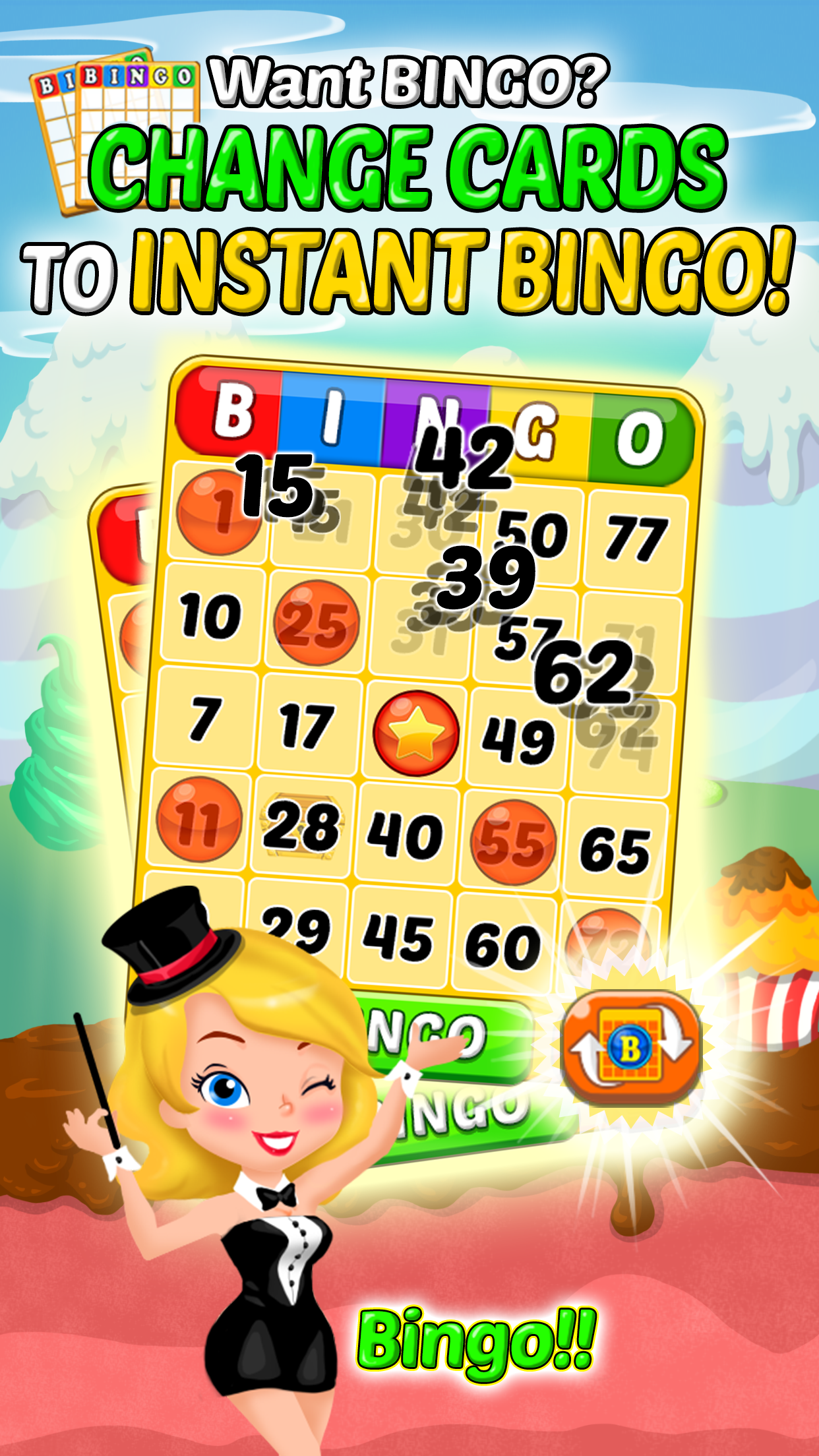- Having no luck on getting a BINGO? Now you can change your card during play for getting a better chance to get INSTANT BINGO!
