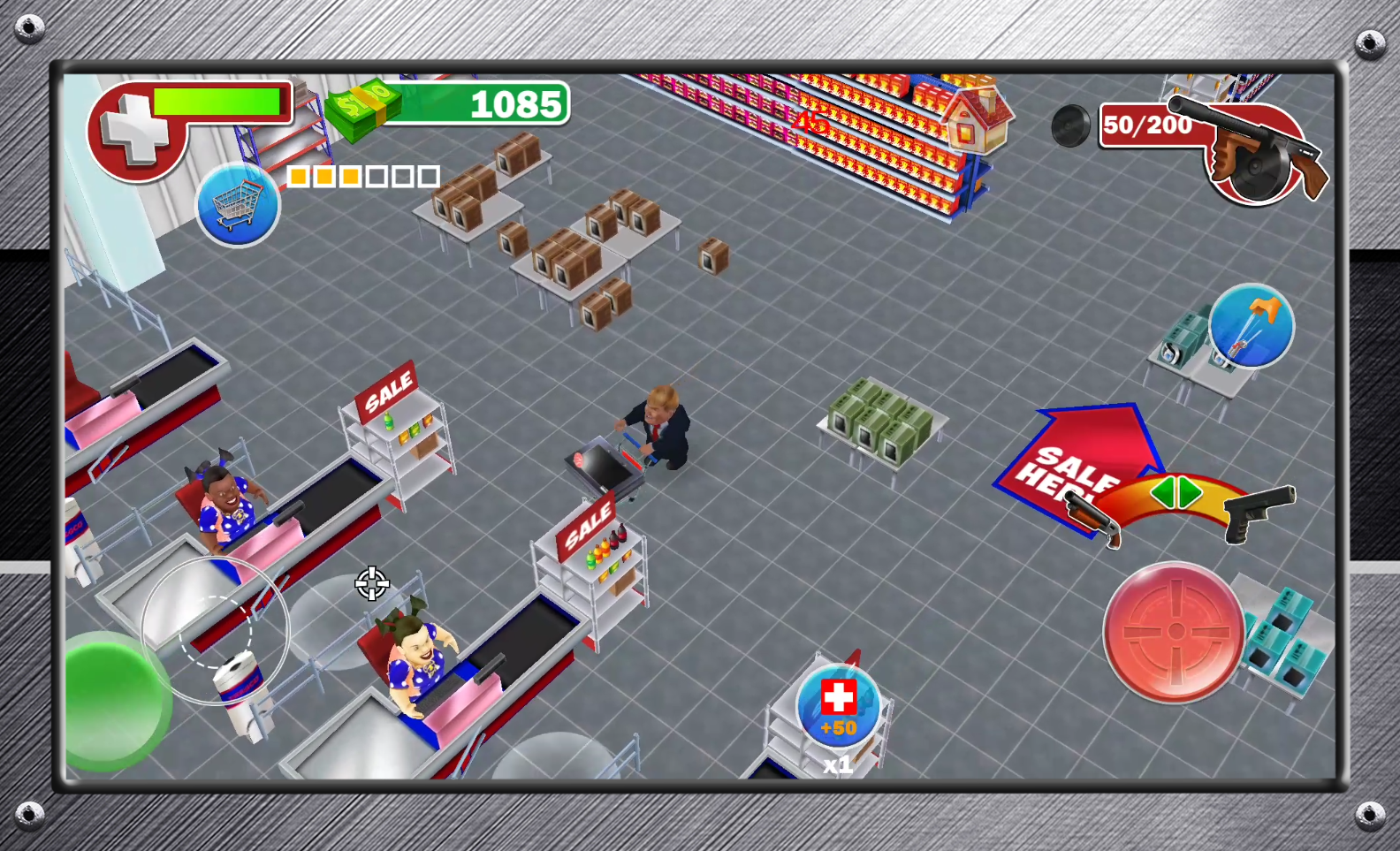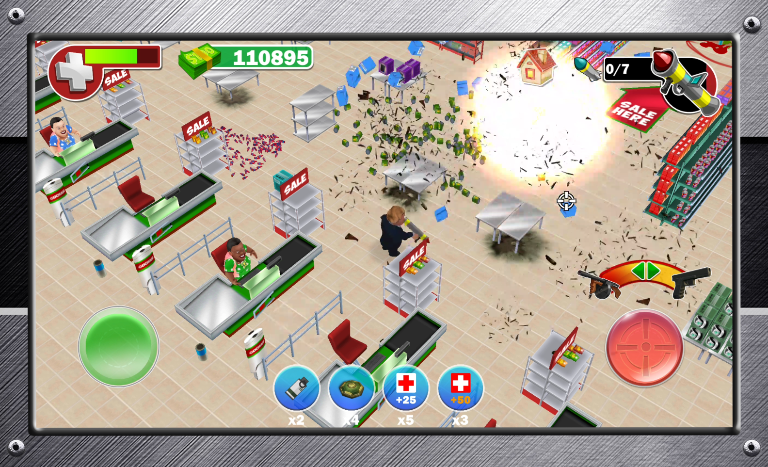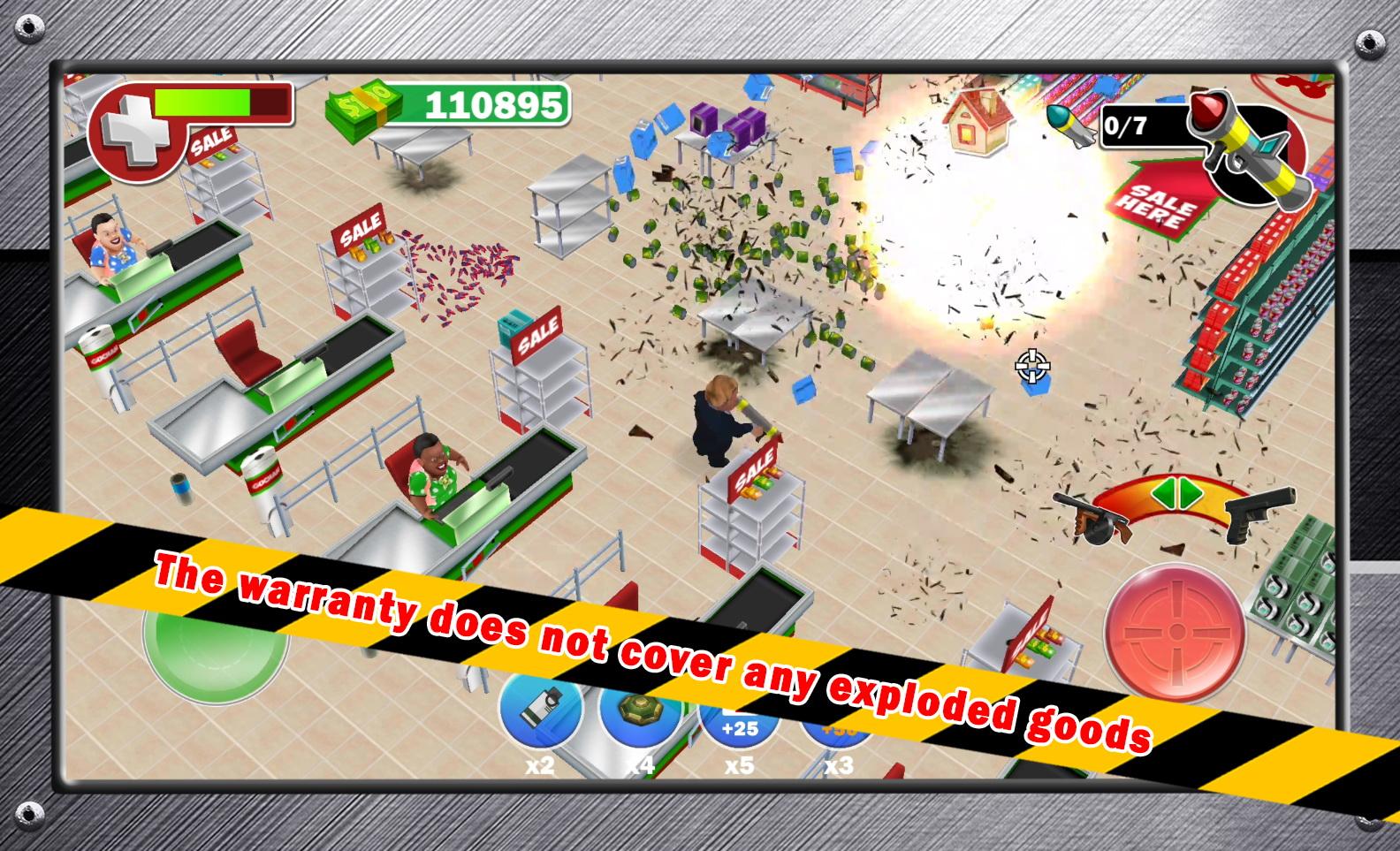 Попробуй новую потрясающую, остросоциальную трэш-мясную игру, которая увлечет тебя своим смешным сценарием и заставит посмотреть на мир покупок по другому! Недалекое будущее. Всемирно известные распродажи вышли на новый уровень. Теперь в магазинах нет никаких правил, теперь магазины превратились в места, где деньги не тратят, а зарабатывают. Борьба за скидки достигла новых кровавых масштабов. Теперь здесь не действуют привычные нам законы, теперь прав тот, кто сильнее, и у кого больше пушка. Вырви самую большую скидку, продай товар и заработай миллионы! ВНИМАНИЕ!!! Игра корректно работает только на телефонах имеющих не менее 1024мб оперативной памяти.