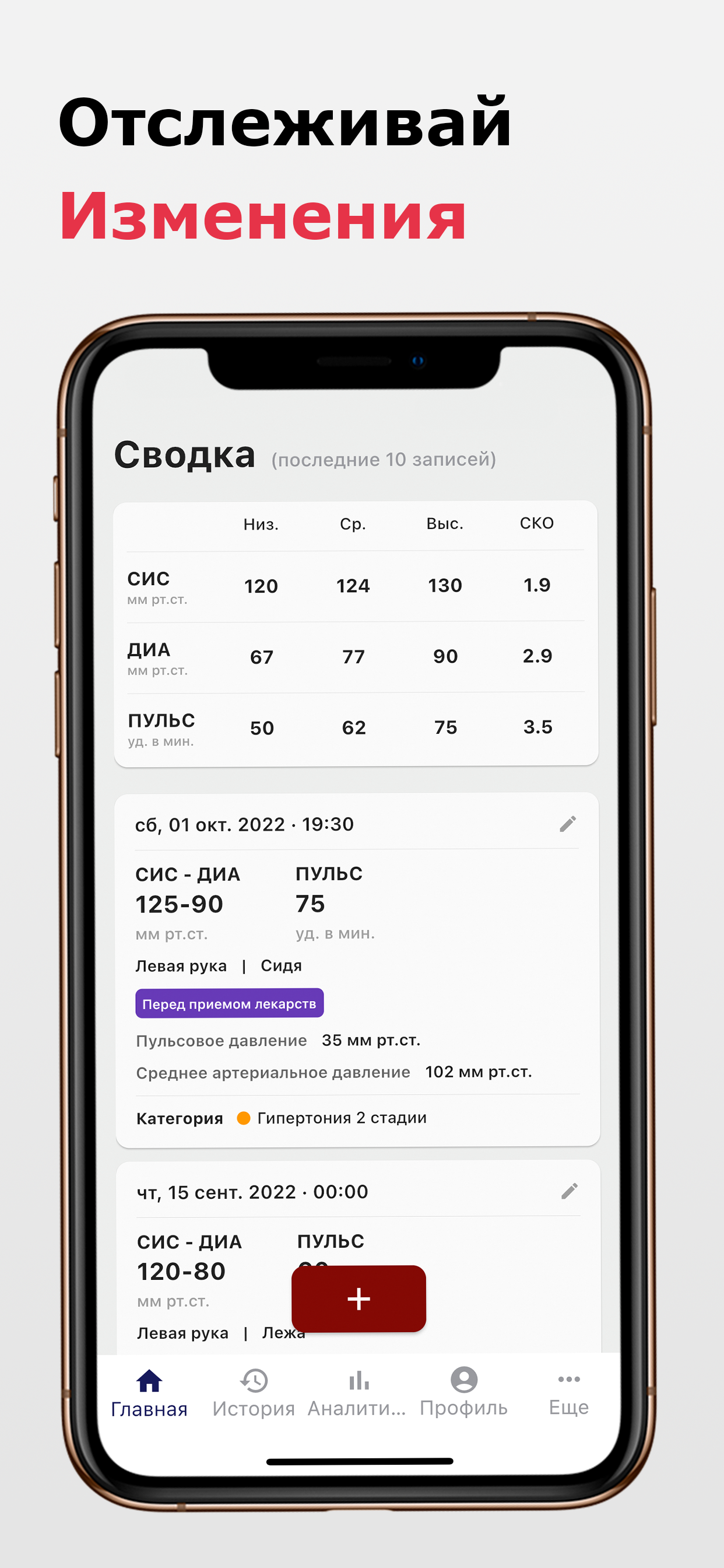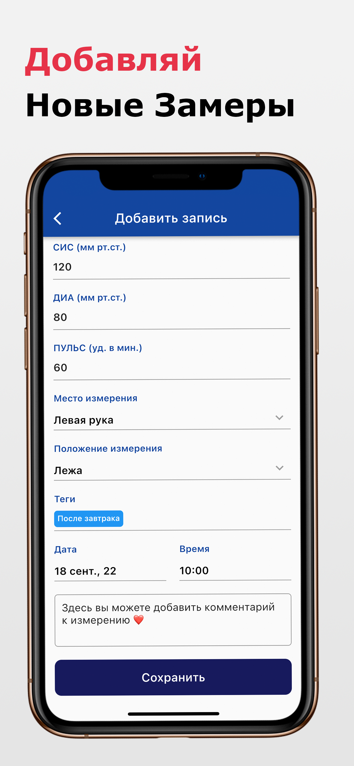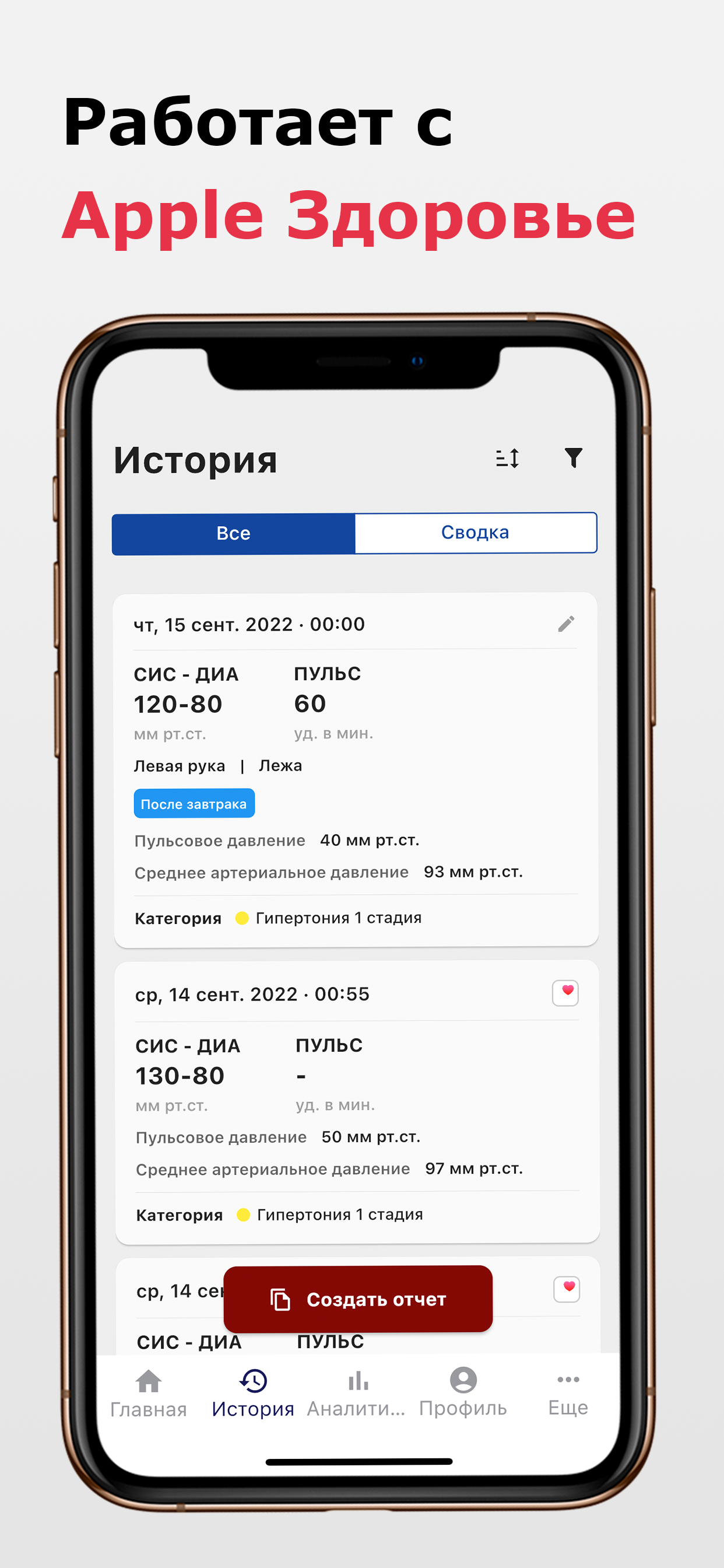 Как вам поможет наше приложение: 💖 С легкостью записывайте свое артериальное давление и пульс 🔎 Наблюдайте тенденции в ваших результатах 🏷️ Добавляйте метки и теги 🔔 Устанавливайте напоминания для измерения артериального давления ✨ Моментальная классификация результата замера артериального давления (например, низкое, нормальное или гипертония) ⚖️ Моментальный расчет пульсового давления и среднего артериального давления 📖 Создавайте и экспортируйте отчеты в формате PDF с данными о кровяном давлении и пульсе. 📊 Экспортируйте свои данные в формате .CSV · Все еще следите за своими показаниями кровяного давления на бумаге? · Вам интересно, находится ли ваше кровяное давление в пределах нормы? · Хотите обнаружить тенденции в вашем кровяном давлении? · Не знаете, как показать врачу изменения артериального давления? Используйте наше приложение Дневник Давления и Пульса, чтобы помочь вам в этом! Функции приложения: ✨ Сохраняйте, редактируйте или обновляйте показания Вы можете добавлять и сохранять систолическое, диастолическое, частоту сердцебиения (пульса), информацию об измерение (место измерения, позиция измерения), метки (например, перед сном), дополнительные примечания, а также дату и время измерения. ✨ Знайте свое состояние артериального давления Если вы не уверены, к какой зоне артериального давления относится ваш результат, вы можете найти надежные и автоматически рассчитанные ответы на основе рекомендаций AHA / ACC, рекомендаций ESC / ESH, а также вы можете установить свои собственные пользовательские категории. В дополнение к этому вы также можете проверить пульсовое давление и среднее артериальное давление, которые рассчитываются автоматически. ✨ Смотреть долгосрочные тенденции и анализ У вас есть тонометр который не может отслеживать все показания? С помощью наших интерактивных диаграмм вы можете просматривать изменения в ваших измерениях АД и сравнивать значения за разные периоды времени. Более того, вы можете сортировать показания по систолическому, диастолическому, пульсовому и дате как по возрастанию, так и по убыванию. Вы также можете отфильтровать показания артериального давления по дате, месту измерения, положению измерения или тегам. ✨ Используйте несколько профилей для всей семьи Теперь вам нужно только одно приложение для всей вашей семьи. Вы можете создать несколько профилей и легко переключаться между ними в одном приложении/устройстве. ✨ Не забудьте снова измерить давление Настройте напоминания об измерение артериального давления в соответствии с вашими потребностями и никогда не пропускайте измерения. Загрузите сейчас и управляйте своим артериальным давлением и пульсом наилучшим образом! Следующие тонометры могут подключаться к HealthKit (проверьте совместимость с разными моделями): - A&D - Omron (Омрон) - iHealth - QardioArm - Withings Примечание. Это приложение служит дополнительным приложением и НЕ измеряет артериальное давление или пульс. Никакое приложение не может заменить профессиональные медицинские измерительные приборы. Таким образом, чтобы быть ответственным за свое здоровье, пожалуйста, используйте одобренный FDA тонометр для надежного измерения артериального давления.