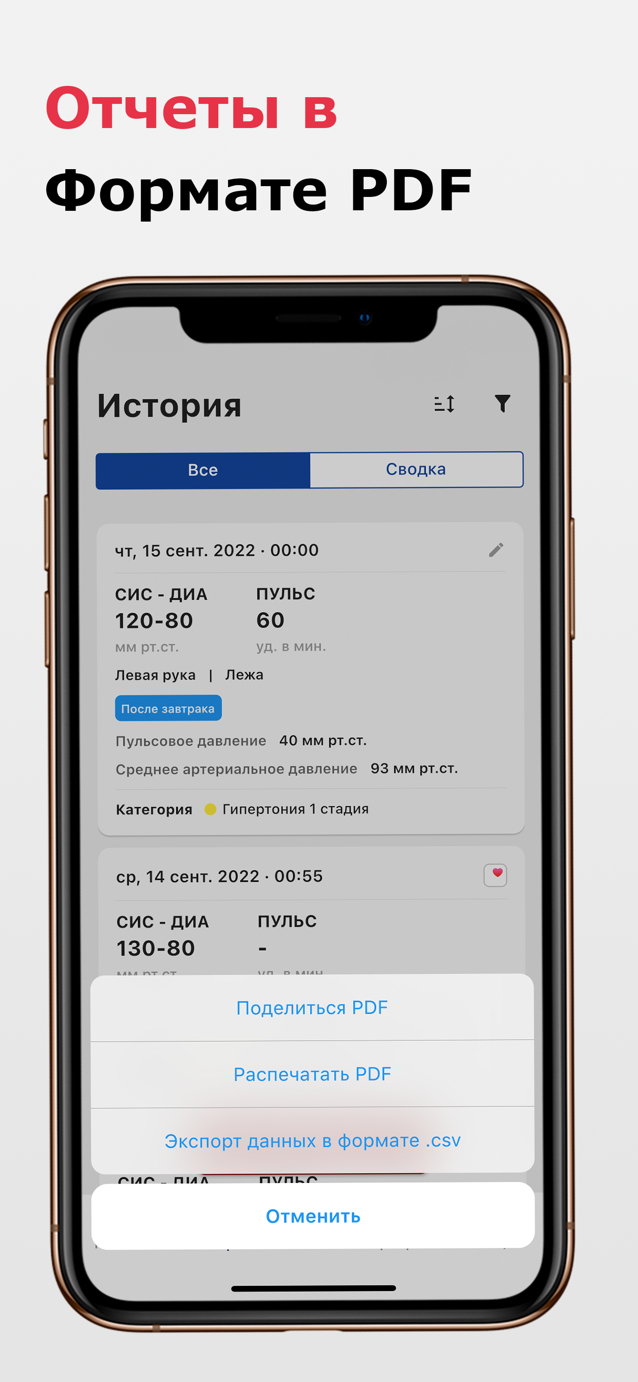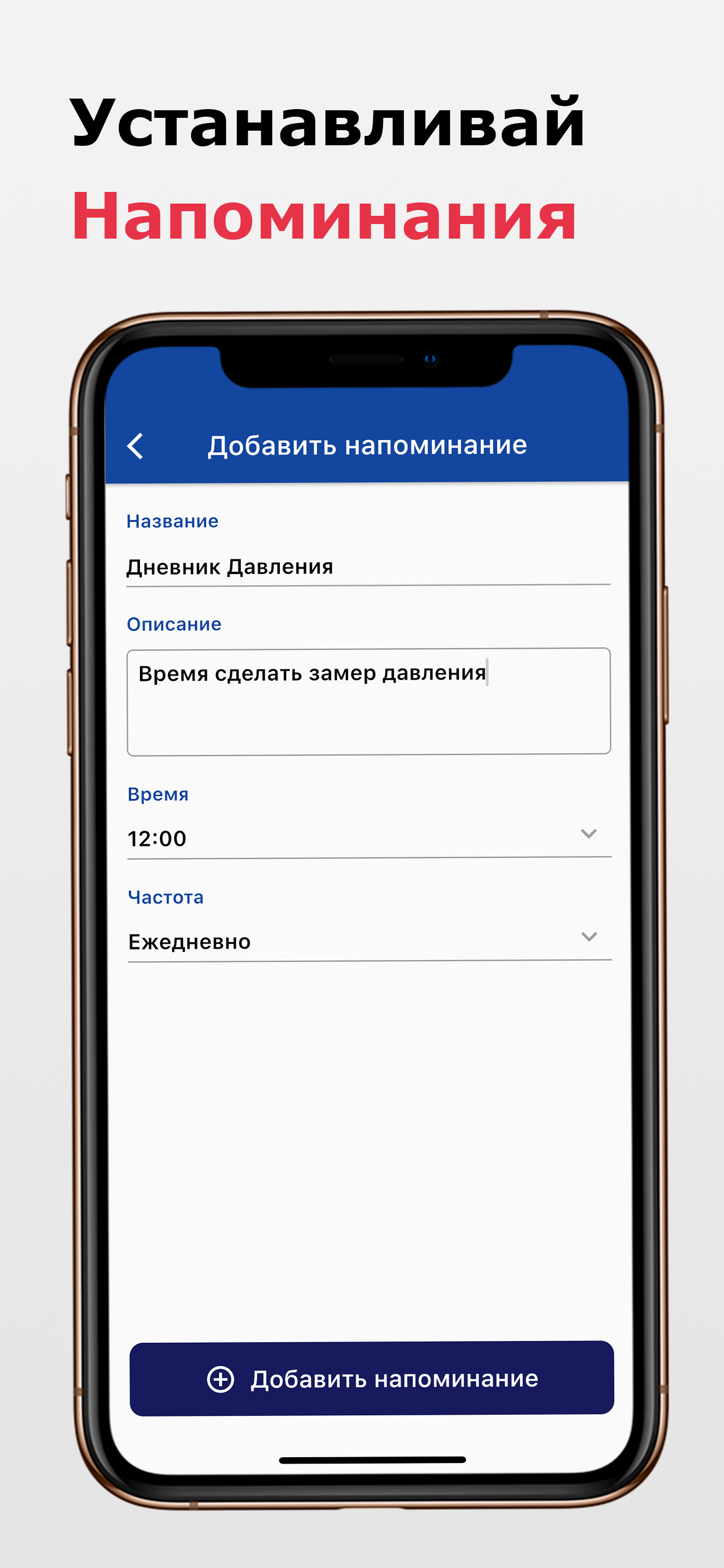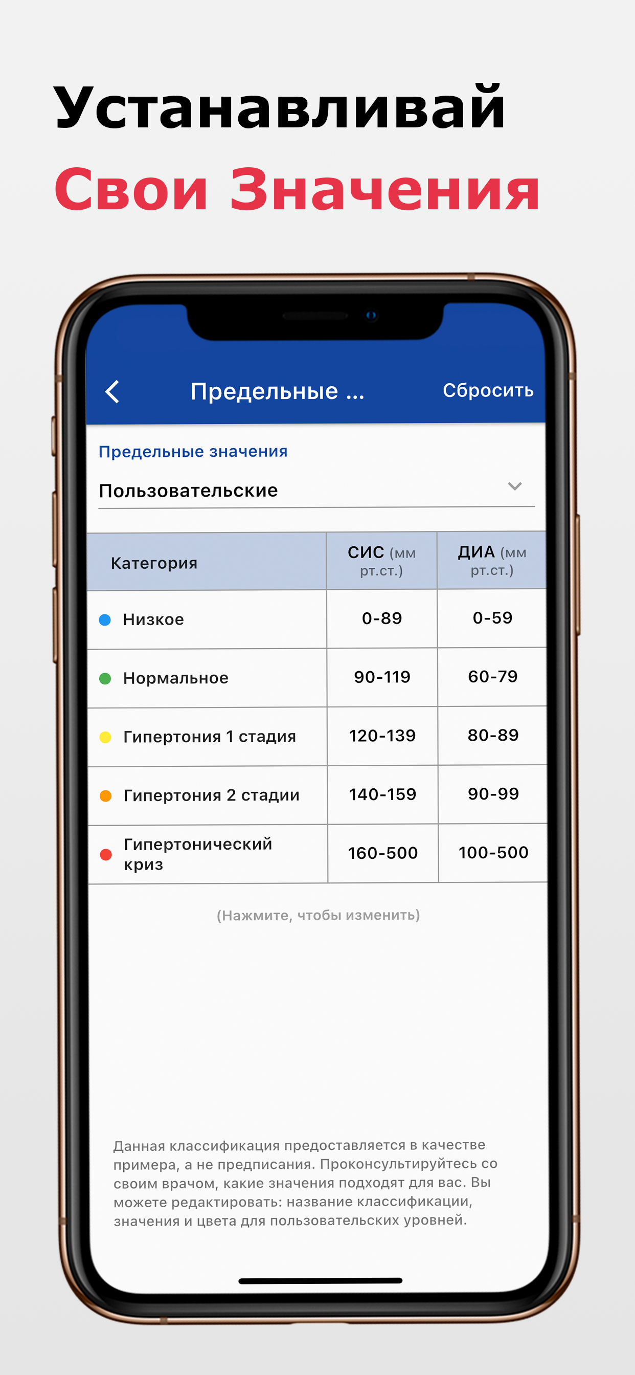 Как вам поможет наше приложение: 💖 С легкостью записывайте свое артериальное давление и пульс 🔎 Наблюдайте тенденции в ваших результатах 🏷️ Добавляйте метки и теги 🔔 Устанавливайте напоминания для измерения артериального давления ✨ Моментальная классификация результата замера артериального давления (например, низкое, нормальное или гипертония) ⚖️ Моментальный расчет пульсового давления и среднего артериального давления 📖 Создавайте и экспортируйте отчеты в формате PDF с данными о кровяном давлении и пульсе. 📊 Экспортируйте свои данные в формате .CSV · Все еще следите за своими показаниями кровяного давления на бумаге? · Вам интересно, находится ли ваше кровяное давление в пределах нормы? · Хотите обнаружить тенденции в вашем кровяном давлении? · Не знаете, как показать врачу изменения артериального давления? Используйте наше приложение Дневник Давления и Пульса, чтобы помочь вам в этом! Функции приложения: ✨ Сохраняйте, редактируйте или обновляйте показания Вы можете добавлять и сохранять систолическое, диастолическое, частоту сердцебиения (пульса), информацию об измерение (место измерения, позиция измерения), метки (например, перед сном), дополнительные примечания, а также дату и время измерения. ✨ Знайте свое состояние артериального давления Если вы не уверены, к какой зоне артериального давления относится ваш результат, вы можете найти надежные и автоматически рассчитанные ответы на основе рекомендаций AHA / ACC, рекомендаций ESC / ESH, а также вы можете установить свои собственные пользовательские категории. В дополнение к этому вы также можете проверить пульсовое давление и среднее артериальное давление, которые рассчитываются автоматически. ✨ Смотреть долгосрочные тенденции и анализ У вас есть тонометр который не может отслеживать все показания? С помощью наших интерактивных диаграмм вы можете просматривать изменения в ваших измерениях АД и сравнивать значения за разные периоды времени. Более того, вы можете сортировать показания по систолическому, диастолическому, пульсовому и дате как по возрастанию, так и по убыванию. Вы также можете отфильтровать показания артериального давления по дате, месту измерения, положению измерения или тегам. ✨ Используйте несколько профилей для всей семьи Теперь вам нужно только одно приложение для всей вашей семьи. Вы можете создать несколько профилей и легко переключаться между ними в одном приложении/устройстве. ✨ Не забудьте снова измерить давление Настройте напоминания об измерение артериального давления в соответствии с вашими потребностями и никогда не пропускайте измерения. Загрузите сейчас и управляйте своим артериальным давлением и пульсом наилучшим образом! Следующие тонометры могут подключаться к HealthKit (проверьте совместимость с разными моделями): - A&D - Omron (Омрон) - iHealth - QardioArm - Withings Примечание. Это приложение служит дополнительным приложением и НЕ измеряет артериальное давление или пульс. Никакое приложение не может заменить профессиональные медицинские измерительные приборы. Таким образом, чтобы быть ответственным за свое здоровье, пожалуйста, используйте одобренный FDA тонометр для надежного измерения артериального давления.