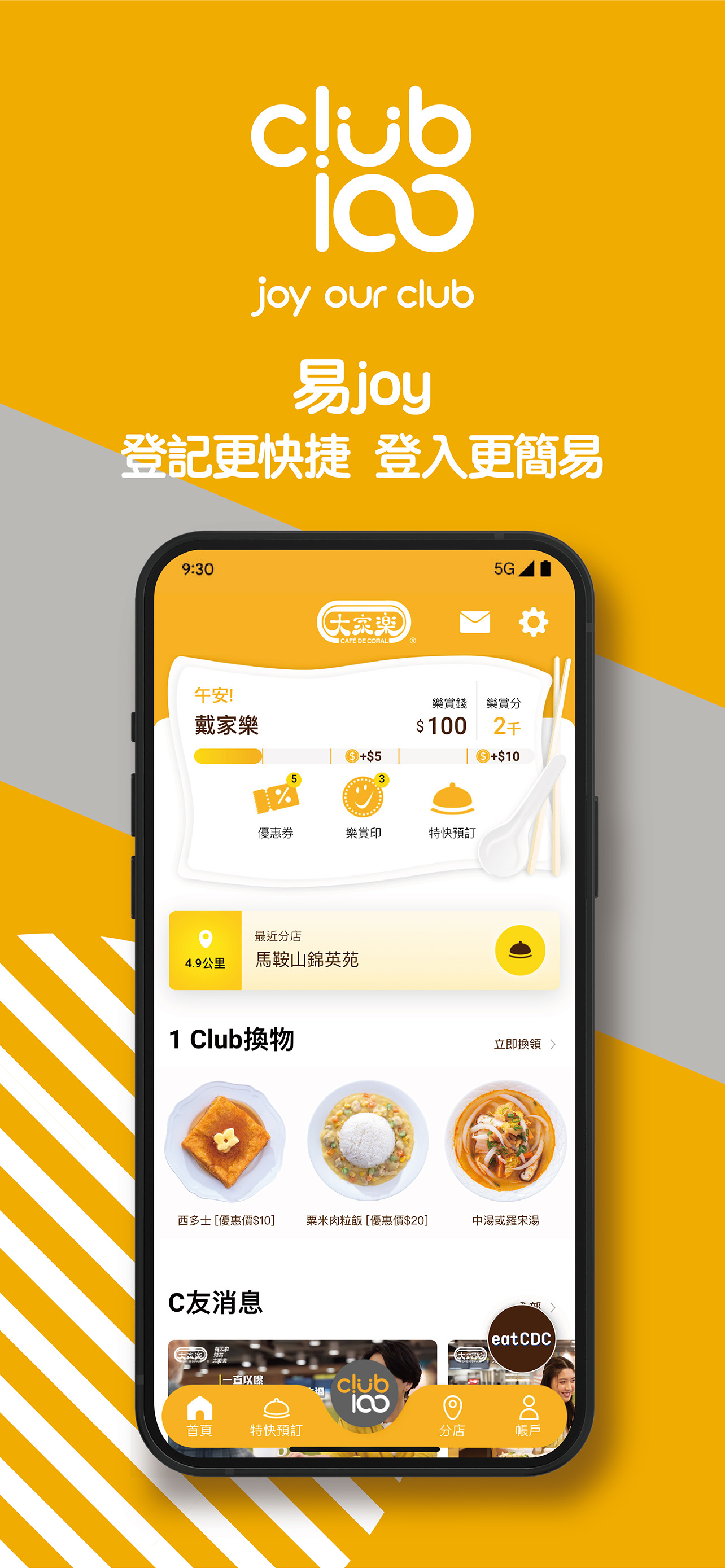Café de Coral Club 100 Easy.0 Joy Наш клуб Easy Joy! Легкая награда! легко поделиться Получите электронный купон на $20 при регистрации! Ешьте 5 раз в неделю и получайте вознаграждение в размере 15 юаней! Easy Joy: простая регистрация по номеру мобильного телефона и поддержка входа через социальные сети. Easy Rewards: ешьте больше d, получайте больше d, копите марки, чтобы получать дополнительные награды Легко поделиться: вы можете поделиться электронным купоном Club 100 с друзьями, и вы можете проверить купленный электронный купон eatCDC в любое время. Easybook: быстрый заказ мобильного телефона