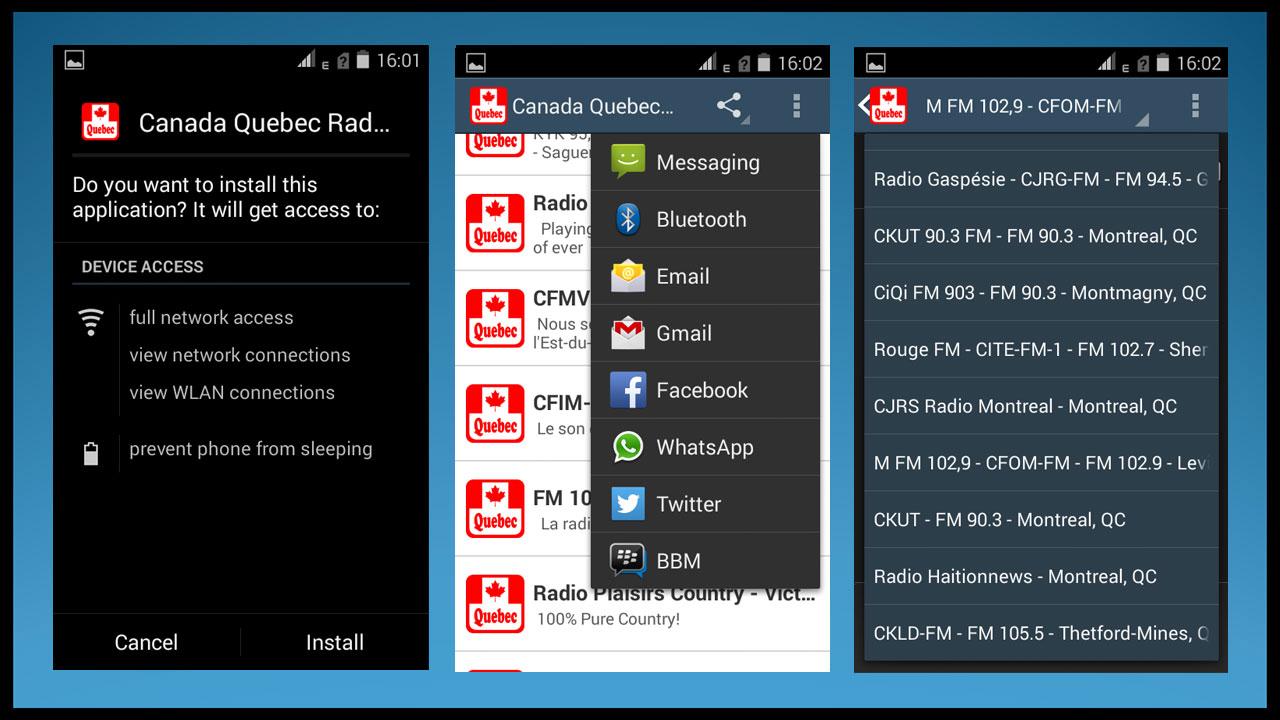 Canada Quebec Radio Stations is an application that brings you several Canada Quebec Radio Stations. Listen to them in realtime from you Android device like smartphone, Tablet and motre. From pop to dance, there is always a FM radio that you will like. It has several interesting features: * You can Listen your favorite radio stations in high quality. * This Radio apps able to Runs in the background (so you can surf the web, do your job and at the same time listen to amazing radio station songs). * Alot of Canadian FM Radio stations to browse. Radio stations are updated on demand via Internet. * Display Artist name and song title (PS: of course not all radios provide this information). - Interactive Menu: Select different radio stations by scrolling up and down. - Play, Stop and Pause buttons. Attention: Internet connection is required in order to stream radio content. Radio List: CJAD 800 - CJAD - AM 800 - Montreal, QC News. Talk. Radio Virgin 96 Radio - CJFM-FM - FM 95.9 - Montreal, QC CKAJ - CKAJ-FM - FM 92.5 - Saguenay, QC 100% régionale ! Ici Musique Montreal - CBFX-FM - FM 100.7 - Montreal, QC La destination musicale de Radio-Canada CPAM 1410 AM - CJWI - AM 1410 - Montreal, QC La seule radio éthnique d'expression Française en Amérique du nord CHYZ-FM - FM 94.3 - Sainte-Foy, QC Rouge FM - CITE-FM - FM 107.3 - Montreal, QC Toute la musique, une couleur Radio X - CHOI 98.1 - FM 98.1 - Quebec City, QC Radio Moyen-Orient - CHOU - AM 1450 - Montreal, QC Radio Middle-East 24 hours CKAU - CKAU-FM - FM 104.5 - Maliotenam, QC Uashat mak mani-utenam CKMN - FM 96.5 - Rimouski, QC Le son d'une région CKBN-FM - FM 90.5 - Becancour, QC La voix de la Rive-Sud X2 ROCK 100.9 - CKNU-FM - FM 100.9 - Quebec, QC La meilleure radio rock au monde! Énergie 94.3 - CKMF-FM - FM 94.3 - Montreal, QC La radio de tous les hits à Montréal ! CHGA-FM - FM 97.3 - Maniwaki, QC Radio communautaire de la Haute-Gatineau KYK 95,7 Radio X - CKYK-FM - FM 95.7 - Saguenay, QC Radio Naples - Montreal, QC Playing the biggest Neapolitan music of ever CFMV-FM - BleuFM - FM 96.3 - Chandler, QC Nous sommes le réseau musical de l'Est-du-Québec CFIM-FM - FM 92.7 - Cap-aux-Meules, QC Le son de la mer FM 103.3 - CHAA-FM - FM 103.3 - Longueuil, QC La radio allumée Radio Plaisirs Country - Victoriaville, QC 100% Pure Country! ITR Tamil 89.3 FM - FM 89.3 fm - Montreal, QC Canada's Tamil Entertainment Radio CHLC-FM - FM 97.1 - Baie-Comeau, QC Radio Gaspésie - CJRG-FM - FM 94.5 - Gaspé, QC CKUT 90.3 FM - FM 90.3 - Montreal, QC Campus Community Radio — since 1987 CiQi FM 903 - FM 90.3 - Montmagny, QC Par iCi, c'est CiQi! CILE-FM - FM 95.1 - Havre-Saint-Pierre, QC Radio Communautaire au coeur de la Minganie Rouge FM - CITE-FM-1 - FM 102.7 - Sherbrooke, QC Toute la musique, une couleur CJRS Radio Montreal - Montreal, QC M FM 102,9 - CFOM-FM - FM 102.9 - Levis, QC CKUT - FM 90.3 - Montreal, QC Radio Haitionnews - Montreal, QC CKLD-FM - FM 105.5 - Thetford-Mines, QC La radio la plus musicale! Note: If there is a specific radio station is not working, please refresh radio list by clicking on Recycle button in upper right position of the app.