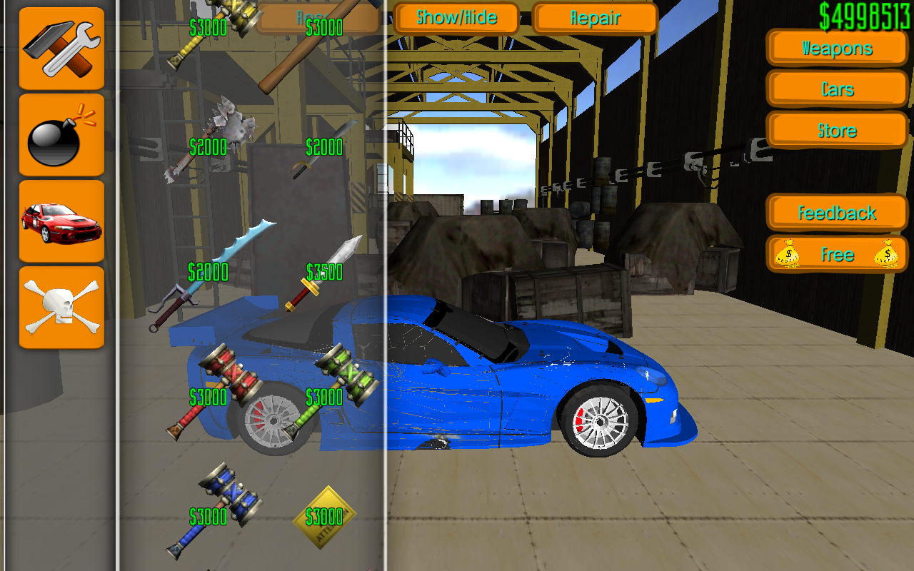 You have an arsenal of objects at your disposal. Choose your favorite weapon and dent, scratch, fling, crush, and total the car in the garage. You can choose anything from a wrench to an apple or a sledge hammer!