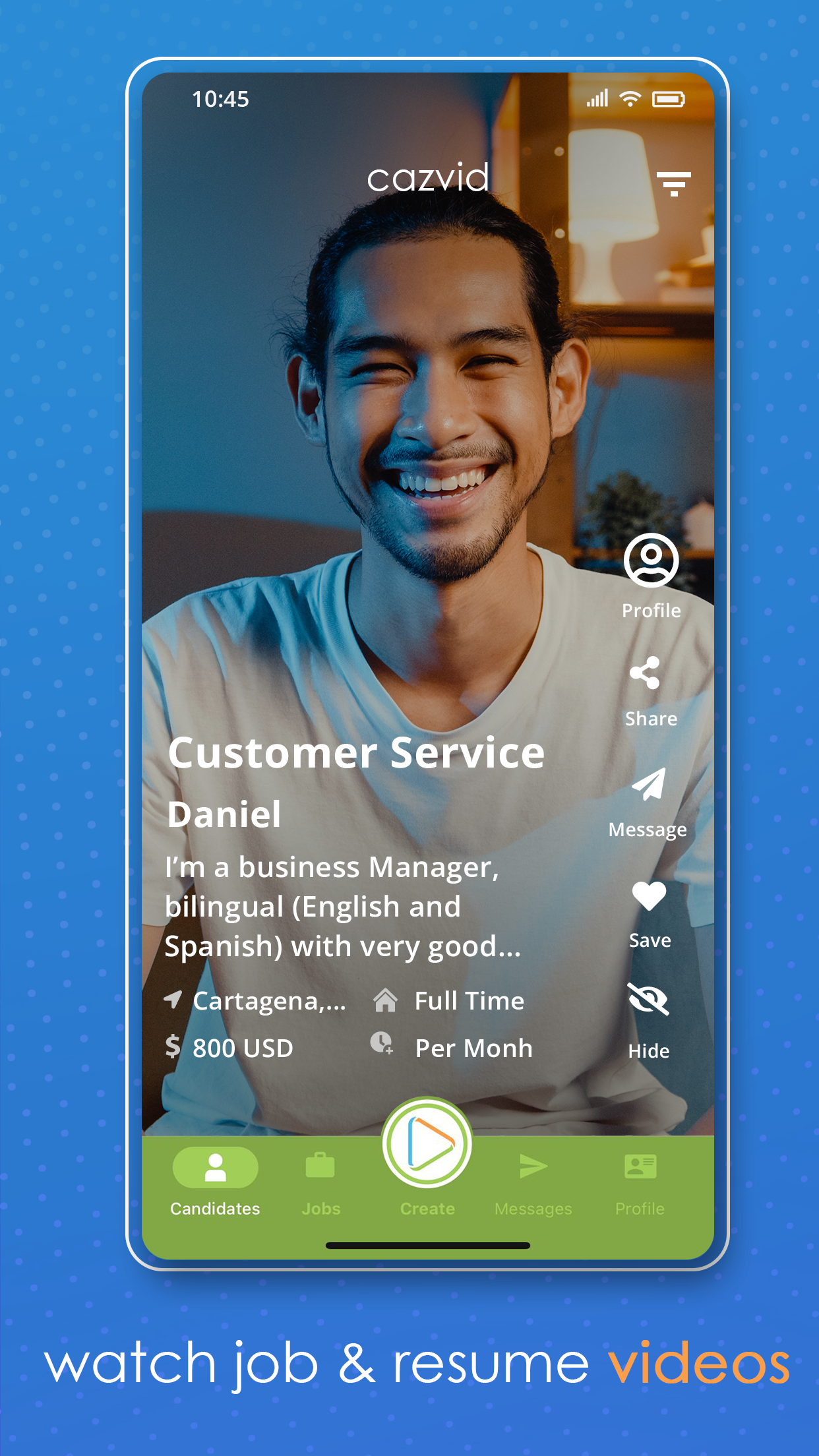 Размещайте объявления о вакансиях и резюме бесплатно! CazVid — бесплатное приложение для публикации вакансий и резюме. Разница в том, что все списки вакансий и резюме представляют собой короткие 30-секундные видеоролики. С CazVid вы можете быстро и легко публиковать и просматривать списки вакансий и резюме. Отфильтруйте вакансии и резюме в соответствии с вашими требованиями. Видите вакансию, которая вам нравится, или кандидата, ищущего работу, который вас интересует? Нажмите «связаться со мной» и начните общение в приложении бесплатно. Ищу работу? Поиск и подача заявки на работу может быть сложной задачей. Просматривая веб-сайты со списками вакансий, пытаясь найти доступные вакансии, заполняя бесконечные формы, только для того, чтобы загрузить резюме, которое никто никогда не увидит. Вы знаете, что если бы у вас была возможность напрямую поговорить с работодателем и представиться, вы могли бы получить работу. CazVid предоставляет вам такую возможность! Быстро и легко просматривайте доступные объявления о вакансиях. Видишь работу, которая тебе нравится? Запись бесплатного видео-резюме прямо в приложении занимает всего 30 секунд. Представьтесь и прямо скажите работодателю, почему вы идеальный кандидат на эту работу. Больше не нужно теряться в безликом море резюме. Просто нажмите «связаться со мной» и напишите им напрямую! Хотите нанять? Поиск подходящего кандидата на работу может быть разочаровывающим процессом. Публикация списков вакансий и сортировка резюме могут быть дорогостоящими и трудоемкими. У CazVid есть решение! С CazVid для записи видео со списком вакансий требуется всего 30 секунд. Просто объясните требования к работе или запишите короткое видео о самой работе. Есть разные должности, которые необходимо заполнить? Опубликуйте несколько видео - это бесплатно! Не все вакансии требуют традиционного резюме. Краткое введение — это все, что нужно для начала рабочего процесса. CazVid — это решение. Загрузите сейчас и начните работу!