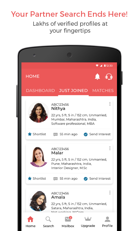 ChambharMatrimony App, part of CommunityMatrimony, is the most trusted matrimony service for Chambhar across the world. You can choose Chambhar bride and groom profiles from major cities across Maharashtra, India and NRIs from abroad. Thousands of Chambhars have successfully found their life partner here. You too can find a Perfect Match. 100% Safe and Secure app. Register FREE. Top ChambharMatrimony App Features: - Free Registration - User friendly interface and easy partner search options - Get daily matches on mobile and email - Express your interest to shortlisted matches - Get instant alerts when there is a communication - Shortlist and save potential matches - Interact with other members using the chat feature We have members from major cities in India like Mumbai, Pune, Thane, Nashik, Solapur, Nagpur, Kolhapur, Ahmednagar and etc., besides Chambhar NRIs from Abu Dhabi, Dubai, USA, Canada, UAE, Malaysia, Saudi Arabia, Germany, Kuwait, Singapore, Australia and Etc. You can find brides and grooms from different Professions, Educational Backgrounds, Regions & Sub Castes, Our databases of Marathi Chambhars aims to provide you with the best possible match to find the love of your life. Download app today and find your life partner! Get the Premium Advantage A Premium Membership means: - You can talk directly to the opposite match - You can get contact details including phone number, mail id and address. - You can also chat live with members you like - You can send personalised messages to people you like Chambhar Matrimony App is part of Community Matrimony from Matrimony.com, which also offers language based matrimonial service like Marathi Matrimony. The app is designed keeping in mind various partner preferences that a bride or groom might have while choosing their life partner. The Chambhar Matrimony App is intelligently developed to give you the best results while matching you with your life partner. You can also find your partner from other Regional Apps of Bharat Matrimony including Marathi Matrimony. Thousands of Chambhar from across Maharashtra, India and the world have found their perfect life partner here. The ChambharMatrimony app is light and easy to use and it occupies very little phone space. So, what are you waiting for? Download the ChambharMatrimony App Now and find your perfect life partner! Register FREE.
