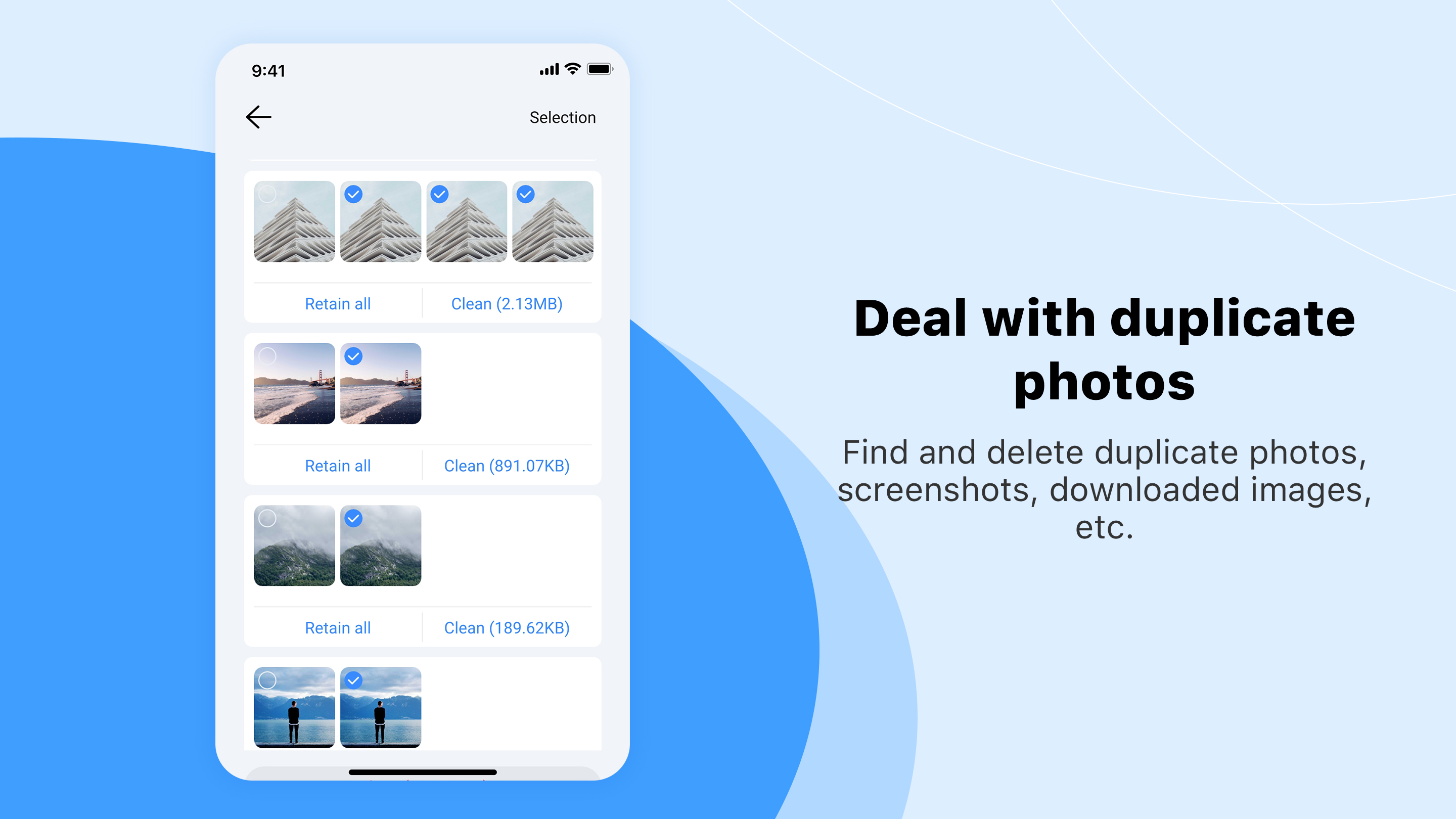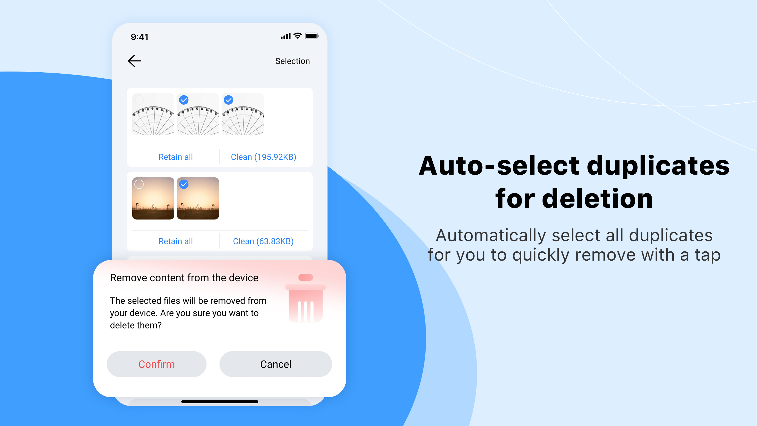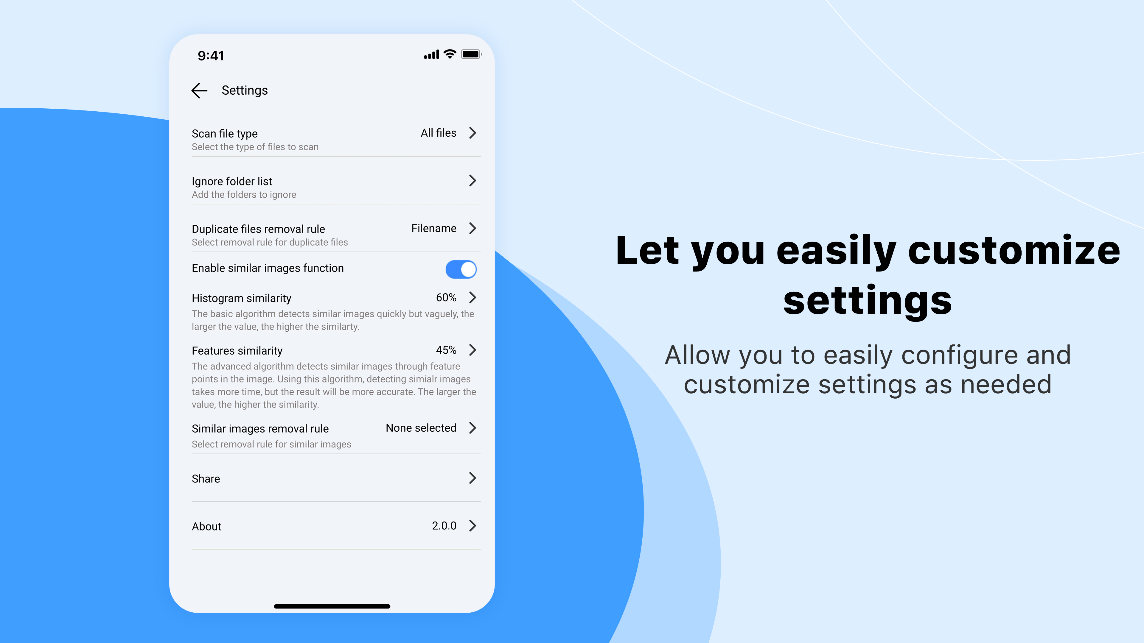 Find duplicate photos, videos, audio files, documents and other duplicate files Support all common file formats, like JPG, PNG, MP4, MP3, PDF, APK, etc. Also find similar photos, with adjustable similarity thresholds Display the found duplicate files and similar photos for users to view Automatically select all duplicates for users to delete with a tap Offer selection rules for users to customize the auto-selection Allow users to customize settings, such as ignoring specific folders
