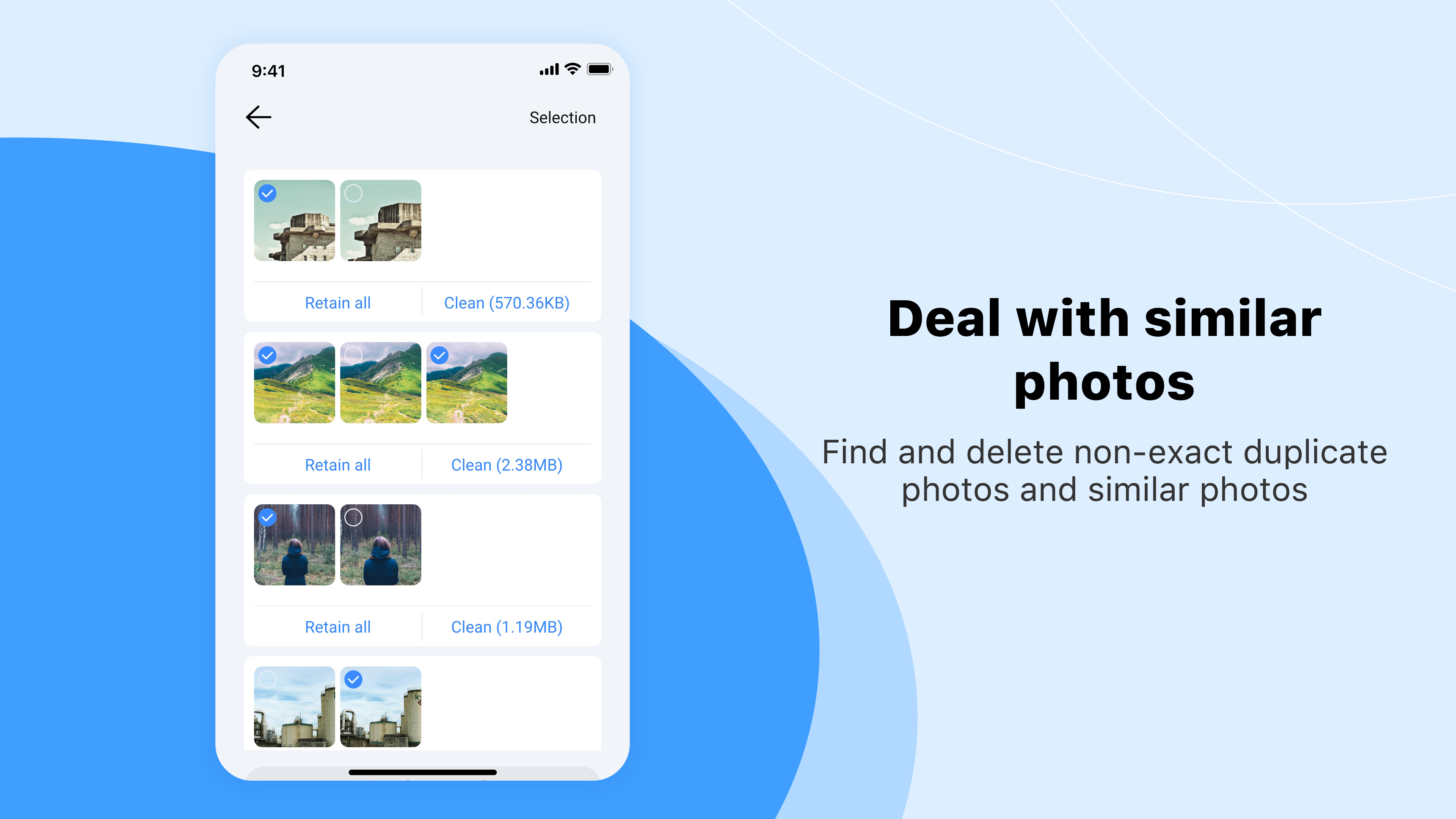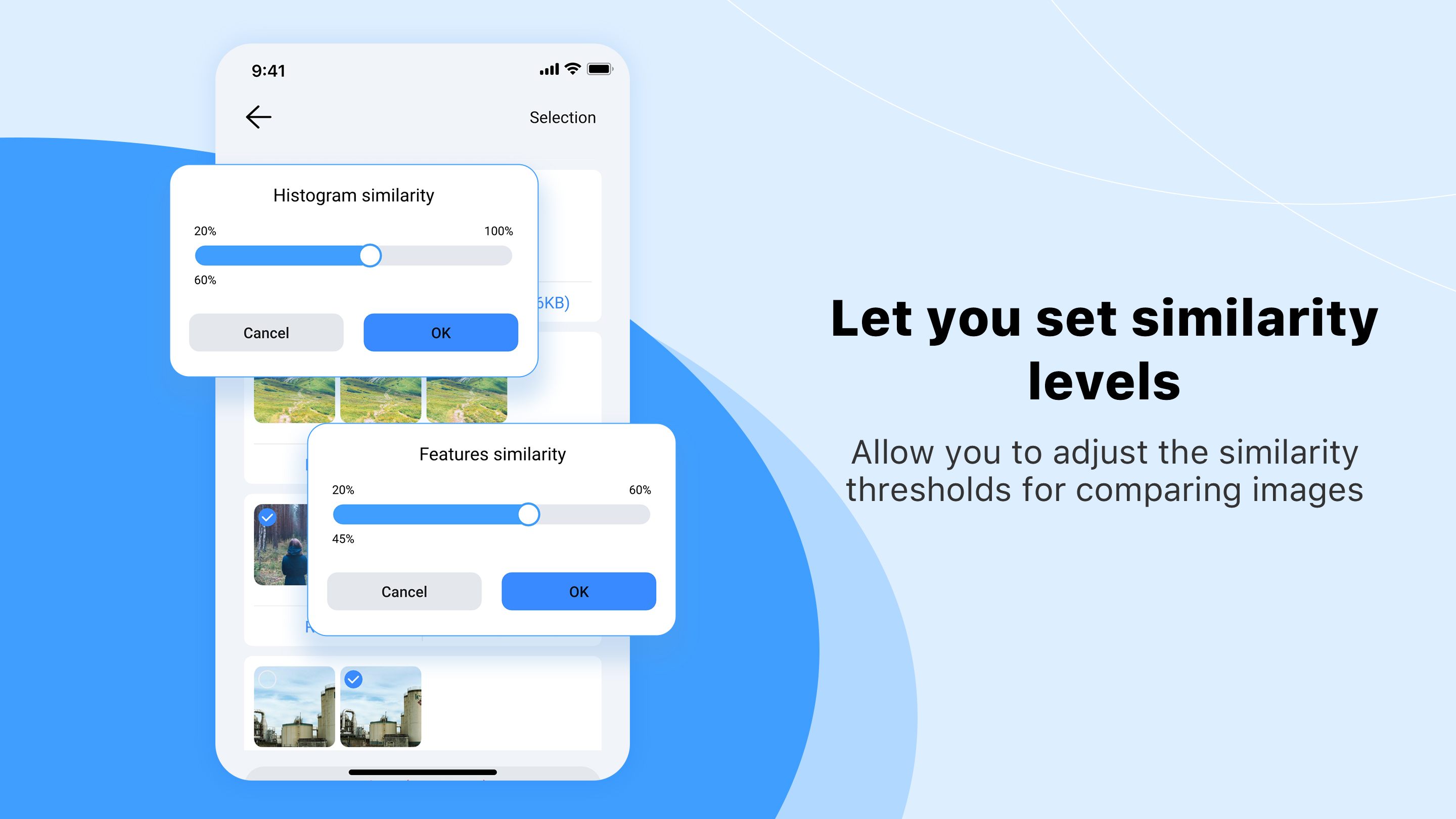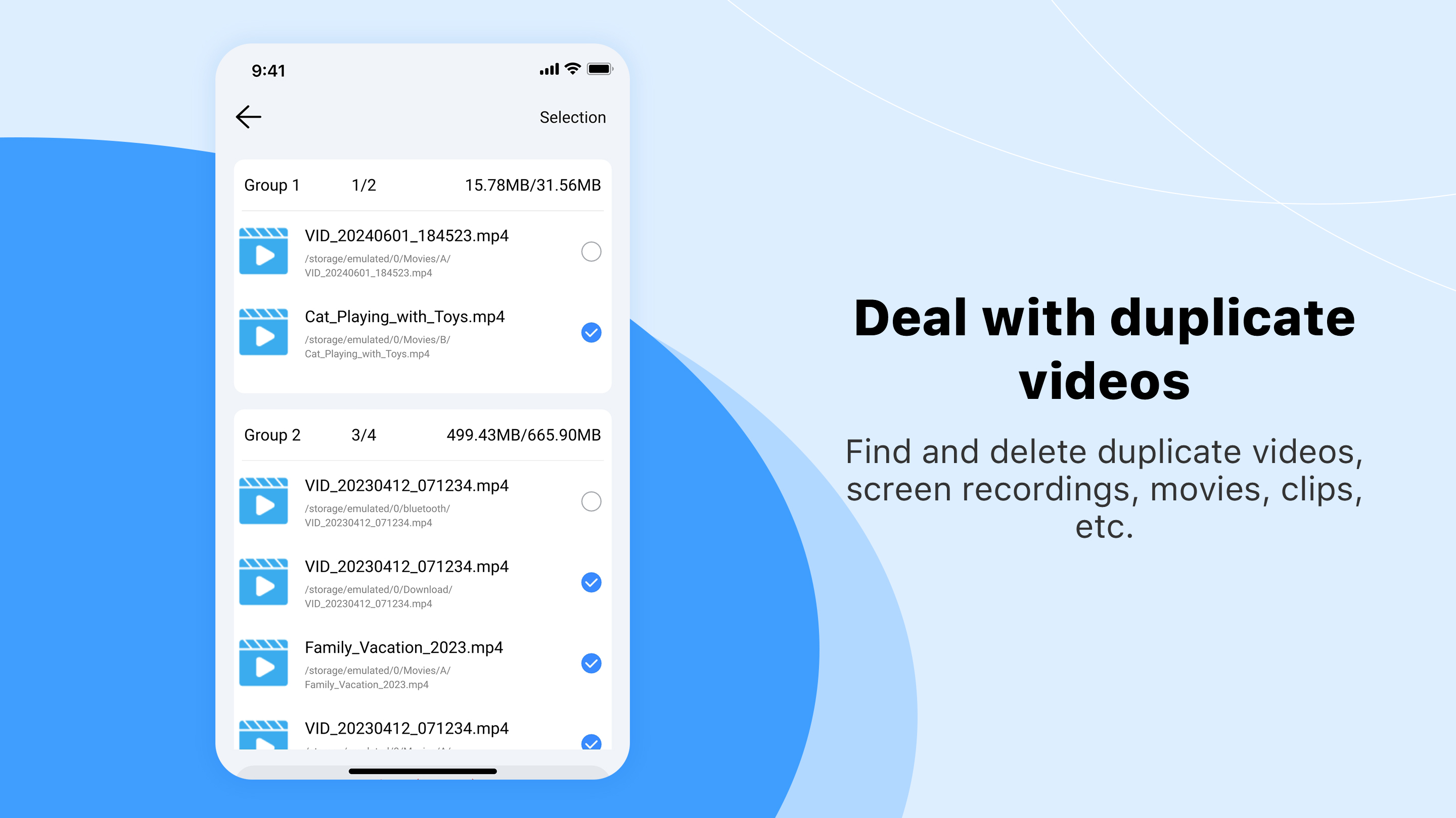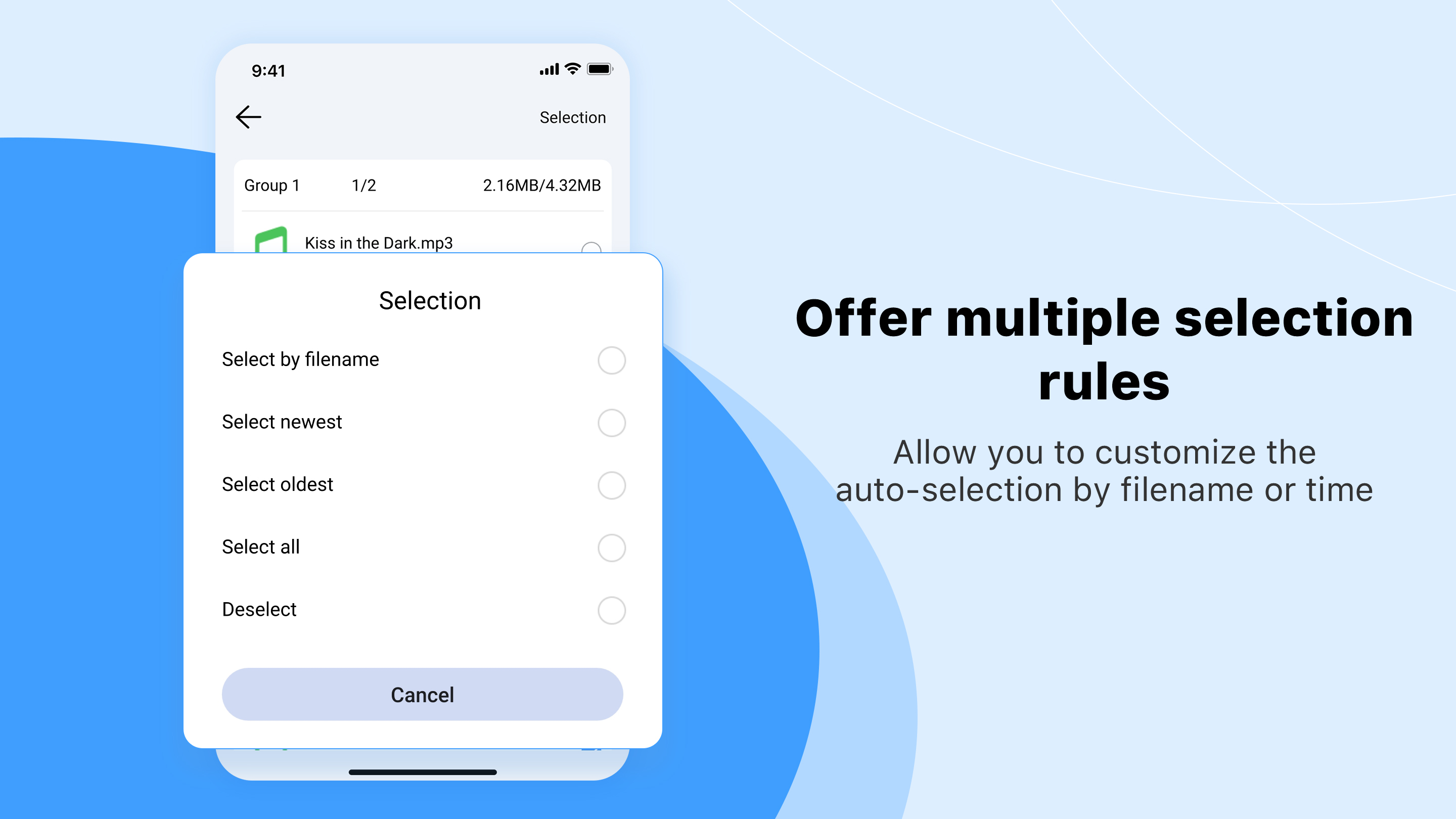 Find duplicate photos, videos, audio files, documents and other duplicate files Support all common file formats, like JPG, PNG, MP4, MP3, PDF, APK, etc. Also find similar photos, with adjustable similarity thresholds Display the found duplicate files and similar photos for users to view Automatically select all duplicates for users to delete with a tap Offer selection rules for users to customize the auto-selection Allow users to customize settings, such as ignoring specific folders