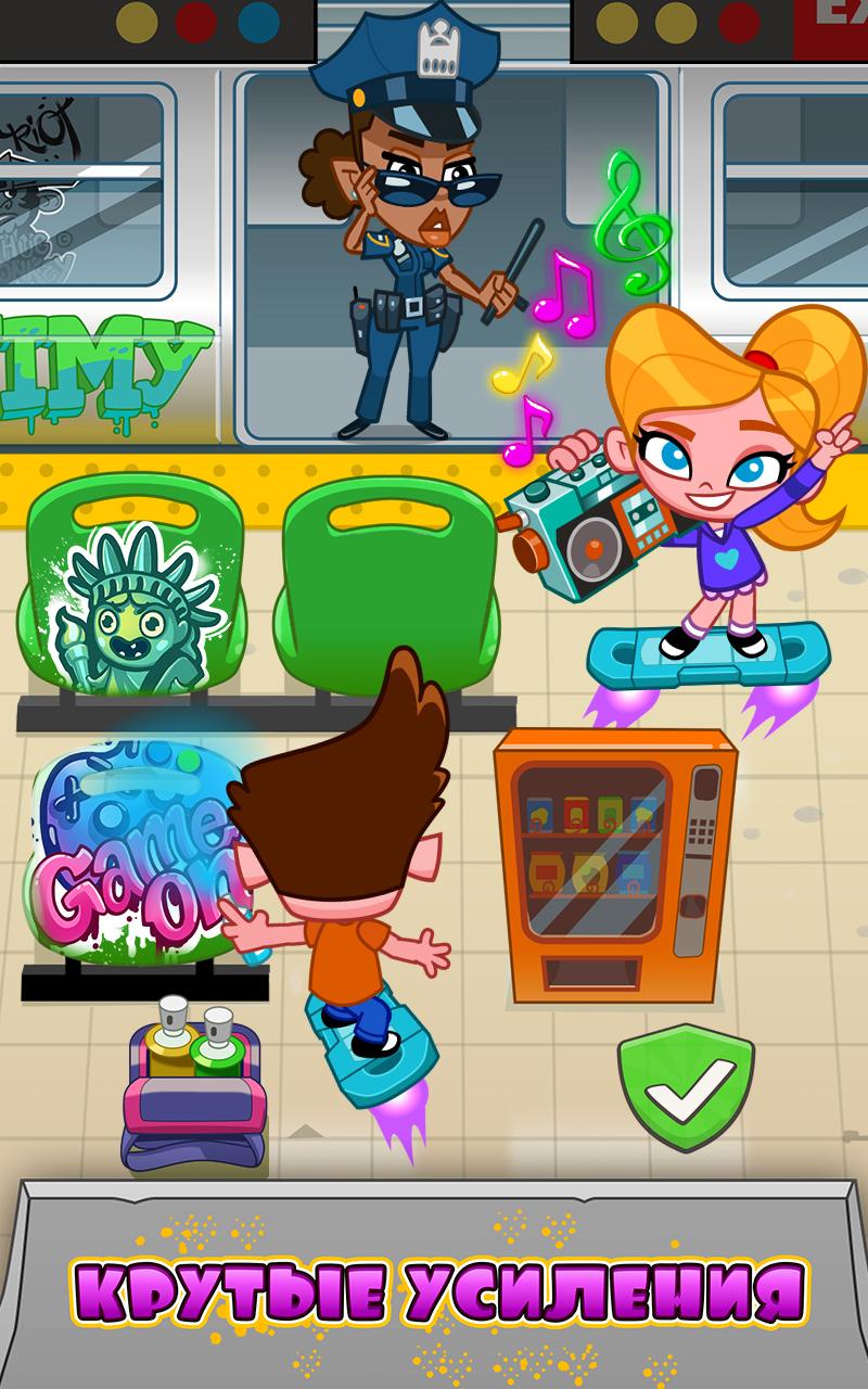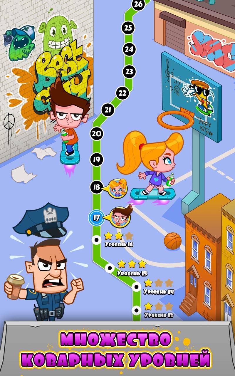Твой любимец Мошенник Том снова с нами, и в запасе у него припасены новые проказы. После уроков он намерен погрузить этот город в мир граффити, раскрасив его всеми цветами радуги. Помоги этому плутишке прокатиться на гироскутере и улизнуть от полицейских, одновременно успевая наносить ущерб улицам Нью-Йорка! Зарабатывай жульнические усиления, проходи непростые уровни и открой для себя сотни рисунков граффити! Не дай копам повязать тебя!