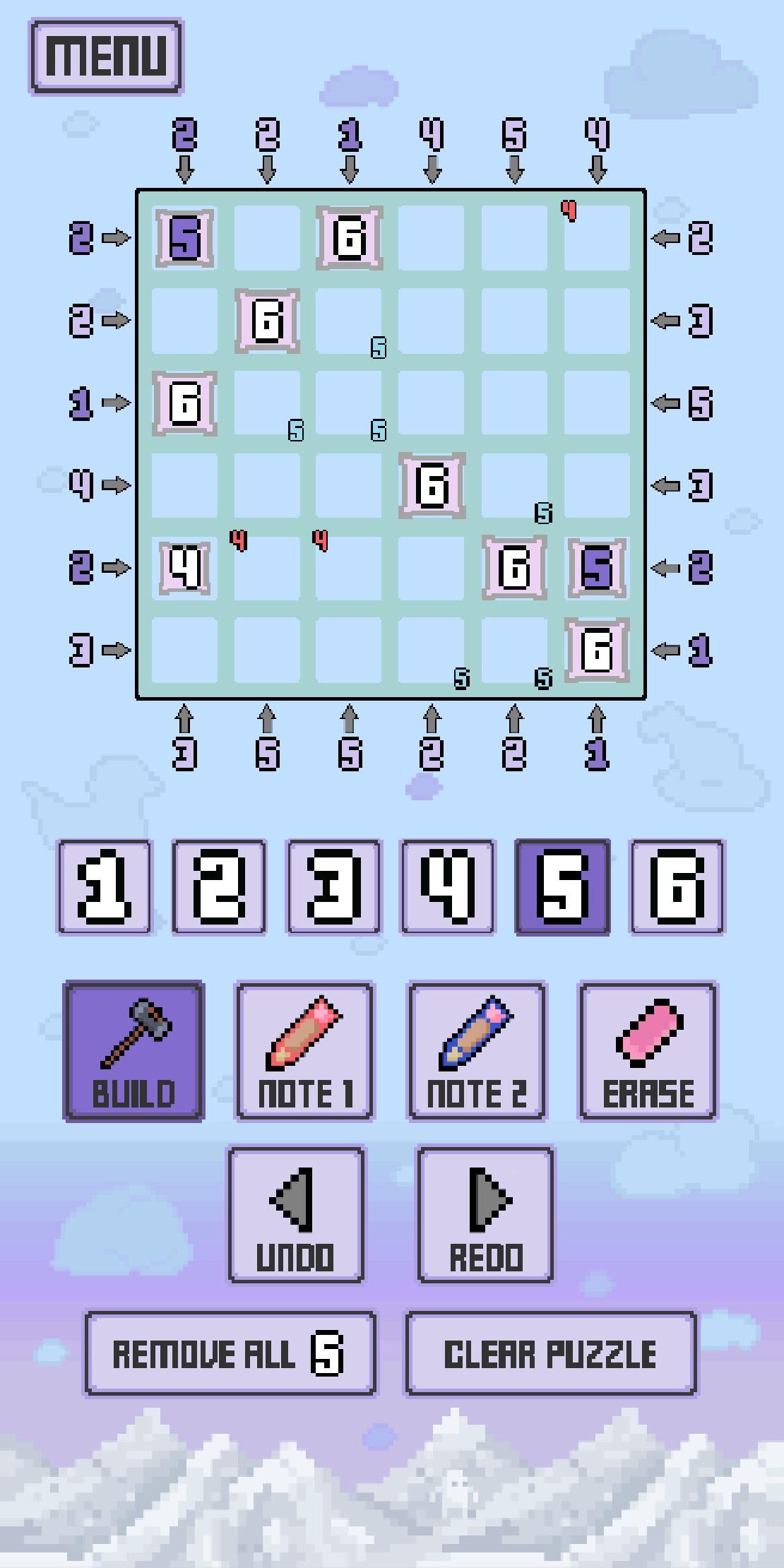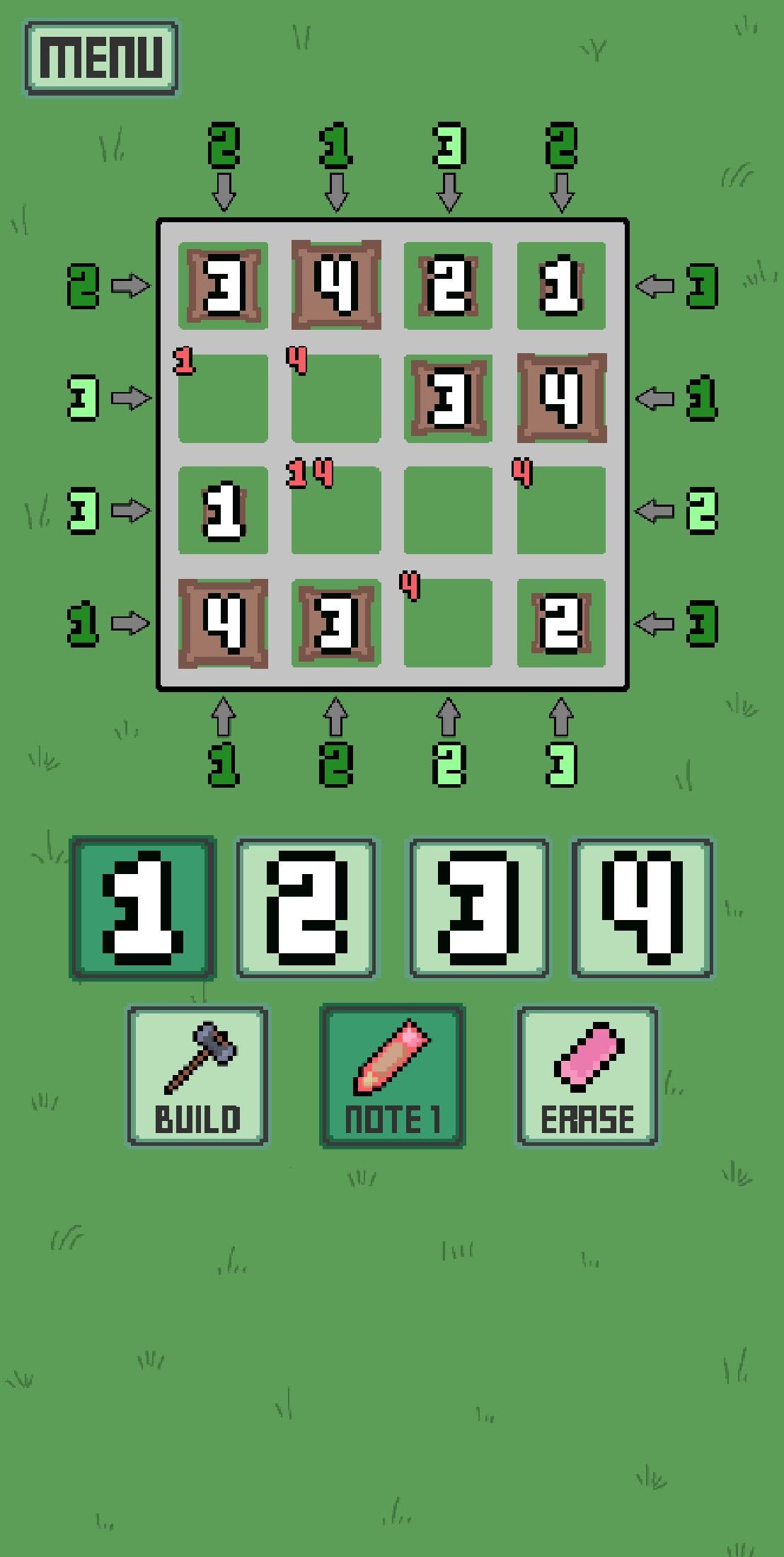 Cityscapes is a puzzle game featuring randomly-generated Skyscrapers puzzles. Skyscrapers are a type of number-placement puzzles, similar to Sudoku. Each row and column of spaces on the puzzle have to contain exactly one of each number, and there are hints on the sides of the puzzle that give you further clues about where specific numbers have to go. Cityscapes wraps the Skyscrapers puzzle type into a clean and retro interface, with several gameplay upgrades available as you progress.