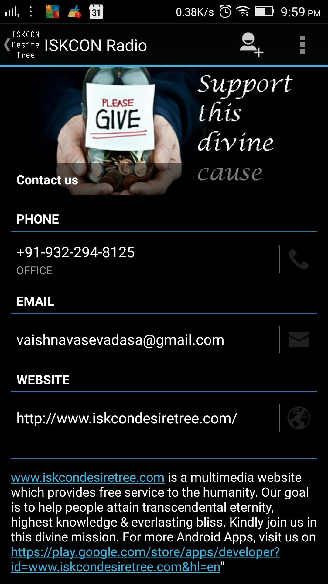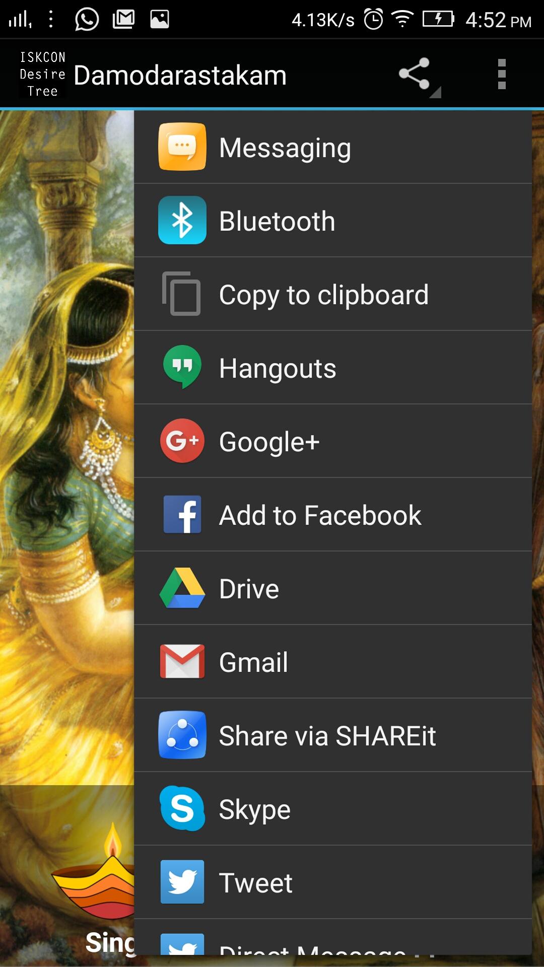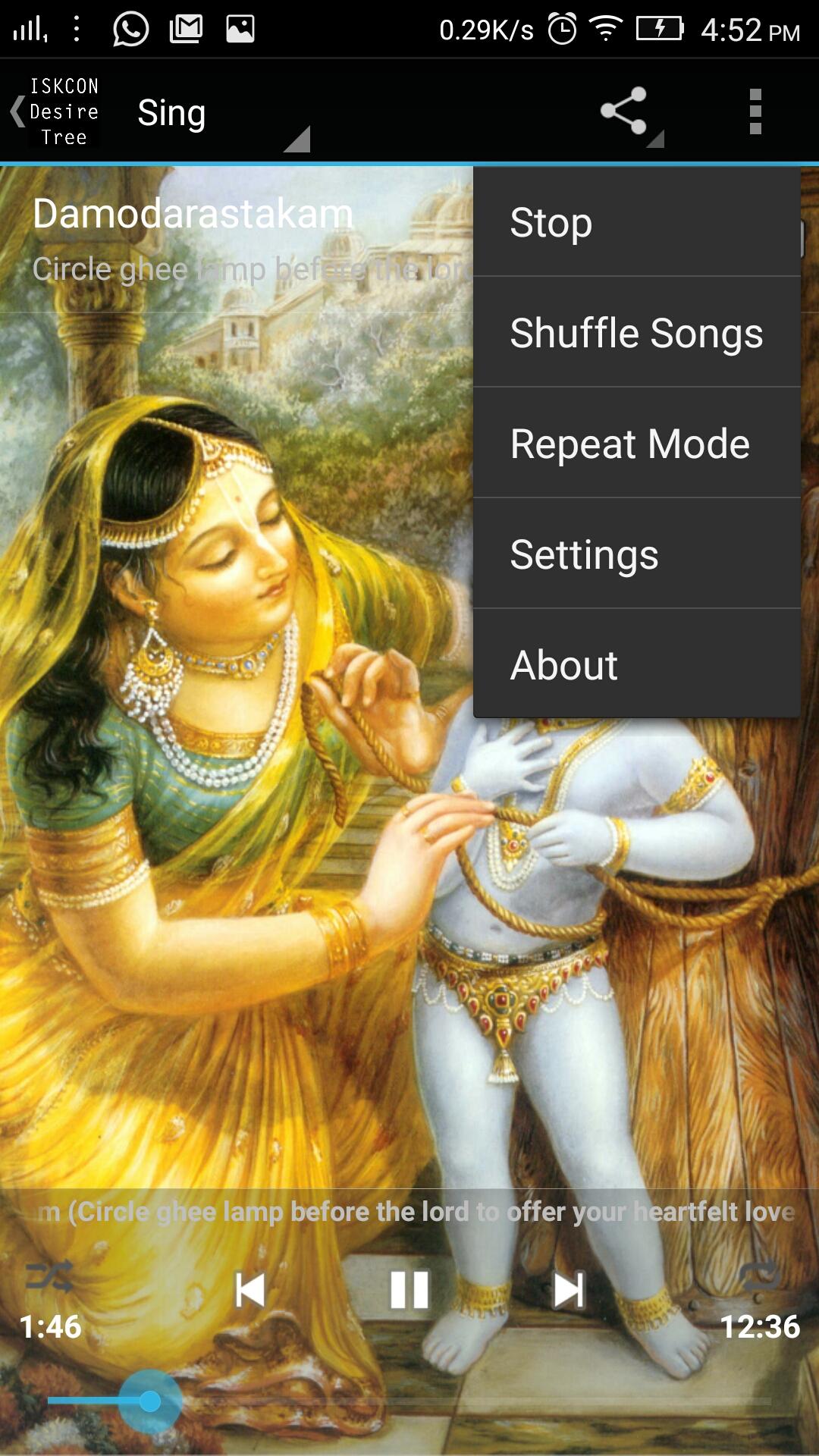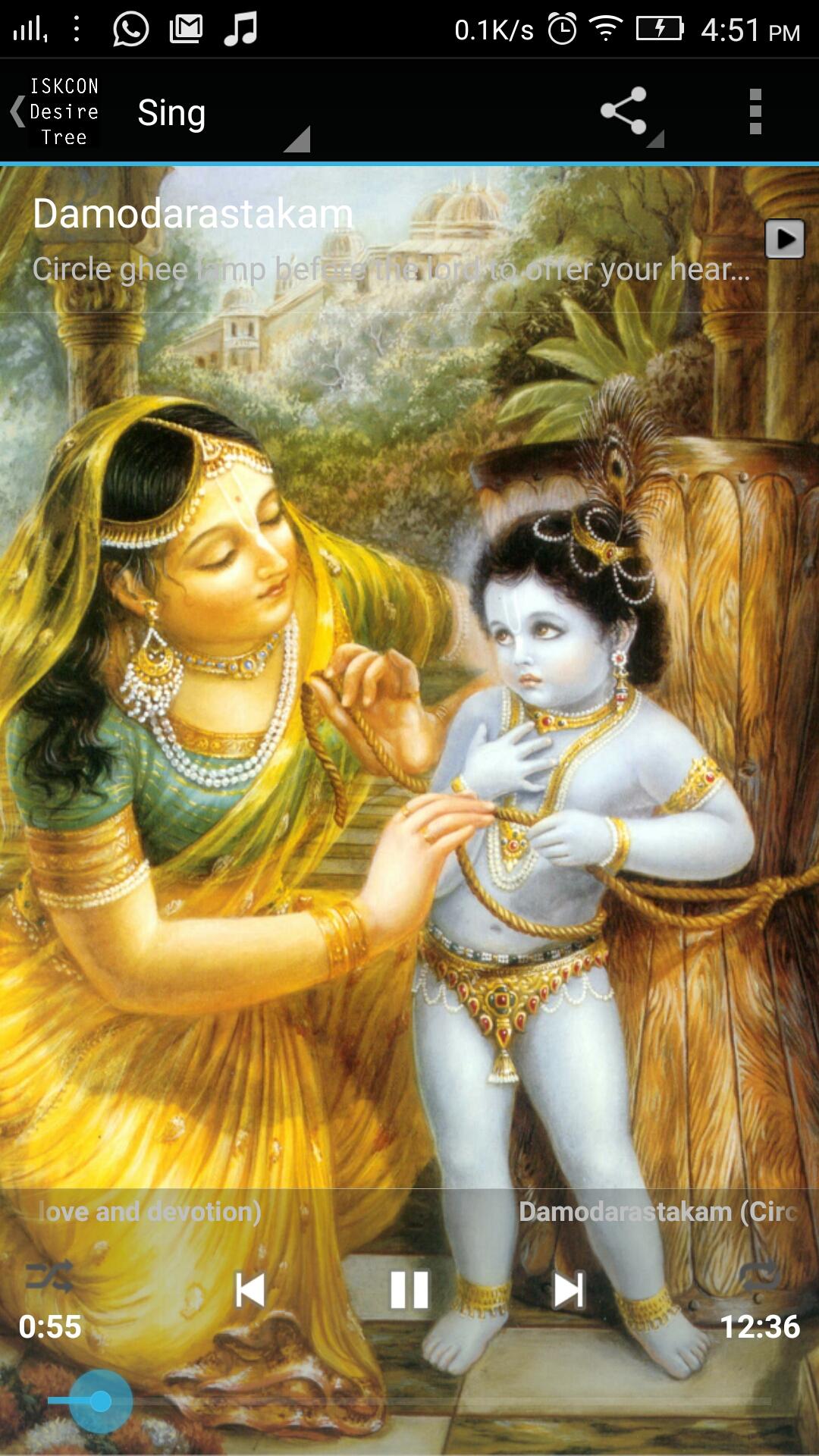 ОСОБЕННОСТИ ★ Ofline приложение. После загрузки, не требует интернет. ★ Высокое качество песня поется Damodarastakam известный вайшнава певицы Сварупа Дамодара Даса ★ Ницца образ Дамодара лиле ★ Тексты песен на английском языке и хинди наряду со словом к переводу слово ★ Легко играть ★ очень простой интерфейс ★ Нет нежелательные всплывающие окна, спам, рекламную и Уведомления ★ Абсолютно Чистая приложение ★ размер приложения очень мал. Потребляет очень мало места в памяти. ★ приложение может быть перемещен в SD-карты ★ Вы можете легко обмениваться этого приложения с семьей и друзьями беспересадочный Google Play Эта песня поется в течение месяца Картика, также известный как месяц Дамодара. Как цитирует в Шри Хари-бхакти-виласе "В месяц Картика следует поклоняться Господу Дамодару и ежедневно читать молитву, известную как Дамодараштаки, который был говорят мудрецом Сатйаврата и который привлекает господин Дамодара. (Шри Хари-бхакти -vilasa 2.16.198) ". Когда Господь Кришна, Верховная Личность Бога, появляется на земле, Он выполняет чрезвычайные играх как трансцендентного пастушка. В детстве, Господь Кришна жил с чистыми преданными в деревне Вриндаван, или Гокулы. В духовном мире (Вайкунтхи) Господа, в Его форме называется Нараяна, поклоняются с большим благоговением и почтением, но преданные во Вриндаване есть такое большое любовь к Господу, что они даже забывают, что Он Господь. Из-за их сильной любви к Нему, они думают о Нем, как своего друга, сына или возлюбленного. И Господь, чтобы угодить своим преданным, отвечает в роли, в которой преданные думают о Нем. В трансцендентальной времяпрепровождения, Господь Кришна использованы для кражи масла из гопи, дам Вриндаван. Однажды, однако, мать схватила его, связали ему талии с веревкой и привязал его к шлифовальным раствора, чтобы наказать его. Господь, следовательно, также известный как Дамодара (дама означает "веревка", и означает "Удара талии"). В дворе Господа Кришны были два дерева, которые были на самом деле сыновей полубога Куверы но были прокляты стоять, как деревья. По Его милости, Господь Кришна прополз между этими деревьями, волоча тяжелый миномет за Ним, и вытащил деревья вниз, таким образом, освобождая двух сыновей Кувера в. Детали этих играх описаны в книге Шрилы Прабхупады, озаглавленный Кришны, Верховной Личности Бога.
