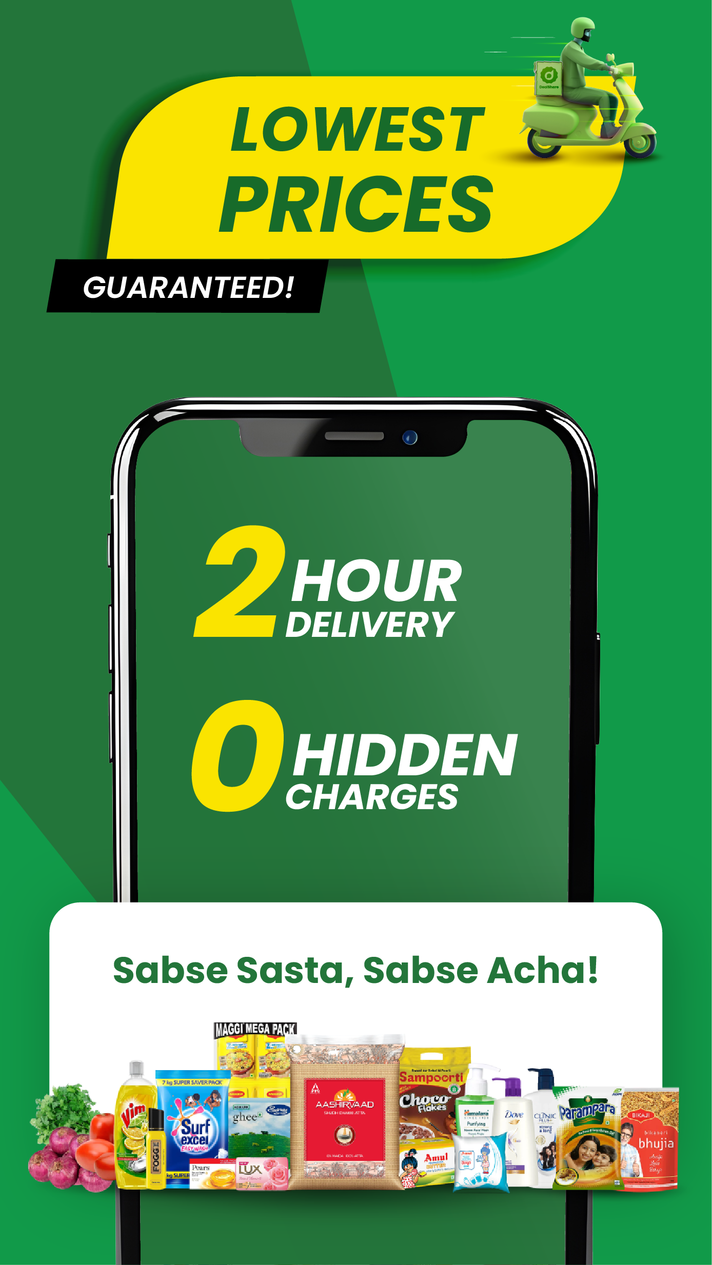 Выбирайте из более чем 20 000 разнообразных товаров по ценам ниже, чем в местном продуктовом магазине / магазине kirana, только в DealShare: онлайн-приложении для доставки продуктов на дом. Поддерживаются бесплатная доставка и услуги наложенного платежа, что дает вам безопасный и приятный опыт покупок, позволяя вам покупать все товары по самой низкой цене!