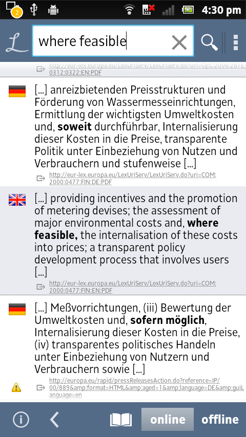 If you do not have an active internet connection or chose to disable the online feature, you can search the big offline dictionary of your Linguee app. Just start typing – Linguee will suggest good results.