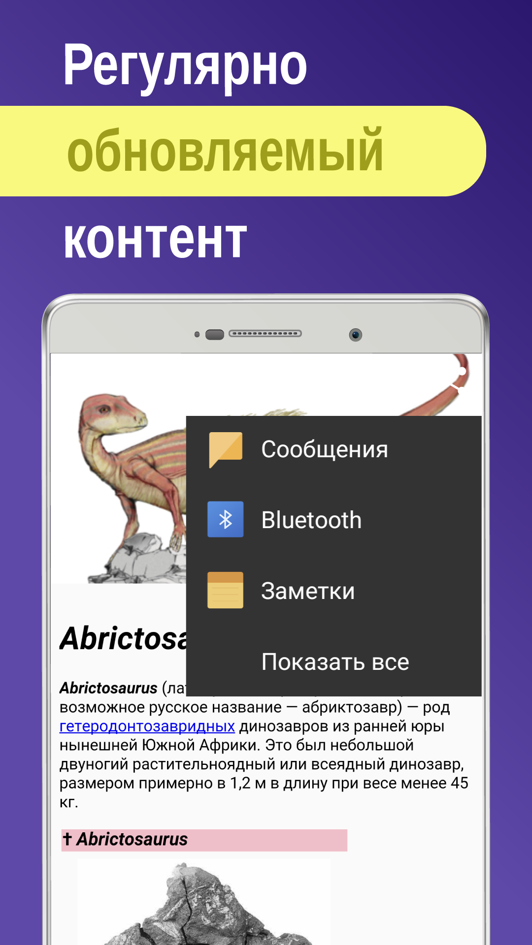 Большая энциклопедия "Динозавры. Древние формы жизни": фауна геологических периодов, эволюция, массовые вымирания. Палеонтология - наука о жизни, существовавшей до начала голоценовой эпохи или в её начале (примерно 11 700 лет назад), в прошлые геологические периоды. Она включает в себя изучение фоссилий (ископаемых остатков) для определения эволюции организмов и их взаимодействия с окружающей средой (палеоэкология). Палеозоология (архезоология) — раздел палеонтологии, изучающий ископаемых животных. Условно разделяют на палеозоологию позвоночных и беспозвоночных. Палеозоология изучает биологическое разнообразие, его изменение во времени и пространстве. Такое разнообразие устанавливается через морфологию, определение систематического состава и построение новых классификаций. Пермский период (пермь) — последний геологический период палеозойской эры. Начался примерно 299 млн лет назад и продолжался около 47 млн лет. Завершился около 250 млн лет назад величайшим в истории планеты массовым пермским вымиранием. Отложения периода подстилаются карбоновыми и перекрываются триасовыми. Архозавры (лат. Archosauria) - клада диапсидных пресмыкающихся, представленная в настоящее время крокодилами и птицами, а из вымерших организмов также: нептичьими динозаврами, птерозаврами и другими. Авеметатарзалии (лат. Avemetatarsalia) - клада животных, определение которой впервые дано в 1999 году. Представляет собой одну из двух основных ветвей архозавров, включающую в себя клады Dinosauromorpha и Pterosauromorpha, объединяемых под общим названием Ornithodira, а также кладу Aphanosauria. В целом в число авеметатарзалий включаются все архозавры, по семи синапоморфическим признакам более близкие к динозаврам и современным птицам, чем к крокодилам. Мегалозавр (лат. Megalosaurus) - род крупных плотоядных тероподовых динозавров из семейства мегалозаврид (Megalosauridae), включающий единственный валидный вид - Megalosaurus bucklandii. Мегалозавры достигали 9 метров в длину и были двуногими хищниками, весившими около тонны. Структура шейных позвонков позволяет утверждать, что шея этих динозавров была достаточно гибкой. Задние конечности имели по четыре пальца, три из которых были направлены вперёд (на них мегалозавр опирался при ходьбе); один палец, направленный назад, был редуцированным. Передние конечности короткие. Трицератопс (лат. Triceratop) - род растительноядных динозавров из семейства цератопсид, существовали в конце маастрихтского века мелового периода, примерно от 68 до 66 миллионов лет назад на территориях современной Северной Америки. Внешность трицератопса легко узнаваема - большой костяной воротник, три рога на морде, крупные толстые конечности и сходное с носорогом телосложение. Возможно, самый опасный хищник того времени - тираннозавр - мог охотиться на трицератопсов, но неясно, могли ли они сражаться друг с другом, как это часто изображается. Игуанодон (лат. Iguanodon) - род растительноядных птицетазовых динозавров. Принято считать, что единственным видом, принадлежность которого к роду игуанодонов не вызывает сомнения, является I. bernissartensis, обитавший на территории современных Бельгии, Испании и некоторых других стран приблизительно 126-125 миллионов лет назад (ранний меловой период). Отличительными особенностями игуанодона являлись острый коготь на большом пальце, который предположительно использовался дл