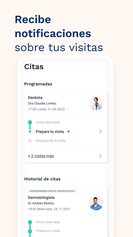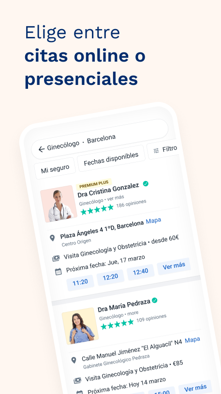 Скачав наше приложение, у вас будет доступ к более чем 120 000 специалистов со всей страны, чтобы быстро и легко записаться на прием к врачу прямо с вашего мобильного телефона. Вы можете фильтровать результаты поиска по специальности, городу, почтовому индексу, медицинской страховке (Adeslas, Allianz, Asisa, DKV, Mapfre, Muface, Sanitas, Zurich и т. д.), лечению и даже искать прямо на карте.