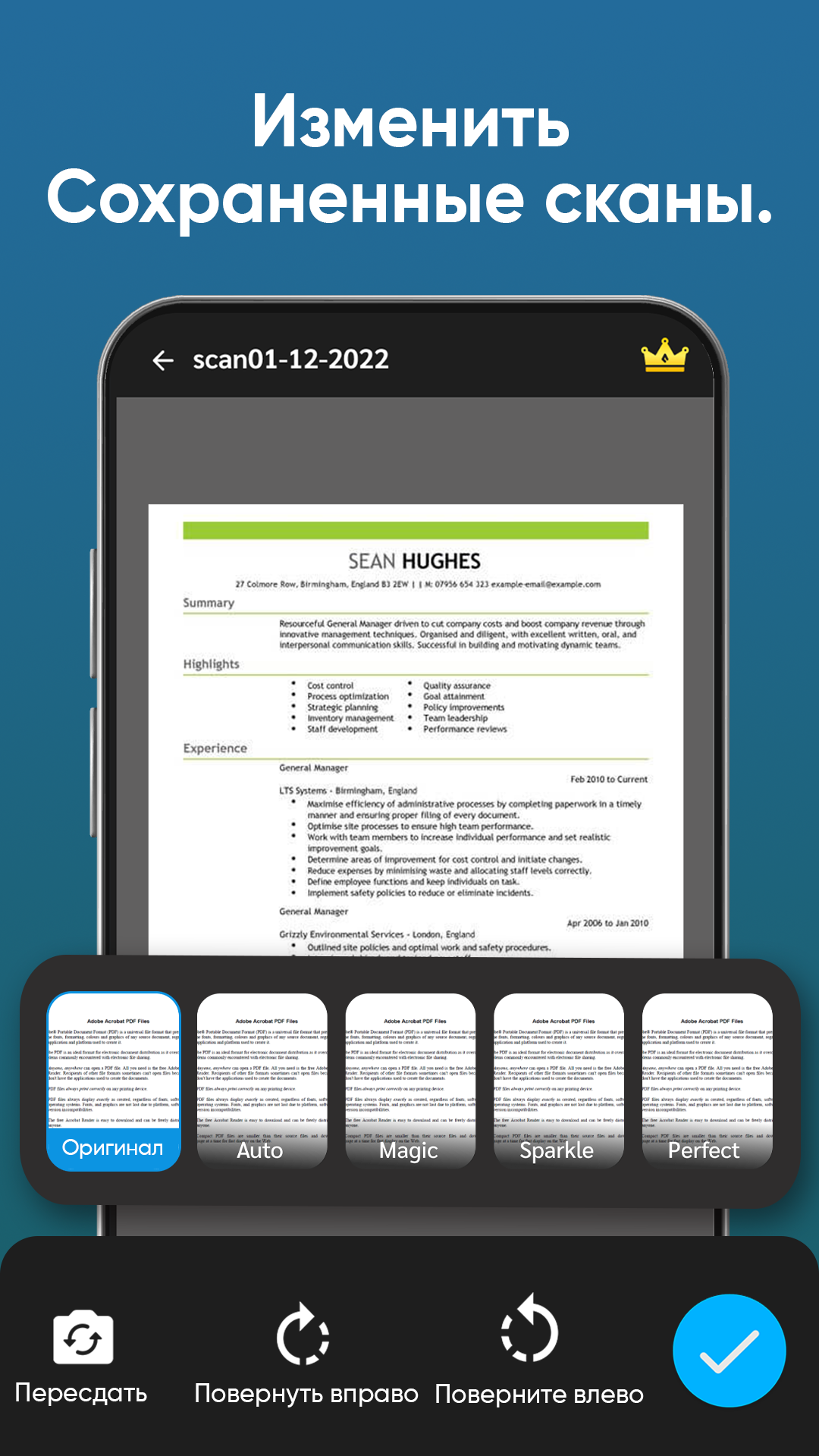 Быстро оцифровать документ Оцифруйте все важные документы с помощью камеры вашего устройства или добавьте файлы из галереи. Сканируйте документы, фотографии, электронные книги журнала рецептов, статьи, визитки, ID-карты, доски, текст на различных фотографиях, счета и создавайте PDF-файлы и многое другое с помощью сканера камеры!