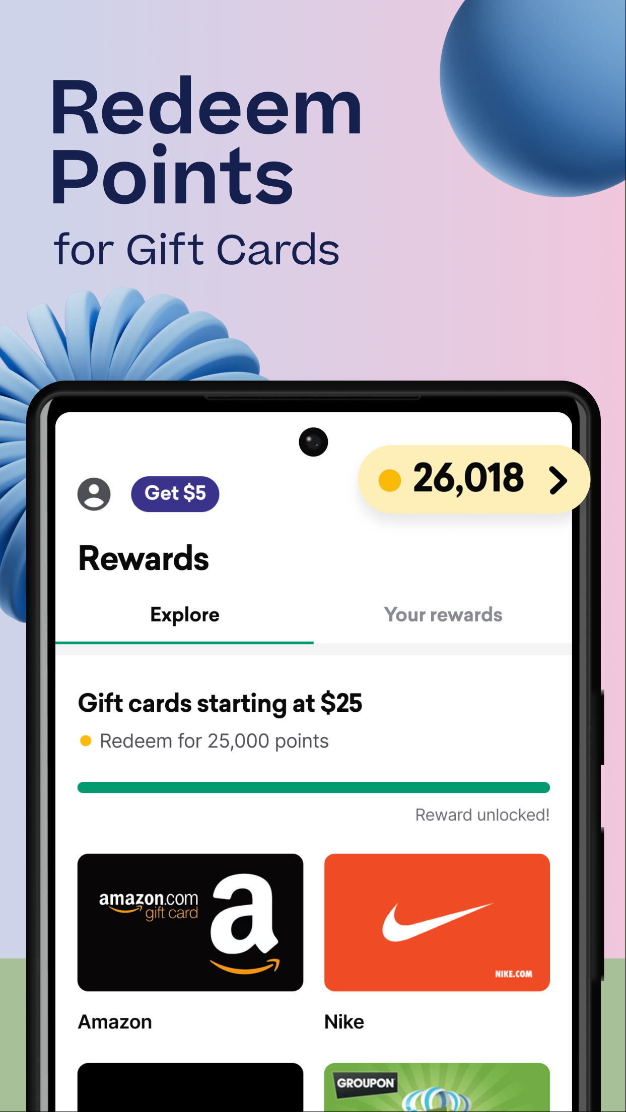 Покупайте любимые бренды и магазины, такие как Sam's Club, Target, Kroger, Sam's Club, Uber, Walmart, Nike и Sephora, и одновременно получайте возврат денег! Привяжите свою карту, а затем совершайте покупки через приложение. Отвечайте на опросы о вознаграждениях, чтобы заработать еще больше баллов! Когда будете готовы, обменяйте подарочные карты на свои награды. Подарочные карты позволят вам еще больше сэкономить на товарах ведущих брендов!