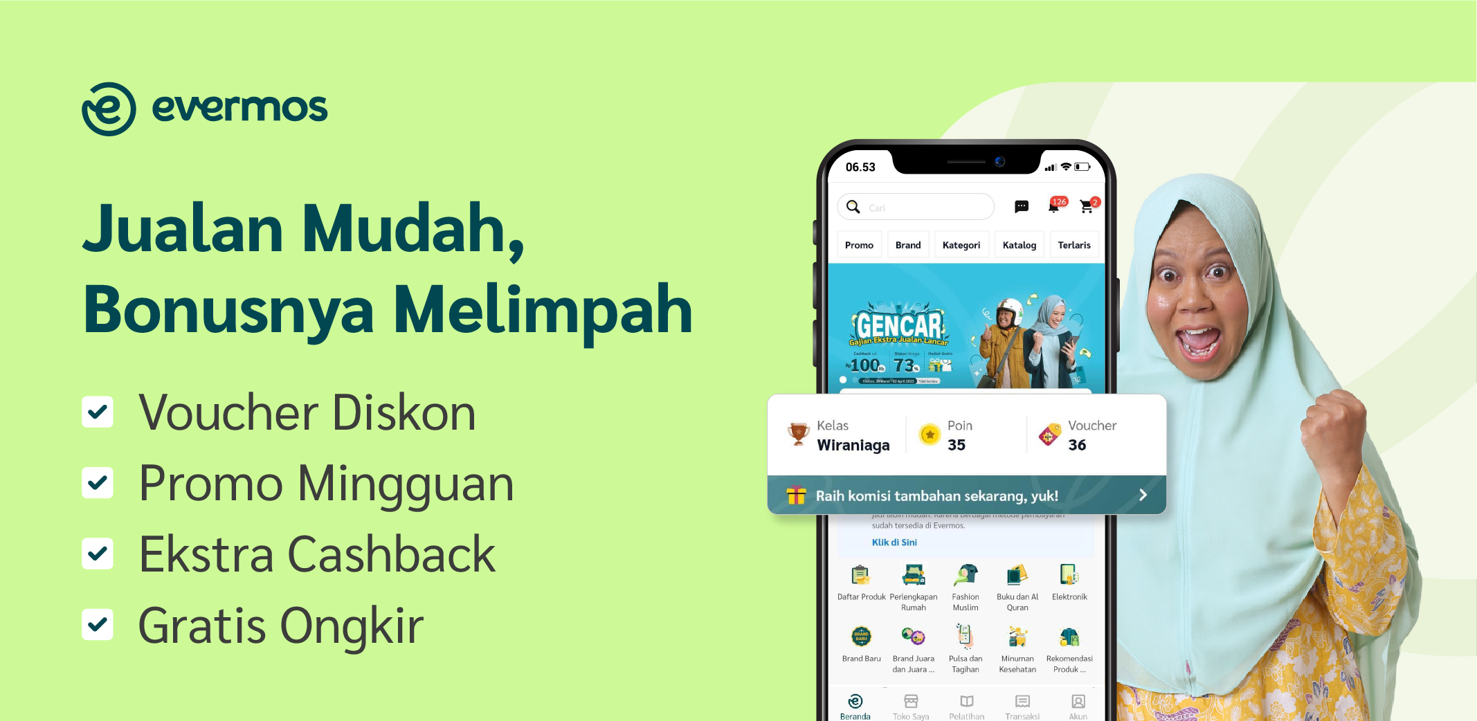 Станьте реселлером, открыв интернет-магазин на Evermos БЕСПЛАТНО! | Продавайте тысячи халяльных товаров и получайте сотни миллионов в обороте, и наслаждайтесь акциями каждый день! Будучи платформой социальной коммерции номер 1 в Индонезии, реселлеры Evermos теперь разбросаны по всей Индонезии. Для обеспечения соблюдения законов шариата в коммерческой деятельности Evermos, Evermos находится под контролем Шариатского консультативного совета (DPS). Кроме того, Evermos также выдвигает экологические, социальные и управленческие стандарты (ESG), чтобы гарантировать, что бизнес Evermos оказывает социальное воздействие и поддерживает экологическую устойчивость в долгосрочной перспективе. Загрузите приложение Evermos и найдите более 80 000 качественных халяльных продуктов и 700 оригинальных индонезийских брендов! Также наслаждайтесь интенсивными занятиями по бизнес-обучению, которые есть ТОЛЬКО в EVERMOS! ВСЕ МОЖЕТ ИМЕТЬ МАГАЗИН, ДОСТАТОЧНО HP CAPITAL Просто зарегистрируйтесь БЕСПЛАТНО в приложении Evermos, указав номер телефона, и каждый может начать онлайн-бизнес, стать торговым посредником и дропшиппингом как бизнес с многообещающими преимуществами. ИНТЕНСИВНОЕ ОБУЧЕНИЕ БИЗНЕСУ С СООБЩЕСТВОМ, БЕСПЛАТНО! Evermos также предоставляет Сообщество бизнес-обучения от Evermos и получает знания от стратегий продаж до продвижения в социальных сетях от профессиональных тренеров. Также найдите эксклюзивные знания и расширьте свою сеть через событие «Reseller Gathering». С Evermos научитесь бизнесу с нуля до отличного! ПОТОП СКИДОК НА ПЕРВУЮ ТРАНЗАКЦИЮ Воспользуйтесь специальной скидкой до 30 000 рупий* для новых реселлеров, используя промокод SATU100 или SATU50 при первой покупке продукции Evermos. * Применяются правила и условия ПРОСТЫЕ ФУНКЦИИ В ПРИЛОЖЕНИИ ЭВЕРМОС Расширьте его возможности и помогите повысить эффективность вашего бизнеса! ✔️Получайте уведомления о последних рекомендациях продуктов и скидках ✔️Увеличивайте комиссионные с помощью функции «Пригласить друзей». ✔️Максимальное увеличение продаж с помощью списков клиентов ✔️Автоматически отслеживать информацию о комиссионных и прогресс продаж ✔️Бесплатная доставка и наложенный платеж по всей Индонезии*, дополнительные комиссии, самые низкие цены и купоны на покупки только в приложении Evermos СТАНЬТЕ РЕСЕЛЛЕРОМ SULTAN И ПОЛУЧИТЕ МНОЖЕСТВО ДОПОЛНИТЕЛЬНЫХ ПРЕИМУЩЕСТВ В функции класса реселлера есть уровни классов, которые будут поощрять вас продолжать расти и постоянно стремиться. Рейтинг может быть достигнут от достижения минимальной транзакции в течение максимального периода в 3 месяца. Существуют уровни «Начинающий», «Продавец», «Мастер», «Торговец» и «Султан». Получите БЕСПЛАТНУЮ возможность совершить умру* без рисования. АКАДЕМИЯ ЭВЕРМОС Evermos стремится проводить интенсивное обучение/обучение для всех реселлеров/владельцев магазинов, студентов и студентов посредством бизнес-тренингов, маркетинга, подготовки предпринимательских навыков и формирования лидерских качеств. ПРЕМИЯ ЭВЕРМОС Forbes 30 Under 30 Asia 2022 — Розничная торговля и электронная коммерция Награды Структуры «ООН-женщины» в Индонезии за Принципы расширения прав и возможностей женщин (WEPs) 2022 — Прозрачность и отчетность Премия Financial Times и IFC за трансформационный бизнес, 2022 г. — Трансформационное финансовое решение, финансы с гендерной точки зрения Награды Cambr