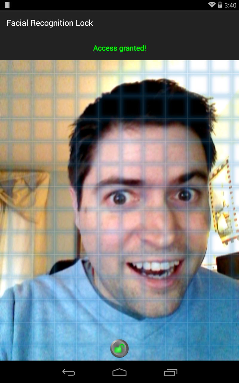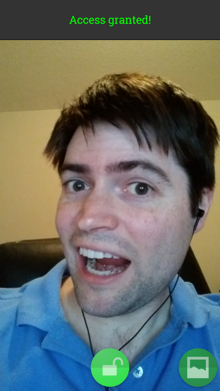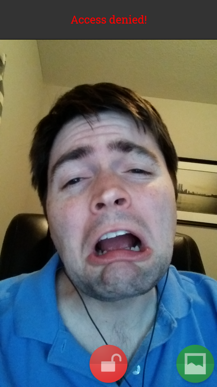 Facial Recognition Lock is meant for entertainment purposes only. Tapping on the unlock button once will always say access is denied, no matter what. Tapping on the unlock button twice will say access granted and unlock your phone. Facial Recognition Lock is a great gag for fooling your friends, or for impressing the ladies at the club.