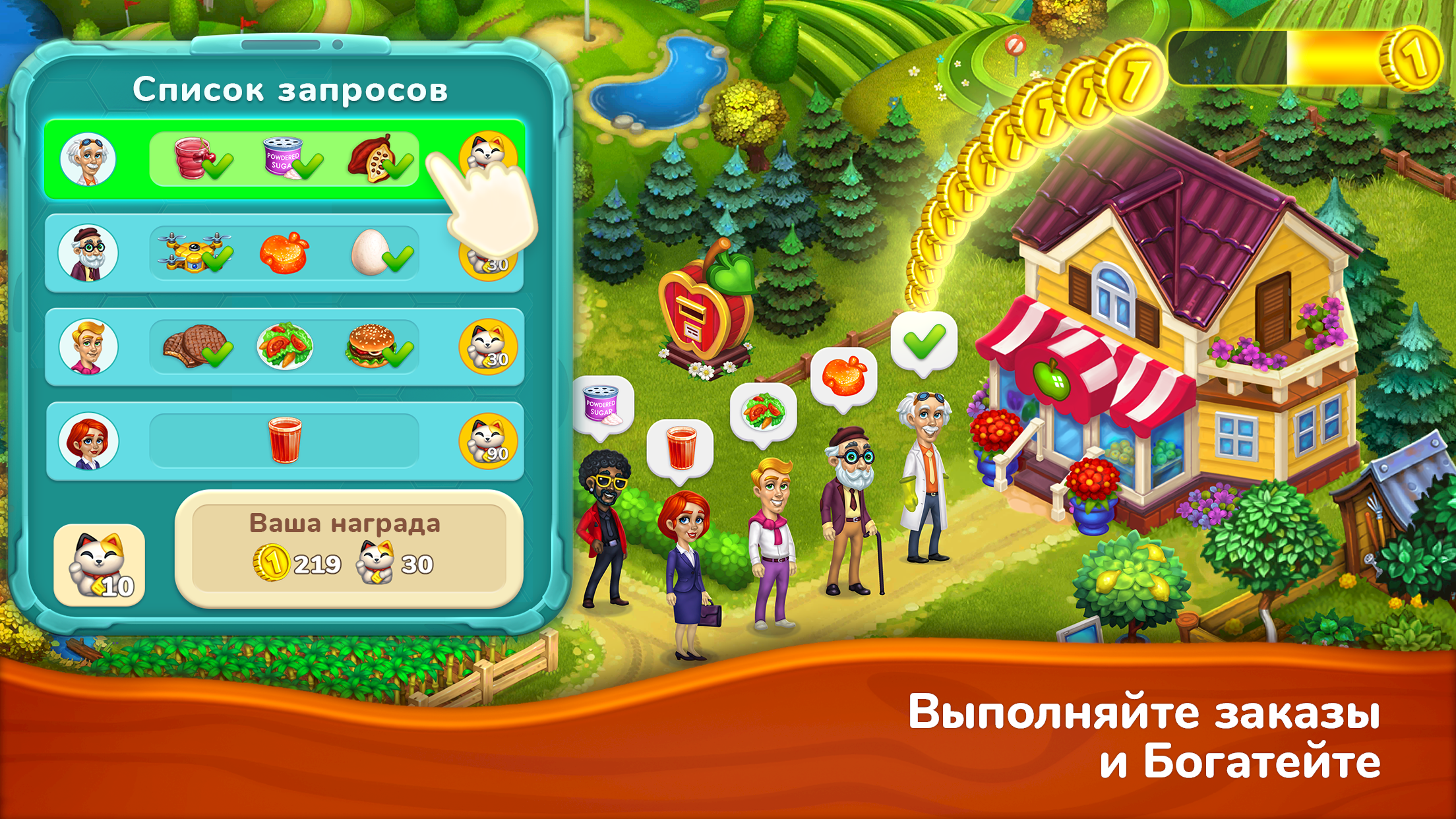 Магазин. Это центральное место вашего городка. Персонажи игры приходят сюда, чтобы купить продукцию вашей фермы. Иногда здесь бывают очереди! Продавая товары, вы зарабатываете игровые монеты и опыт.