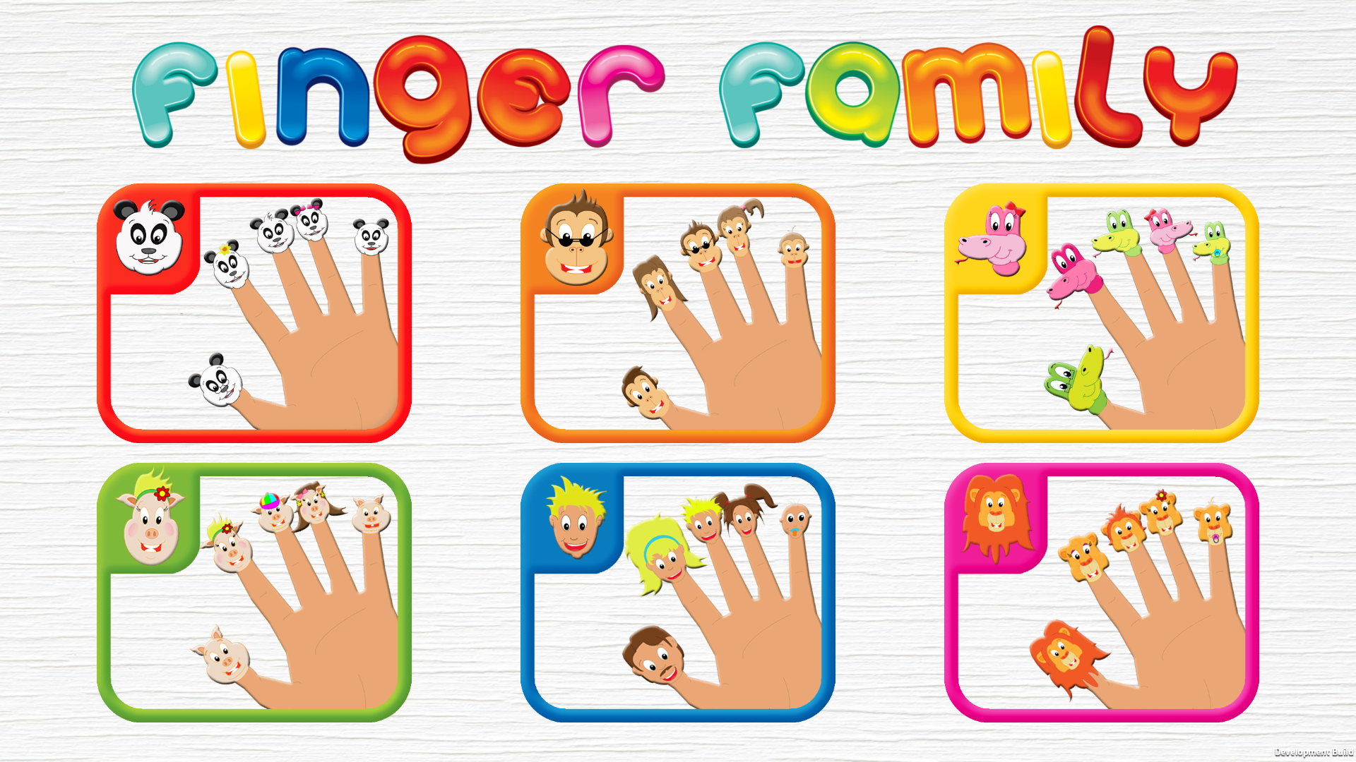 Kids’ favorite Finger Family song turned into interactive game for learning family hierarchy. Finger Family game is educational, interactive and specially designed for children. With this game children will to learn the famous rhyme and discover the natural world and family hierarchy, providing one of the best learning experience. The game offers variety of finger family play sections, including Human Finger Family, Monkey Finger Family, Giant Panda Finger Family, Snake Finger Family, Pig Finger Family, Lions Finger Family and many more to come. How to play: * Choose finger family you want to open * Use your fingers to move the family member to matching finger * Get applause and fireworks reward ones completed the whole song Finger Family song lyrics: “Daddy finger, daddy finger, where are you? Here I am, here I am. How do you do? Mommy finger, Mommy finger, where are you? Here I am, here I am. How do you do? Brother finger, Brother finger, where are you? Here I am, here I am. How do you do? Sister finger, Sister finger, where are you? Here I am, here I am. How do you do? Baby finger, Baby finger, where are you? Here I am, here I am. How do you do?"