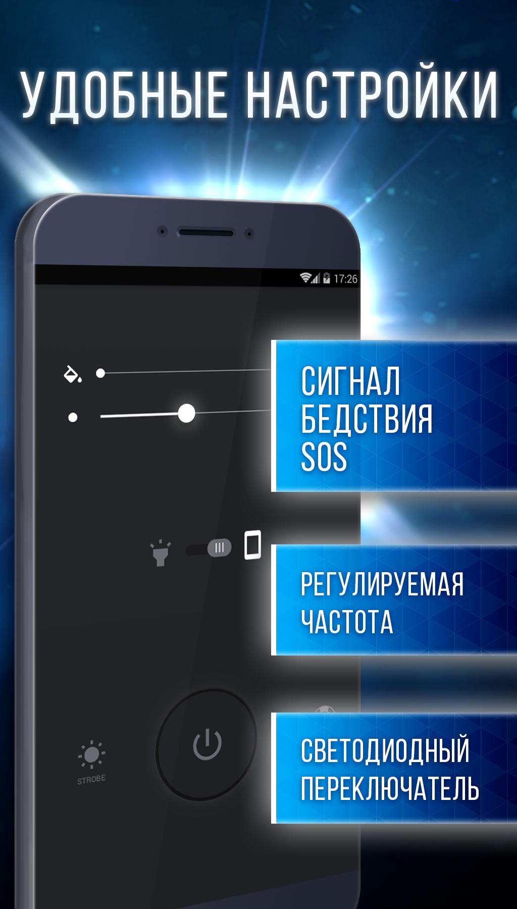Вы все еще садите батарею телефона, используя экран для подсветки? Зачем? Ведь есть наш мощный да еще и регулируемый фонарик для телефона. Сделайте свой телефон еще более функциональным, превратите его в очень яркий светодиодный фонарик одним нажатием и совершенно бесплатно! Чтобы скачать и установить цветной фонарик на планшет или телефон бесплатно потребуется лишь несколько минут, зато потом наш яркий фонарик будет служить вам верой и правдой долгое время! 💡 НЕ ПРОСТО ХОРОШИЙ ФОНАРИК, А НАСТОЯЩИЙ ФОНАРЬ! День сменяется ночью, и мы всеми способами стремимся победить наступающую темноту. Будь то на улице, дома, в машине, где бы то ни было мы ищем свет. Хорошо, если под рукой есть телефон! Однако его экран — не фонарик, яркость слабовата, да и свет рассеивается, давая видеть лишь то, что совсем рядом. Поэтому мы и советуем скачать приложение фонарик для Андроид бесплатно. Этот сверхъяркий фонарик на Андроид светит как прожектор, а самое главное: такой супер яркий фонарик у вас всегда под рукой! 🔦 СЛУЧАЛОСЬ ЛИ С ВАМИ ТАКОЕ? ✔ Приходится выходить на улицу рано утром или поздно ночью ✔ Потеряли ключи и приходится искать их в темноте ✔ Машина как назло сломалась ночью посреди дороги и приходится ее ремонтировать ✔ В доме отключили электричество и подниматься по лестнице приходится на ощупь ✔ В темноте никак не получается попасть ключом в замочную скважину ✔ ... Конечно, список можно продолжать бесконечно. Но думаю вы поняли, что в такие моменты иметь под рукой даже самый простой фонарик без рекламы — необходимость. Именно поэтому мы разработали фонарик, который занимает мало памяти. Такой бесплатный фонарик с регулировкой яркости работает без интернета и активировать мощный фонарь можно одним нажатием. 💡 ПРЕИМУЩЕСТВА ЭТОГО ФОНАРИКА Если взглянуть на обычный фонарик, что в нем важно? Чтобы фонарик без рекламы сработал, когда нужно, и светил ярко. Наш фонарь для телефона включается одним нажатием. Легкие и понятные настройки фонарика: регулировка яркости и частота мерцания позволяют настраивать самый яркий фонарик под каждую конкретную ситуацию. Фонарик из камеры работает от вспышки. Если в вашем телефоне вспышки нет, экран телефона будет светить на максимальной яркости. Итак, мигающий фонарик это: * надежный фонарик вспышка * удобный в использовании моргающий фонарик * регулируемые настройки * возможность использовать в качестве фанарика не вспышку, а экран * в фонарик скоро будет добавлен виджет для более удобного использования 🔦 Фонарики, как и лампы, основные помощники для работы в темное время суток. Мы живем в век технологий, поэтому было бы странно иметь под рукой лишь просто фонарик. Разнообразных вариантов приложений для телефона множество: фонарик лазерный позволяет использовать луч света как указку, желтый фонарик светит естественным светом. 💡 Мы идем в ногу с прогрессом, поэтому в дальнейшем добавим фонарик для телефона Андроид на звонок. Мигающий фонарик при звонке и смс оповестит вас даже если телефон стоит в режиме без звука. Функция фонарик на звонок и смс на русском очень удобна для деловых людей и учащихся, которым желательно сохранять тишину. Фонарик на вызов удобен в использовании и не привлекает внимание, поэтому фонарик, который при звонке и смс мигает, непременно пригодится! Наш фонарик прост и удобен 
