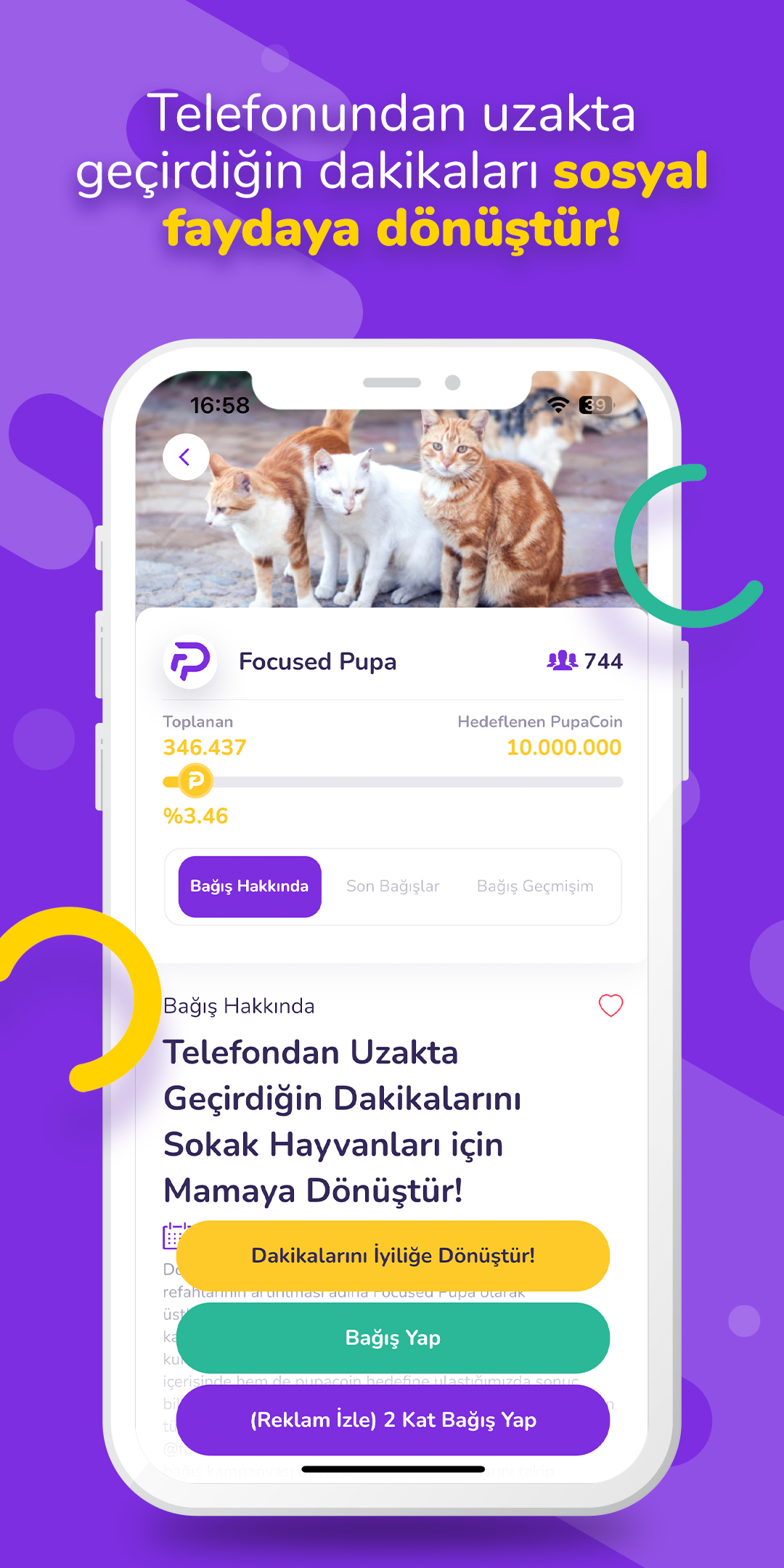Основная цель приложения; Это делается для того, чтобы пользователи сосредоточились на работе, которую они хотят выполнять, в течение определенного ими периода времени, держась подальше от своего телефона, а взамен они мотивированы, зарабатывая баллы, называемые PupaCoin.