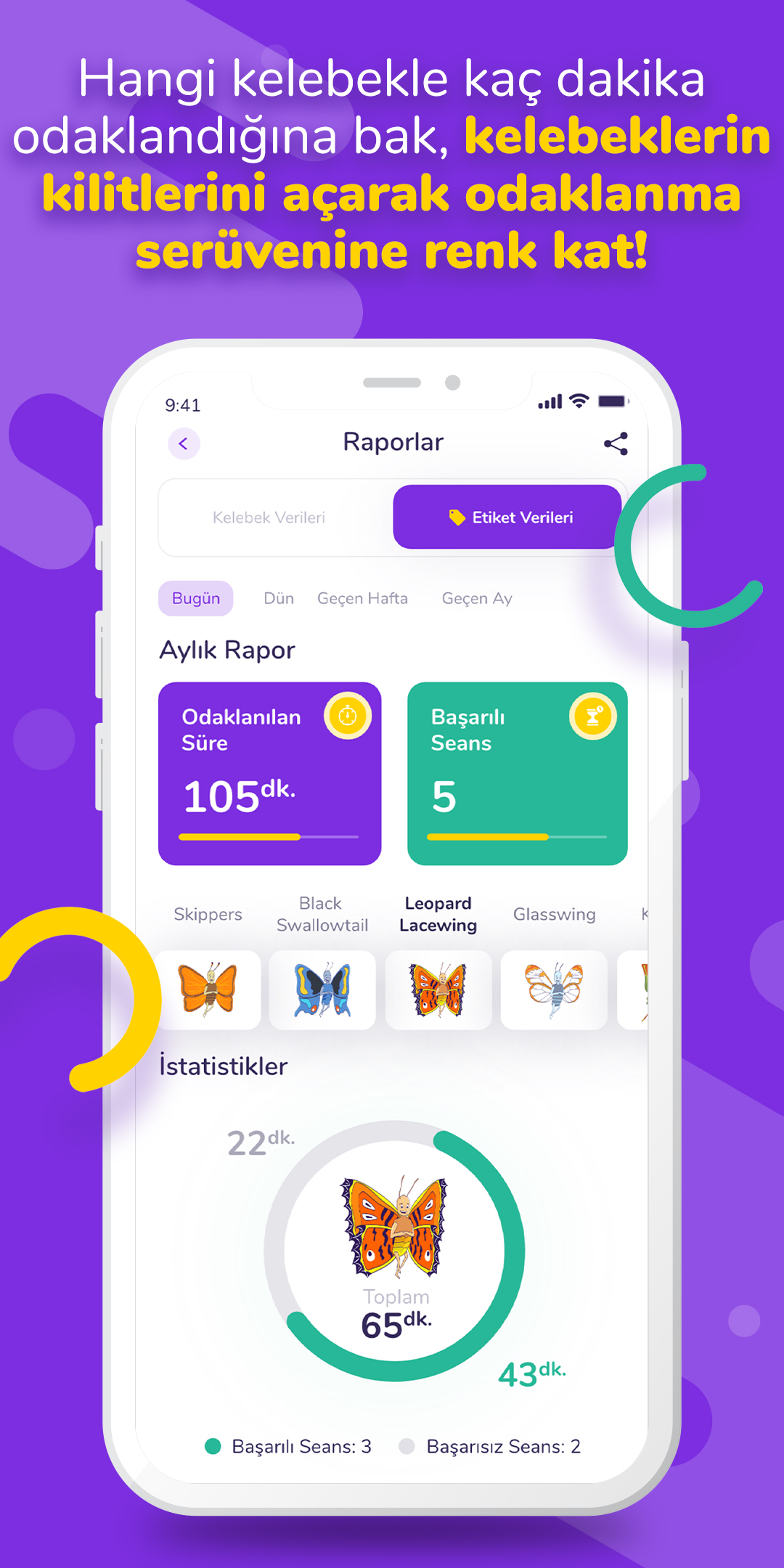 ● МОИ ОТЧЕТЫ. С помощью фильтров времени «Сегодня», «Вчера», «Последняя неделя» и «Последний месяц» вы можете просматривать статистику минут, на которых вы сосредоточились, по данным о бабочках и тегам.