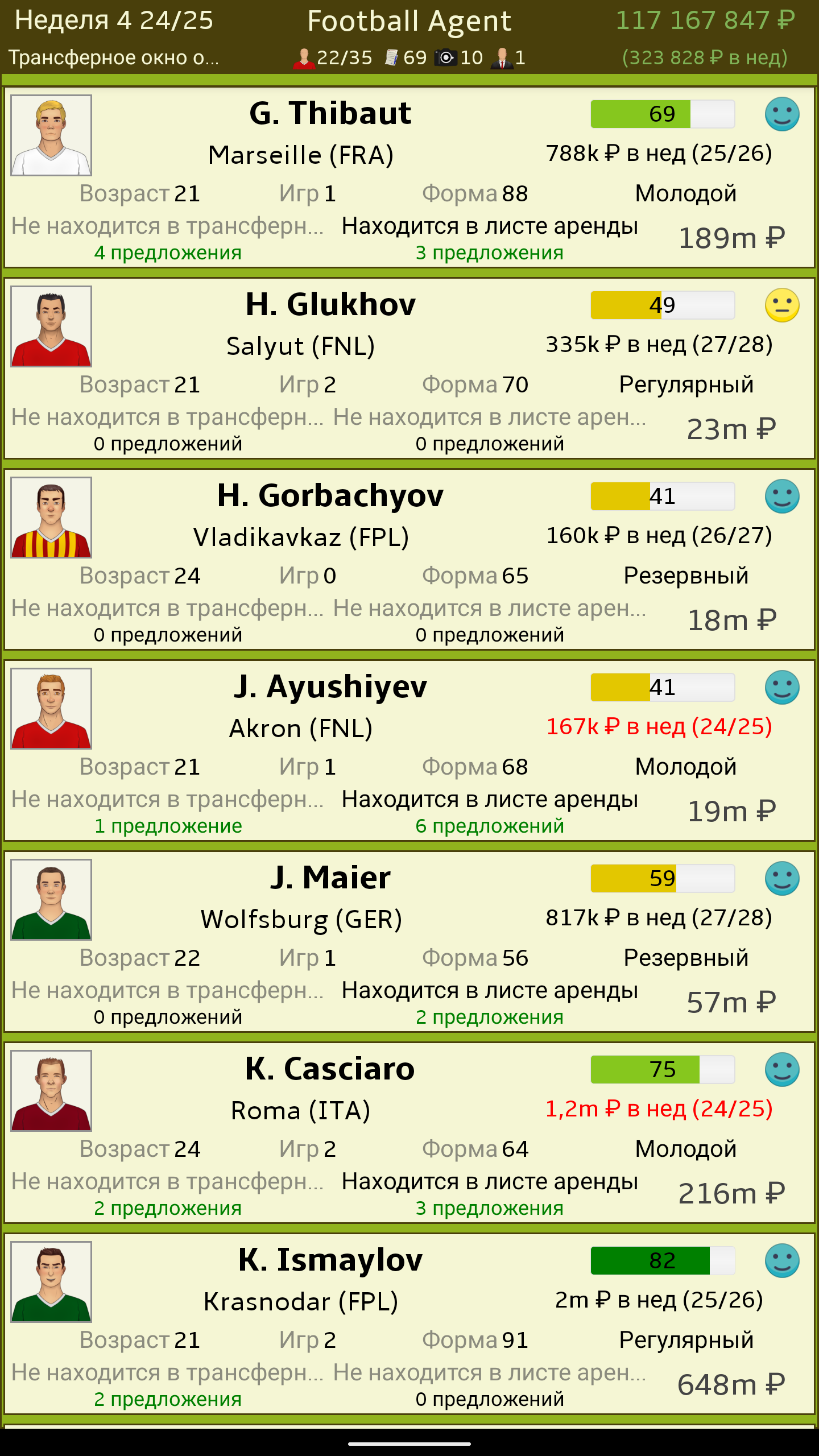 Будьте человеком, стоящим за крупнейшими предложениями в футболе. Вам нет дела до трофеев и медалей победителей. Вы заботитесь только о деньгах и счастье ваших клиентов. • Играйте в России, Англии, Испании, Германии, Голландии, Чешская Республика, Бразилия, Португалия, Турция, Польша, Франции или Италии • Договаривайтесь о трансферах от имени ваших клиентов. • Сбалансируйте счастье своих клиентов, удостоверившись, что вы получаете свою плату, чтобы найти игроков, которые могут стать следующими суперзвездами. • Скауты для обнаружения игроков, которые могут стать следующими суперзвездами • Держите своих клиентов счастливыми, решая их личные проблемы • Постройте отношения с клубами, чтобы получить лучшие предложения. • Несколько валют - ₽, Kč, $, £, € • Сравните себя с футбольными агентами по всему миру с помощью Google Play Leaderboards. • Игра доступна на русский, чешском, английском, испанском и немецком языках • Обновлено для сезона 2020/21 • Create your own game world in 60+ nations with the built-in editor Want to help translate Футбольный агент (Football Agent)? Check out https://crowdin.com/project/football-agent