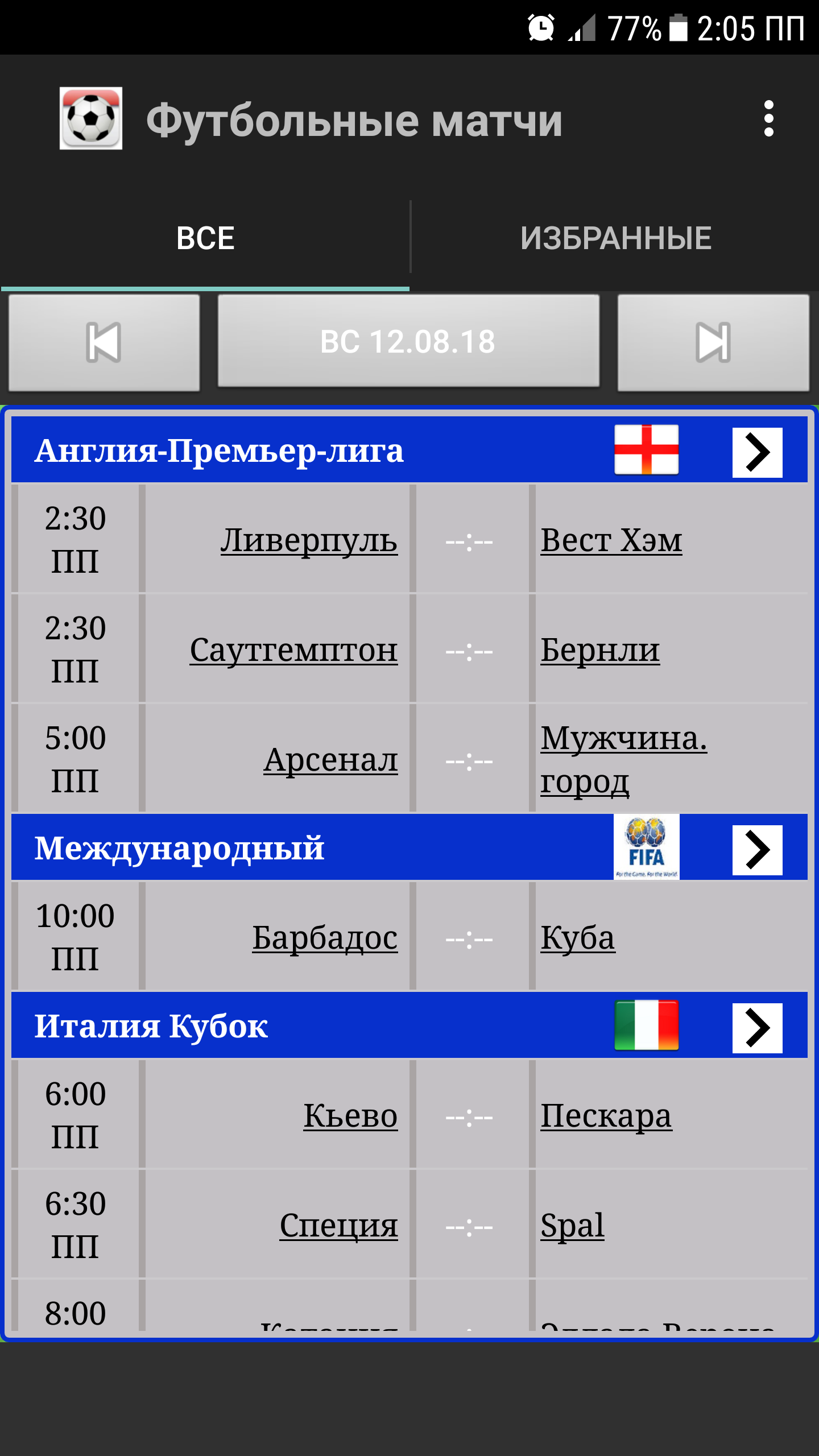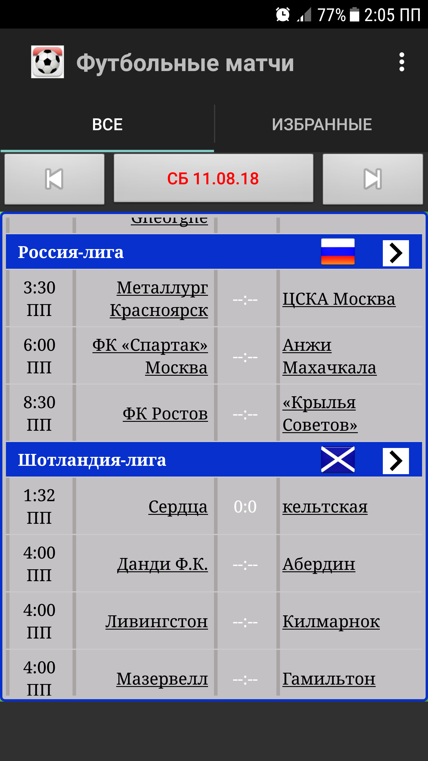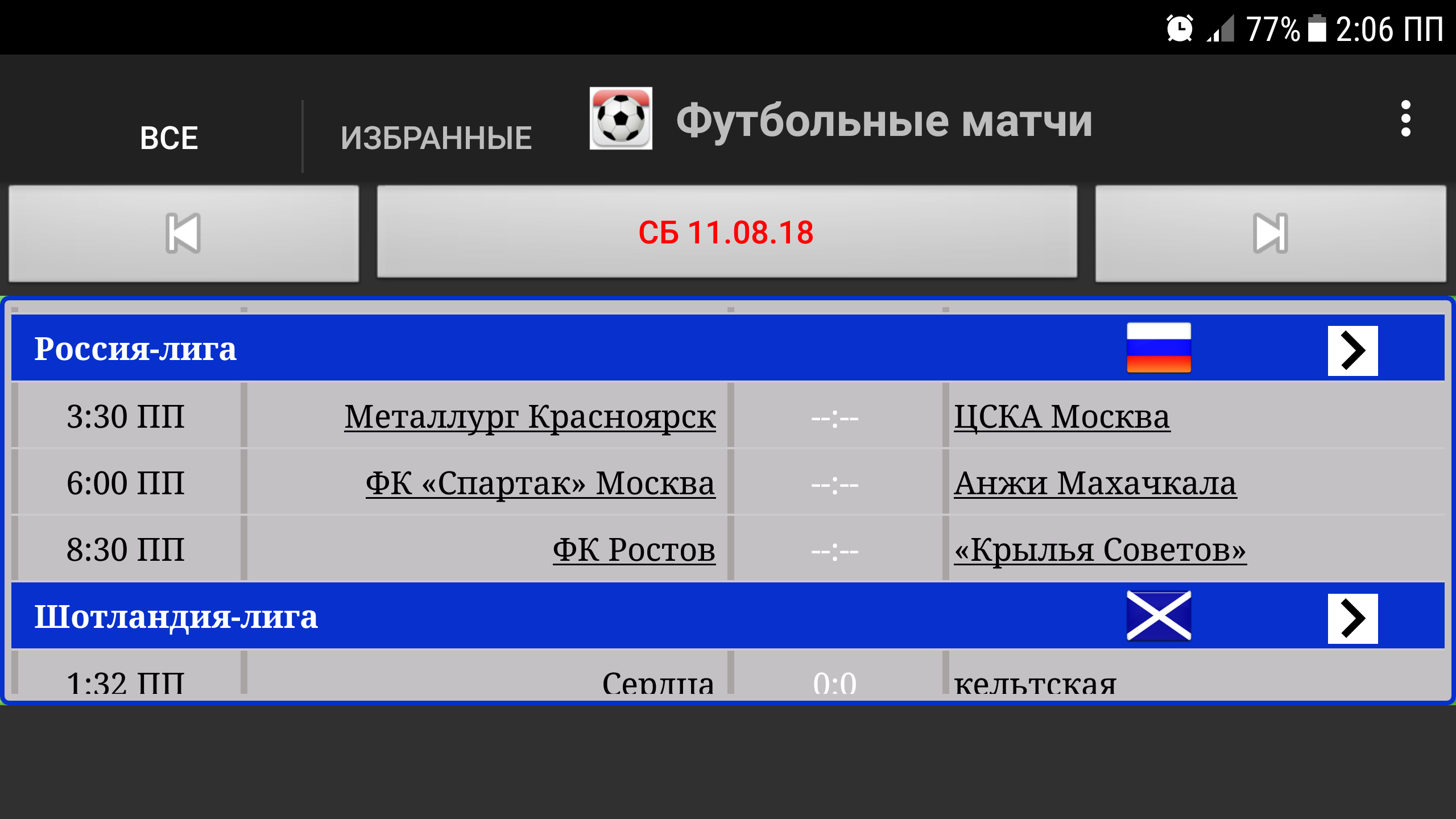 Это приложение - футбольное расписание, оно поможет вам узнать время футбольных матчей и результаты матчей в реальном времени. Вы можете узнать сегодняшние матчи или матчи в любую конкретную дату. Поддерживает фиксированные и живые результаты. Это приложение не позволит вам пропустить ни один важный футбольный матч (футбол). Основная цель - показать вам время матчей, чтобы организовать ваше время соответствующим образом. Если вы являетесь поклонником футбола / соккера / коры / куоры или любого другого названия самого популярного вида спорта в мире, то вы должны иметь это приложение. Вы можете выбрать свои любимые лиги или команды для отдельного обзора. Также вы можете нажимать на конкретный матч, чтобы добавить его в избранное. Вы можете добавить виджет, который покажет вам следующий любимый матч. Вы можете разрешить уведомления о любимых матчах. Вы можете просматривать только избранные матчи или все матчи, а также просматривать матчи, отсортированные по времени или сгруппированные по турнирам. В настоящее время поддерживаются ТОЛЬКО эти чемпионаты: Испания: Ла Лига и Копа Дель Рей Англия: Английская премьер-лига, Кубок английской лиги, Лига чемпионов Англии, Лига один и Кубок Англии. Италия: Серия A, Серия B и Кубок Италии Германия: Бундеслига, Бундеслига2, Лига3 и Кубок Германии Франция: Лига1 и Кубок Франции Нидерланды: Эредивизие и Кубок Португалия: Лига и Кубок Шотландия: Лига и Кубок Бразилия: Бразильская лига "Brasileiro Série A" и Кубок, Паулиста, Кариока, Гаучо Аргентина: Аргентинская лига "Клаусура" и Кубок Аргентины Турция: Турецкая лига "Süper Lig" и Кубок Турции (Соединенные Штаты Америки) США и Канада : MLS Высшая лига футбола MLS Soccer Мексика Апертура Египет: Египетская лига и Кубок КСА: Саудовская лига, Лига1 и Кубок Ирак: Иракская лига и Кубок Марокко: Лига, Кубок и Суперкубок Марокко Иран: Лига, Кубок и Суперкубок Иордания: Лига, Кубок и Суперкубок Оман: Лига, Кубок и Суперкубок Парагвай: Лига, Кубок и Суперкубок Румыния: Лига, Кубок и Суперкубок Япония: Лига, Кубок и Суперкубок Россия: Лига, Кубок и Суперкубок Судан: Лига, Кубок и Суперкубок Тунис: Лига, Кубок и Суперкубок Швейцария: Лига, Кубок и Суперкубок ОАЭ: Лига, Кубок и Суперкубок Уругвай: Лига, Кубок и Суперкубок Кувейт: Лига, Кубок и Суперкубок Колумбия: Лига, Кубок и Суперкубок Чили: Лига, Кубок и Суперкубок Алжир: Лига, Кубок и Суперкубок Австралия: Лига, Кубок и Суперкубок Бельгия: Лига, Кубок и Суперкубок Ливан: Лига, Кубок и Суперкубок Сирия: Лига, Кубок и Суперкубок Ливия: Лига, Кубок и Суперкубок Палестина: Лига, Кубок и Суперкубок Украина: Лига, Кубок и Суперкубок Хорватия: Лига, Кубок и Суперкубок Европа Чемпионы УЕФА: Евро, Лига чемпионов УЕФА и Лига Европы Африка: Кубок африканских наций, Лига африканских чемпионов, Кубок африканских конфедераций Азия: Кубок наций Азии, Лига чемпионов Азии, Кубок конфедераций Азии Америка: Concaf, Copa America, Copa Libertadores, Concaf Champions League и Copa Sudamericana Кубок Персидского залива "Халиджи" Международные матчи, как товарищеские, так и официальные Отборочные матчи Чемпионата мира, Чемпионат мира, Клубный чемпионат мира ФИФА, Кубок конфедераций ФИФА Бразилия 2014 Россия 2018 Катар 2022 Доступно также для ios: https://itunes.apple.com/app/id962935163 Вы можете общаться с нами по электронной почте или на нашей странице в facebook http://www.facebook.com/Elsayadappsmobile.