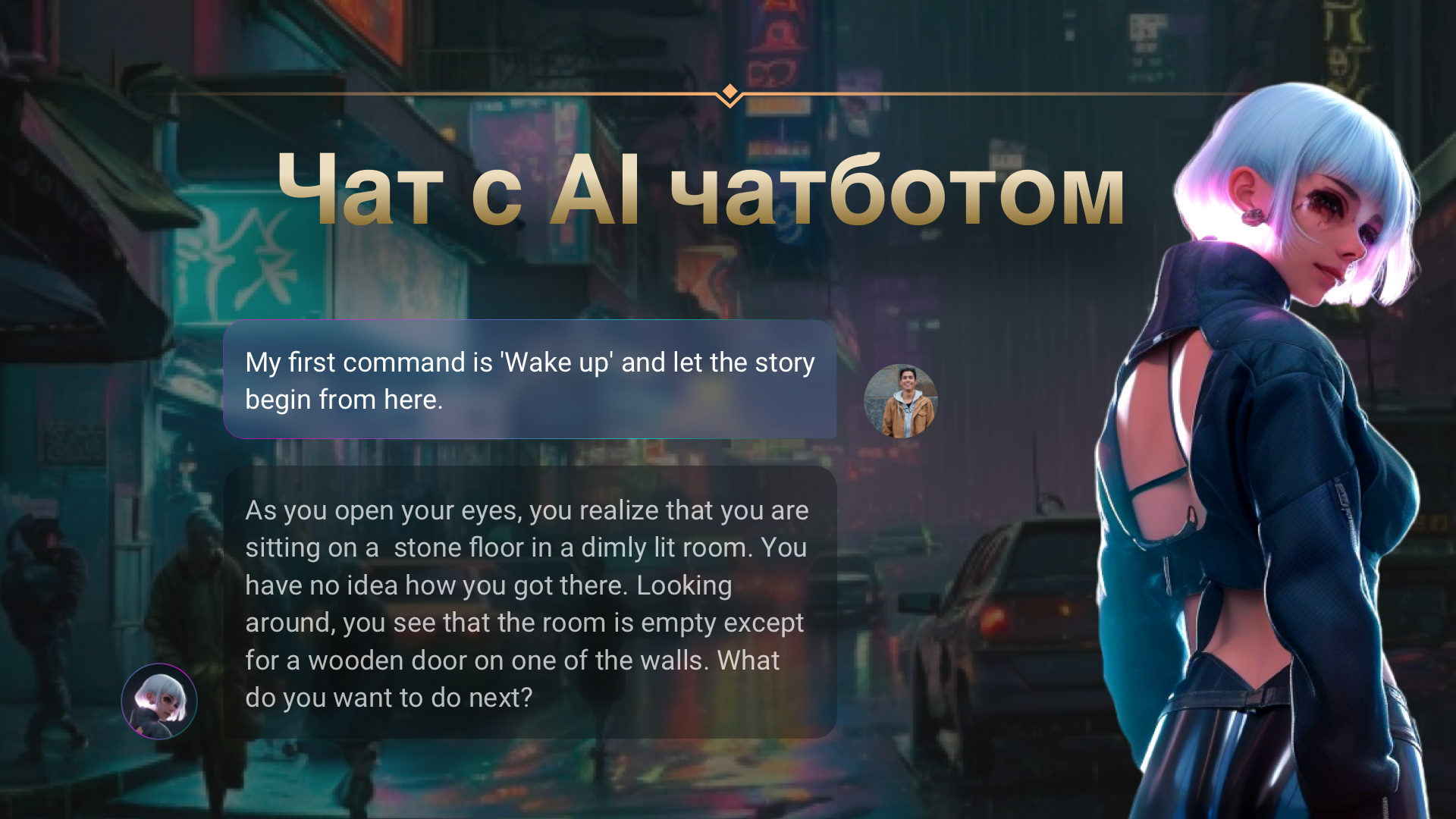 ChatJoy — это открытая текстовая ролевая приключенческая игра (RPG) с искусственным интеллектом, основанная на технологиях ChatGPT, GPT-4 и GPT-3 от OpenAI. Исследуйте неизведанный мир и станьте любым персонажем с помощью ChatJoy и испытайте самую настоящую приключенческую ролевую игру! Добро пожаловать в новую приключенческую игру от чат-бота ChatJoy AI — Hero's Legend: Kingdom Hearts! В этой текстовой игре вы будете исследовать открытый мир и свободно исследовать древние храмы, небесные острова и другие древние руины. Как страж, вы отправитесь в сложное и полное головоломок путешествие, чтобы спасти принцессу и остановить план злых сил. По ходу вашего приключения вы откроете множество удивительных секретов, некоторые из которых могут даже вызвать у вас слезы. Kingdom Hearts предлагает вам бесчисленные сюрпризы и возможности испытать себя и отправиться в бесконечные приключения! Одной из самых захватывающих особенностей ChatJoy AI Chat Bot является приключенческая функция. Ролевая приключенческая функция ChatJoy — отличный способ сбежать в другой мир и повеселиться с друзьями или другими пользователями. Предпочитаете ли вы захватывающее приключение по исследованию неизведанной земли, тайну и интригу древнеегипетской мифологии или азарт исследования глубин космоса, в ChatJoy на базе ChatGPT каждый найдет что-то для себя. В дополнение к приключенческой функции ChatJoy, управляемый ChatGPT, также предоставляет пользователям доступ к Книге мудрости — ценному ресурсу для тех, кто ищет руководство и совет. Книга Мудрости — это хранилище знаний, к которым вы можете обратиться в любое время, чтобы получить помощь в решении ваших проблем или проблем. Если вы ищете вдохновение, мотивацию или ответы на важные жизненные вопросы, Книга Мудрости поможет вам. Кроме того, ChatJoy использует технологию ChatGPT и предлагает ряд полезных функций, включая голосовой ввод и преобразование речи в текст, поэтому вы можете легко общаться в чате, где бы вы ни находились. Кроме того, вы можете экспортировать свои записи чата для дальнейшего использования или просто на память. Наконец, ChatJoy постоянно развивается и совершенствуется благодаря передовой технологии искусственного интеллекта, на которой он основан. По мере того, как вы взаимодействуете с ChatJoy на платформе Chat GPT и предоставляете обратную связь, алгоритмы ИИ обучаются и адаптируются, что приводит к более персонализированному и увлекательному общению для вас. В заключение, ChatJoy AI Chat Assistant, работающий на API ChatGPT и GPT-4, та же модель, которая используется в продукте ChatGPT, представляет собой инновационное и захватывающее приложение для чата, от его персонализированной функции приключений до полезной Книги мудрости и передовой технологии искусственного интеллекта, ChatJoy AI В друзьях есть все, что вам нужно, чтобы весело провести время в чате. Попробуйте AI ChatBot ChatJoy и отправляйтесь в приключение, созданное специально для вас! Отказ от ответственности - Это приложение официально не связано с какой-либо третьей стороной и не имеет права на это. Это приложение предоставляет только мобильный интерфейс для взаимодействия с AI Chat. - Это не Chat GPT, мы никоим образом не связаны с OpenAI, ChatGPT или их филиалами. - Мы никоим образом не связаны с Quillbot, Grammarly, Wordtune, Jasper AI, Copy.AI, Rytr, Ginger, AI Writer, Writesonic, Anyword, Hyperwrite, ChatGPT или их филиалами. - Мы не собираем и не храним данные, используемые в приложении.