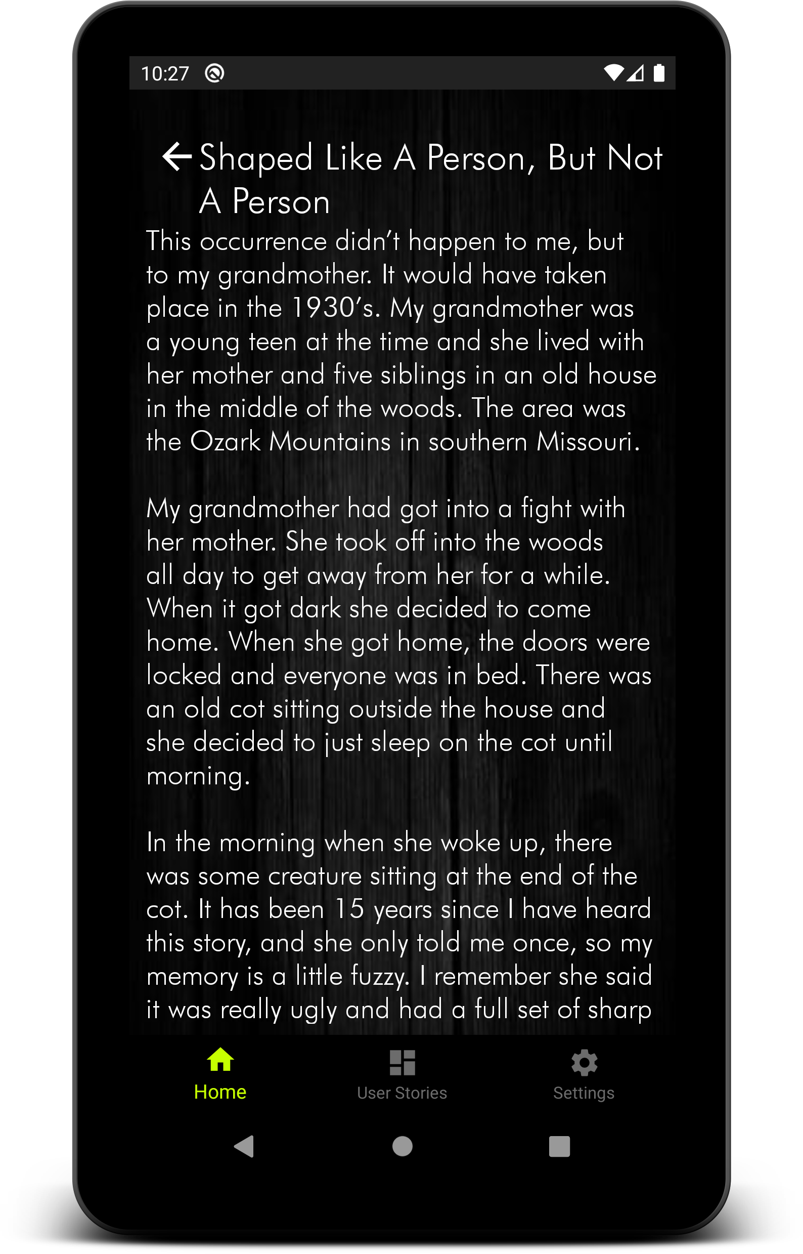 Это приложение расскажет вам паранормальные деятельности, которые испытывают различные люди из различных частей мира. Если вы не верите в призраков вам следует прочитать эту историю и решить, будет призраком, представленные в этом мире или нет. Будьте осторожны при прочитайте эту stories.All являются реальными. В традиционной веры и вымысла, призрак душу или дух умершего человека или животного, которые могут появиться в видимой форме или других проявлений, к жизни. Описания появление призраков широко варьируются от незримого присутствия в полупрозрачной или едва заметные тонкие формы, реалистичные, жизнь-как видение. Преднамеренная попытка связаться с духом умершего известен как некромантия, или в спиритизм, как сеанс. Вера в проявлениях духи умерших широко распространена, начиная с поклонения анимизма или предка в дописьменной культур. Некоторые религиозные обряды, погребальные обряды, заклинания и некоторые практики спиритизма и ритуальной магии, которые специально разработаны, чтобы успокоить духов умерших. Призраки, как правило, описывается как одиночные сущностей, которые преследуют конкретных местах, объектов или людей, которым они были связаны с в жизни, хотя рассказы о фантомных армии, призрак поезда, призрак корабля, и даже призраки животных были также рассказал.