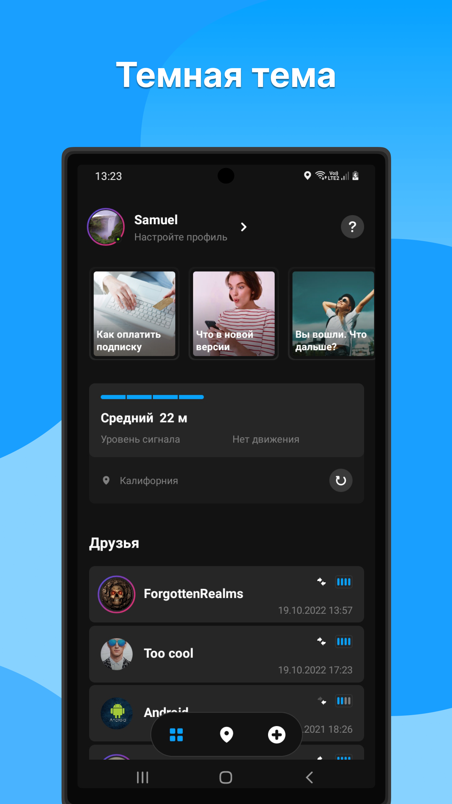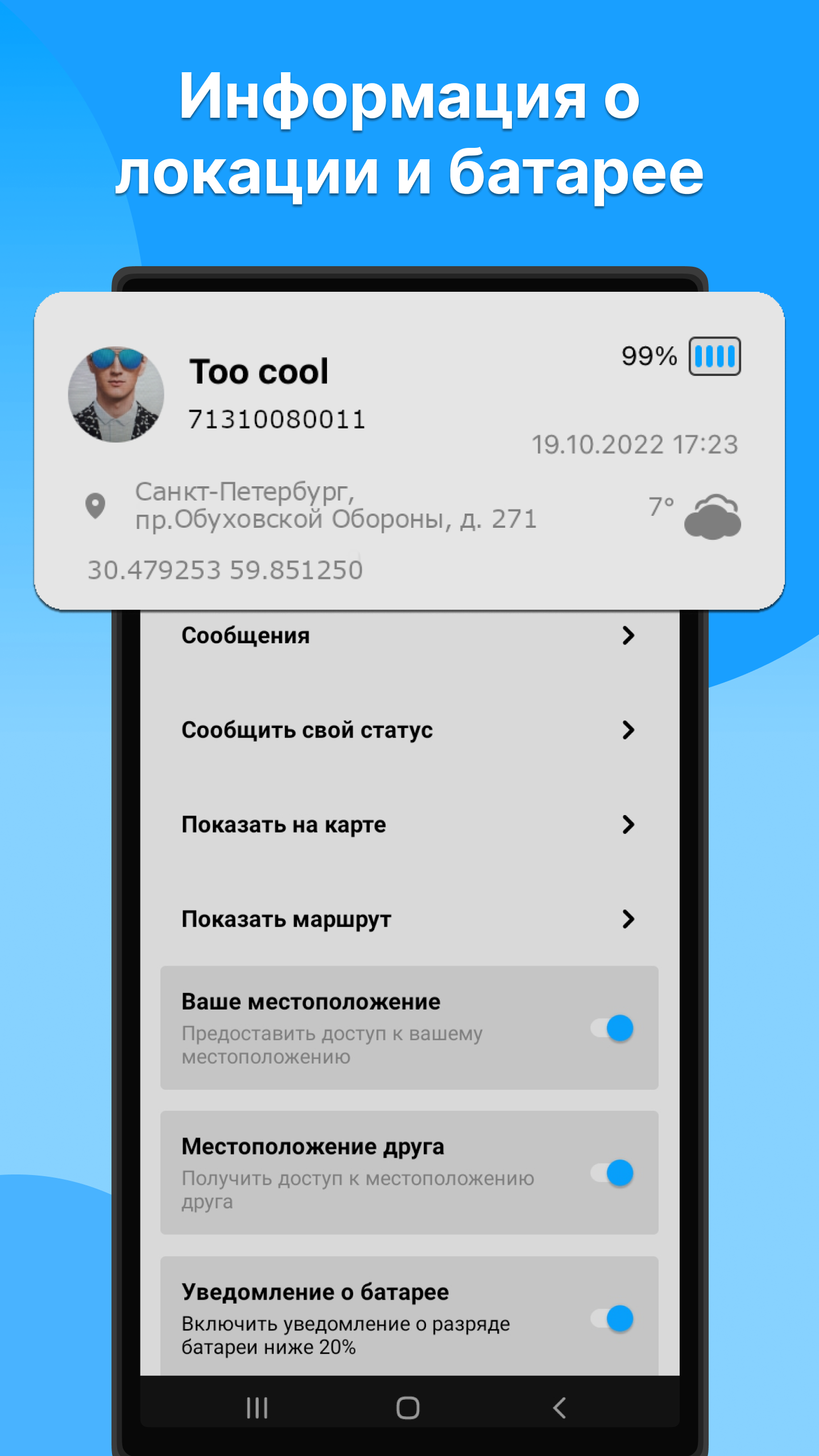 Простой вход по номеру телефона. Близкие смогут просто подписаться на ваше местоположение и отслеживать местонахождение в режиме реального времени и только с вашего согласия. Вы, в свою очередь, тоже сможете найти их: удобная карта и бесплатное пользование!