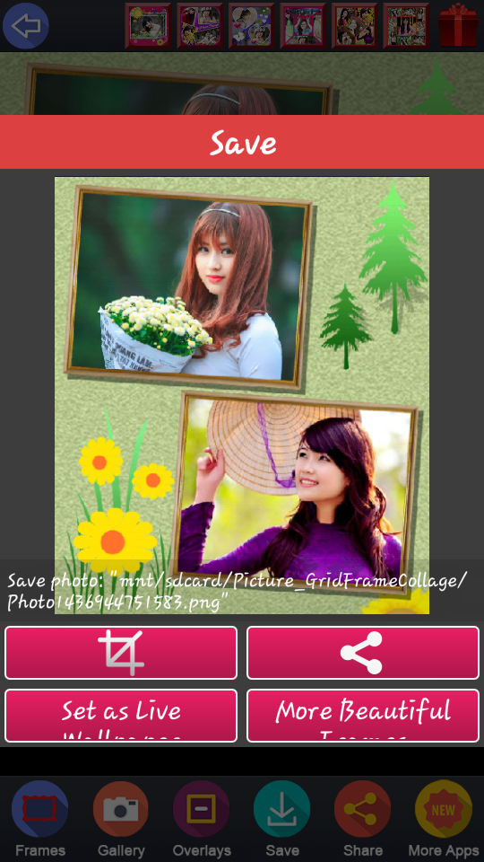 Grid Frame Collage is a software photo editing, latest photo collage maker, very professional, total FREE 100%, easy to make photo grid. Grid Frame Collage collage your photos to make photo grid very artistic. Grid Frame Collage has over 100 art frames very beautiful and artistic. Only few steps very simple: select photo, rotate, collage, resize, decorate ...you had a wonderful photo. FEATURES: - FREE 100%, No SMS, No require internet to use it - Friendly interface, simple design, easy to use and collage to make photo grid - Over 100 art frames, gird frames, love photo frames very beautiful - Choose the images from gallery or take picture from your camera - Move, zoom in, zoom out, pan around the image to fit the frame - Auto save photos to sdcard/Picture_GridFrameCollage/ and show them in gallery - Share photo via social networks : Facebook, Instagram, Twitter, Picasa, G+, Email, SMS, Zalo, v.v… - Set photo as live wallpaper with falling stars and meteor shower effects If you are not proficient Photoshop software then application Grid Frame Collage is a perfect choice to be able save your sweet memories with our collection of frames very art and romantic