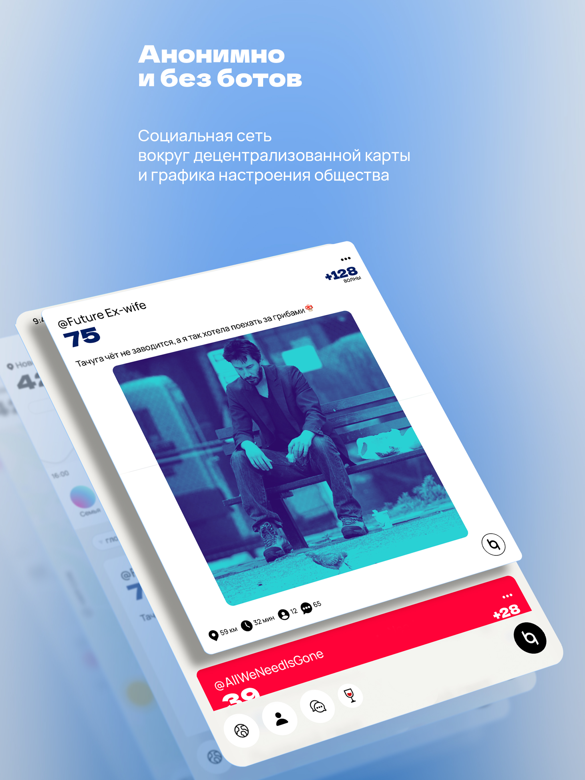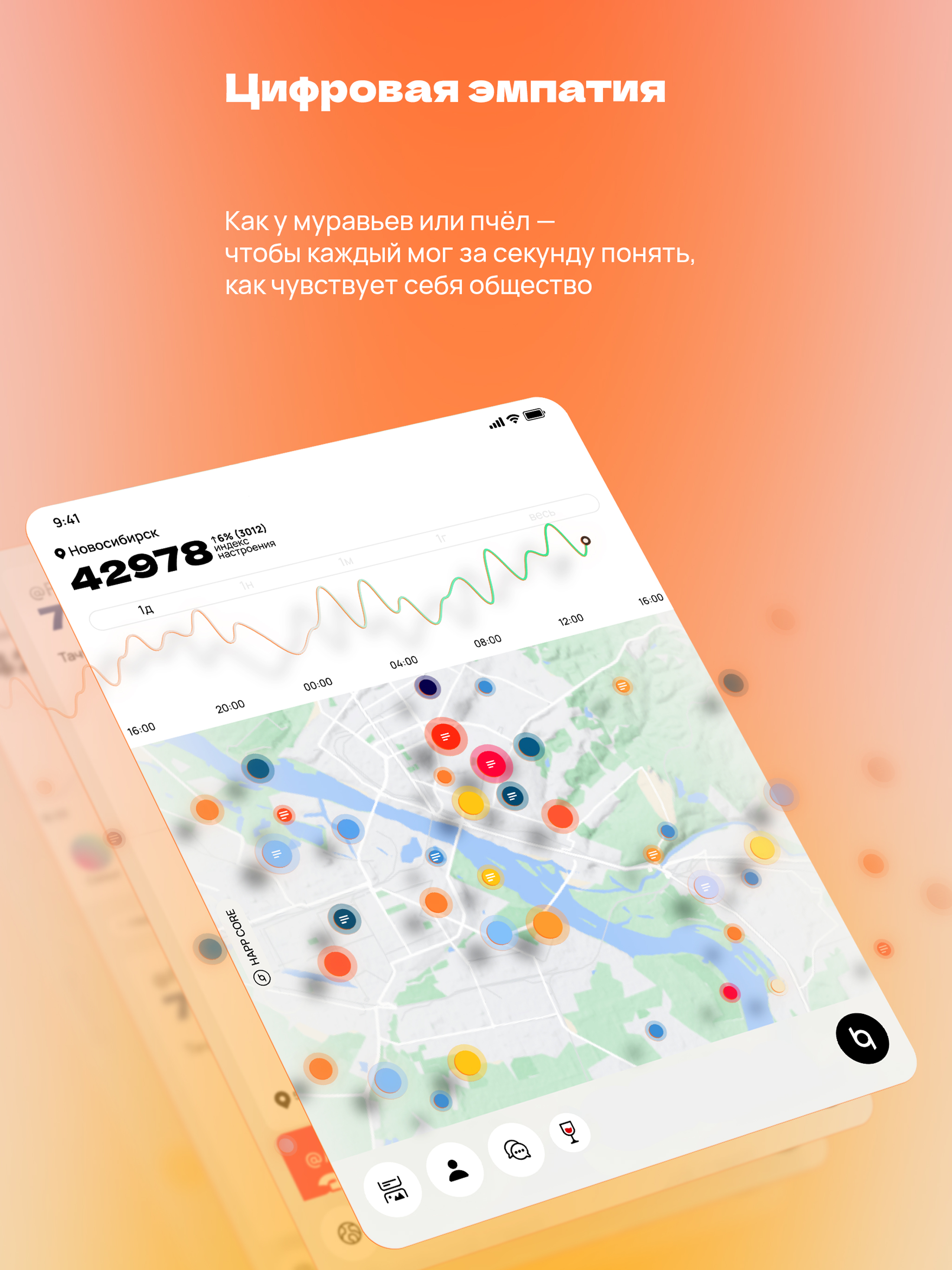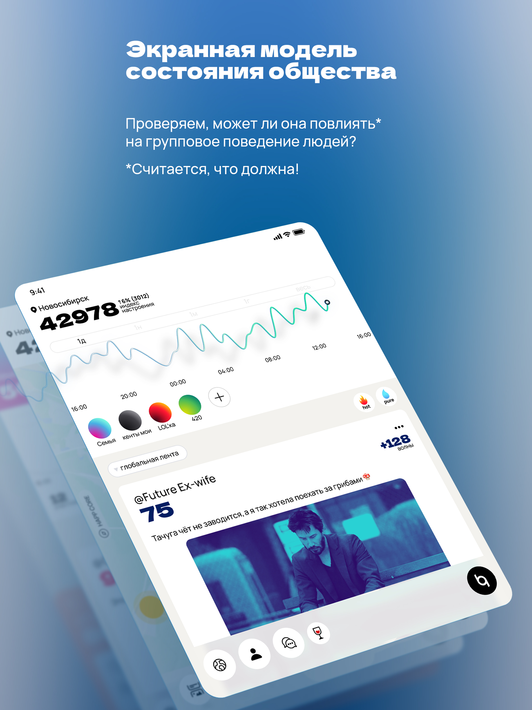 Мы верим, что сейчас, когда общение становится компьютеризированным и дистанционным, эмоциональная связь между людьми заслуживаем особого внимания. Особенно между семьей и друзьями. Как поется в одной песне "Важней всего погода в доме..." Поэтому мы предлагаем простейший инструмент для сохранения эмоциональной связи с близкими - коллективный график настроения. Попробуйте, пусть это будет экспериментом. Кроме того, вы можете создать аналогичные графики и для других кругов общения, например, для коллег. Таким образом вы сможете элементарным способом быть в курсе общего настроения внутри рабочего коллектива. А также мы предлагаем глобальный индекс настроения, чтобы взглянуть на тему счастья и настроения еще на большем масштабе. Здесь Хапп выступает в роли графика настроения общества - как аналитический инструмент. Вспомните события по присоединению Крыма Россией, выборы президента США или любой вопрос глобальной экологии: столько шумихи, и все это канет в небытие, будет забыто, мы же предлагаем механизм, который сможет выразить распределенную информацию в виде цифры и графика, который понятным образом отразит настроение общества по тому или иному вопросу - покажет настоящую картину, независимую от точки зрения СМИ и государства. Мы уверены, что должны существовать более современные и эффективные инструменты выражения общественного мнения нежели кровопролитные протесты и уличные беспорядки, которые, пожалуй, являются уделом первобытного общества. Когда весь мир только и дело, что говорит о построении устойчивого будущего: как вообще можно создать что-то устойчивое, если мы не можем измерить, как наши решения и поступки влияют на жизнь общества? - Хапп, как раз такой инструмент, который позволит зафиксировать эффект происходящего и наглядно его представить. В конце концов, это необыкновенная возможность создать историю атрибутированную параметром счастья, и с помощью ее отправить сообщение в будущее о своих ошибках и достижениях. Нам кажется, что люди в будущем бы посмеялись, если бы зафиксированными оказались только параметры ВВП стран и прочие экономические показатели. Все-таки счастье выглядит гораздо более важным параметром. Мы искренне верим, что настроение человека играет большую роль в его жизни, а сумма настроений всех людей играет колоссальную роль в жизни этого мира. Мы вдохновлены идеей визуально представить сумму настроений всех людей в реальном времени на карте мира, как сейчас на ней показывают погоду - мы создаем геолокационный индекс настроения и его историю - присоединяйтесь! Со всей благодарностью к интернету за то, что он сделал бесчисленное количество людей ближе онлайн, мы чувствуем, как в то же время он разительно увеличивает расстояние между людьми, находящихся рядом друг с другом в реальном мире. Мы предлагаем геолокационный чат как площадку, на которой можно общаться с теми, кто имеет наибольшее значение - с людьми, которые вас окружают. Представляете воздух, наполненный мыслями, окрашенными в цвет их настроения? Поделитесь своим настроением с миром! Разделите счастье или поддержите человека в трудную минуту. Расскажите, что происходит с вами и узнайте наиболее актуальную информацию вокруг вас или на другом краю света - только представьте, все это в контексте настроения. Это потрясающе! - Поп