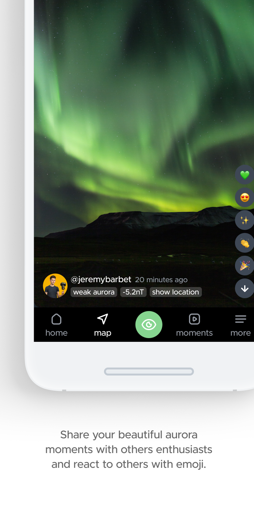 * Моменты полярного сияния: делитесь фотографией полярного сияния, которое вы видите, с другими пользователями, указывая местоположение, время и силу полярного сияния, и реагируйте на фотографии других.