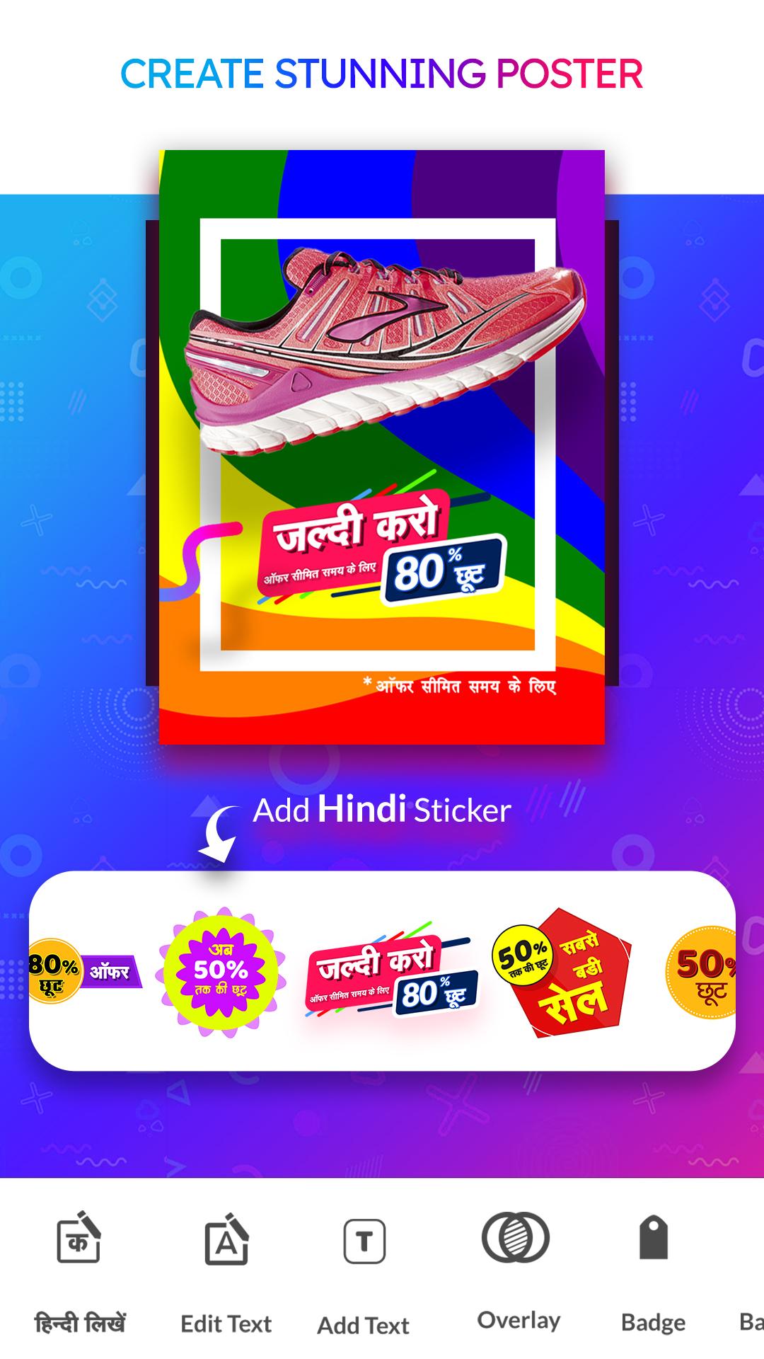 Создавайте удивительные и потрясающие маркетинговые и рекламные плакаты на хинди. Рекламные плакаты на хинди, рекламные баннеры на хинди и листовки для мероприятий на хинди для вашего бизнеса. Одно из лучших онлайн-приложений для создания плакатов и флаеров, доступных в магазине Google Play. Hindi Poster Maker - это простое в использовании приложение и очень простое приложение для создания плакатов. Вы можете мгновенно создавать высококачественные профессиональные плакаты на хинди, такие как объявления о предложениях, рекламные плакаты, обложки с фотографиями, рекламные баннеры, рекламные объявления, дизайнерские листовки, визитные карточки и пригласительные билеты. Вы можете написать текст на хинди с помощью потрясающей клавиатуры на хинди и украсить свой плакат различными удивительными наклейками на хинди. Плакаты и листовки - лучший способ рекламировать свой продукт и услуги в социальных сетях. С помощью этого приложения вы можете создать плакат для социальных сетей на хинди для своего местного индийского рынка. Вам не нужен графический дизайнер, чтобы создать профессиональный рекламный плакат, просто скачайте это приложение для создания плакатов на хинди и создайте удивительные и привлекательные плакаты с текстом на хинди. С помощью этого приложения вы можете создавать плакаты на хинди для всех видов мероприятий, таких как реклама, вечеринка, клуб, музыка, школа, церковь и фитнес-мероприятия. Вы можете создавать печатные графические листовки или листовки для веб-страниц, которые можно размещать на веб-сайтах социальных сетей, и это помогает продвигать ваш бизнес. Особенность приложения для создания плакатов на хинди: * Доступен размер постера для социальных сетей на выбор * Для создания плаката доступна опция нестандартного размера * Обрезка изображений различной формы или любого соотношения размеров * Потрясающая коллекция шаблонов постеров на хинди * Огромная коллекция фонов * Создайте свой собственный градиентный фон * Импортируйте изображения из галереи или берите новые с камеры * Доступны различные типы шрифтов хинди * Удивительные наклейки на хинди доступны для изготовления плакатов * Сохраняйте свою работу и редактируйте в любое время Коллекция фонов - огромная коллекция красивых фонов для создания привлекательных плакатов, таких как фоновые изображения природы, фоновые изображения дерева, фоновые изображения всплесков, фоновые изображения ретро, фоновые изображения любви, фоновые изображения еды, фоновые изображения цветов, фоновые изображения размытия и фоновые изображения дня рождения. Готовые плакаты и шаблоны плакатов на хинди: доступны профессионально разработанные шаблоны. Выберите наши готовые пользовательские шаблоны постеров и отредактируйте их, указав свои данные. Каждый элемент может быть настроен. Все в одном приложении для создания плакатов ✔ Рекламный баннер / рекламный плакат для бизнеса ✔ Настройка конструктора баннеров и бизнес-брошюр / листовок ✔ Плакат для социальных сетей на хинди ✔ Дизайн пригласительного билета на вечеринку на хинди ✔ Изготовитель визитных карточек ✔ Пригласительные открытки с днем рождения и плакаты на день рождения Как использовать это приложение для создания плакатов и флаеров : 1. Создать новый дизайн плаката/флаера 2. Теперь вы можете выбрать тип изобра