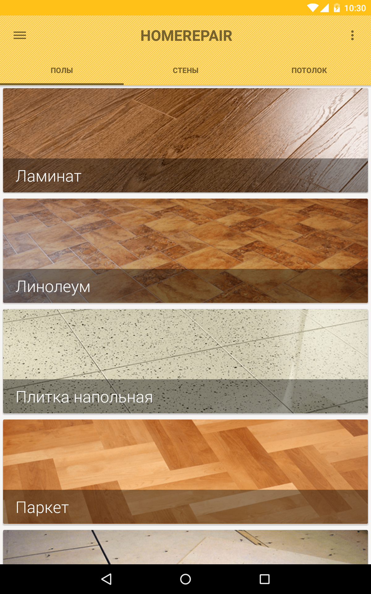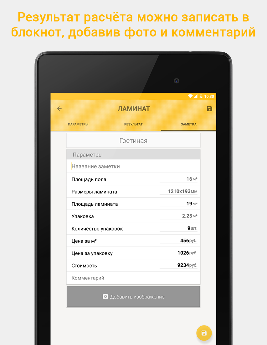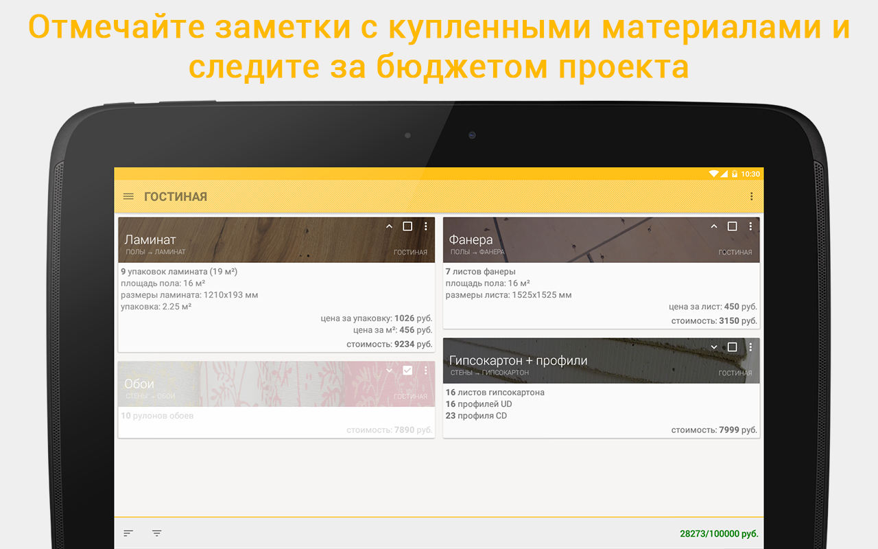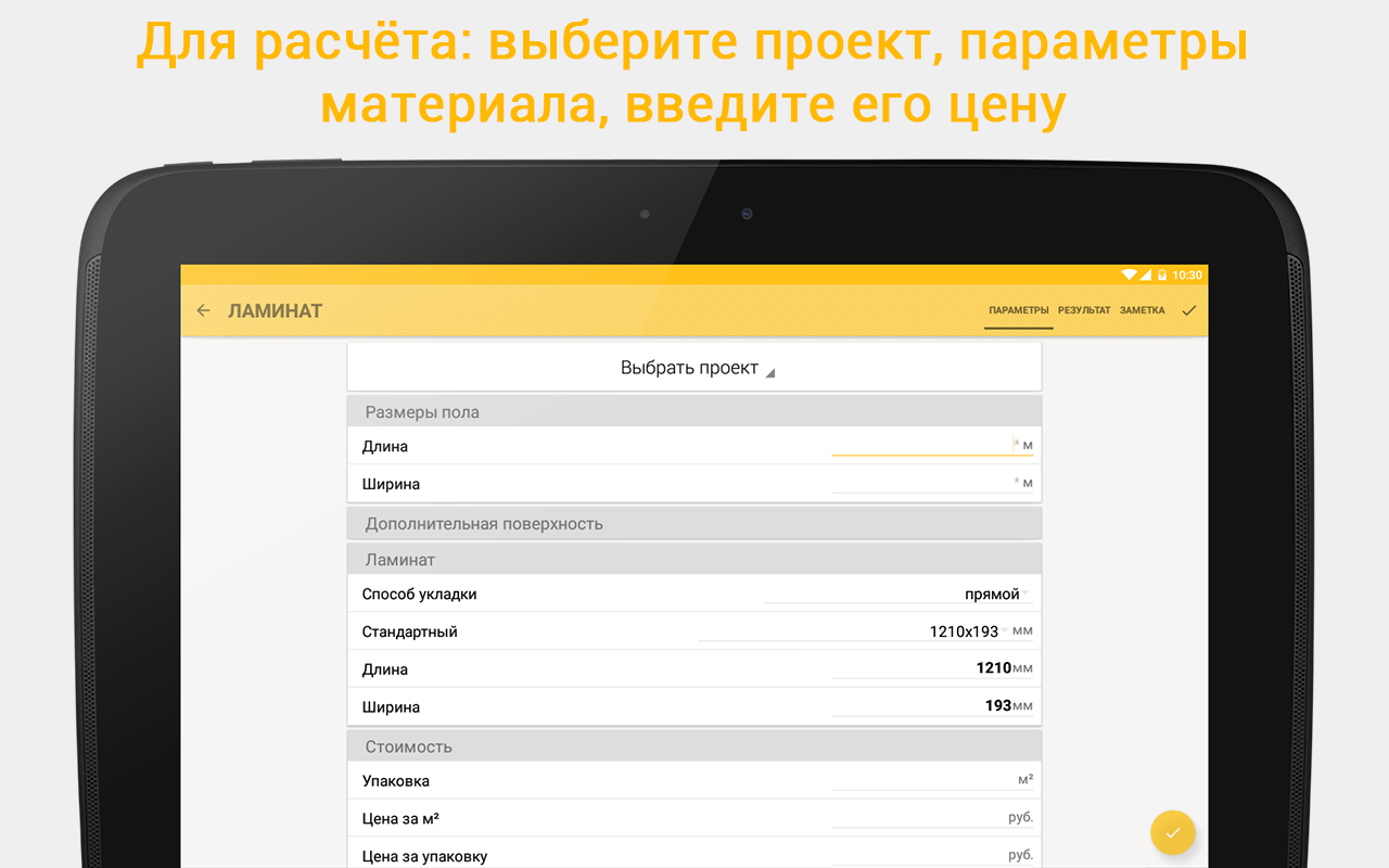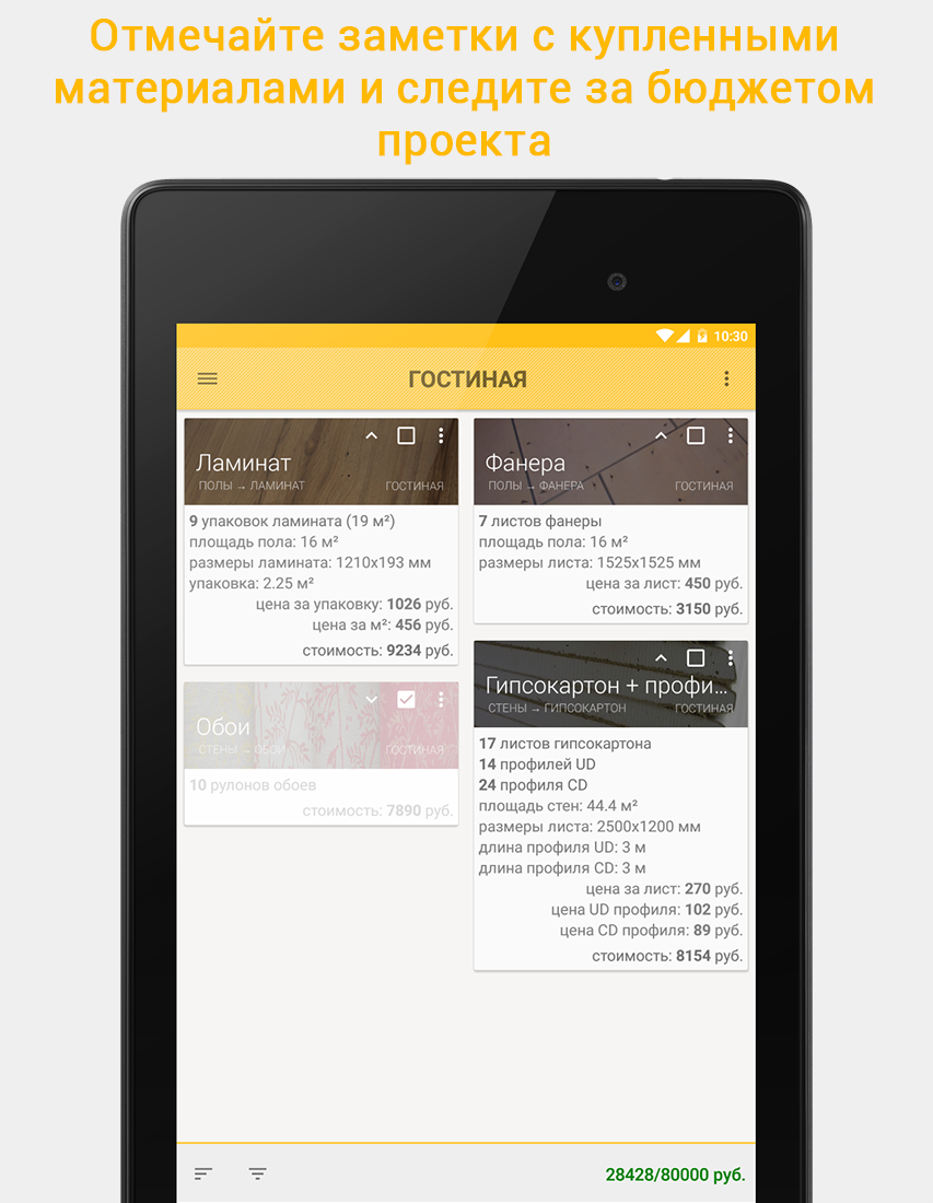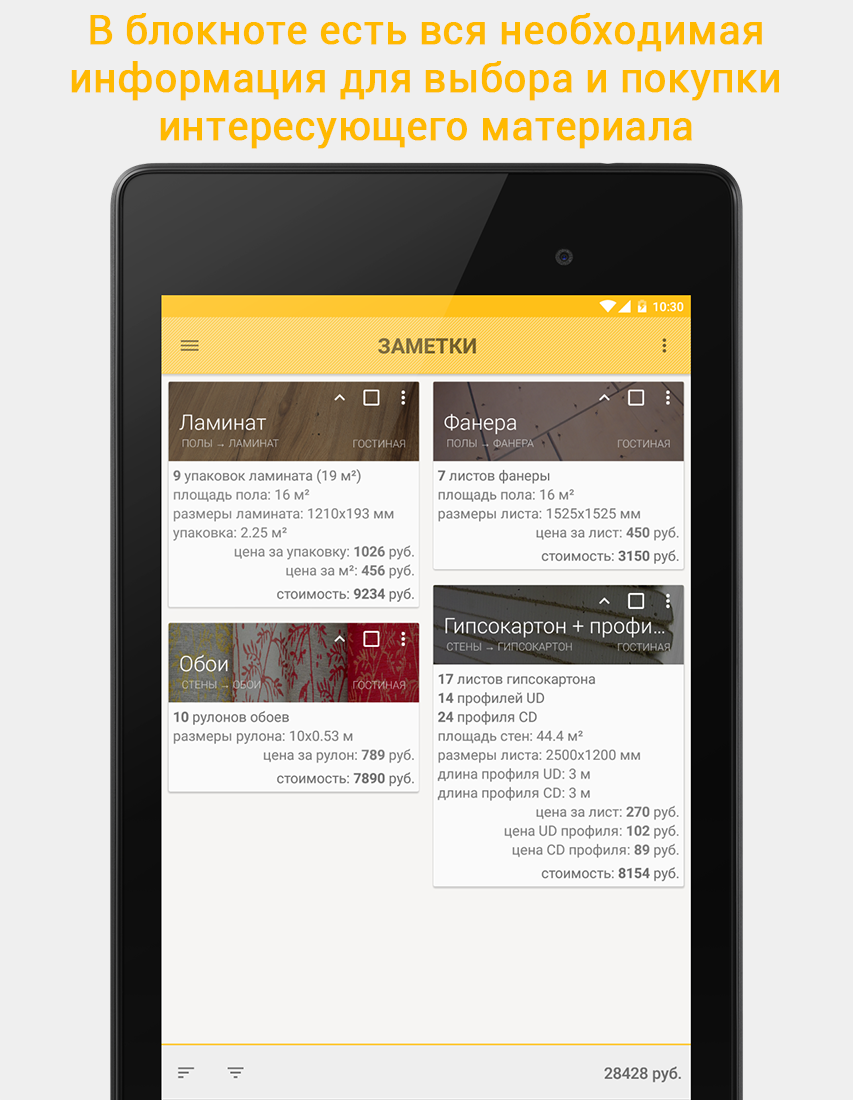 Теперь же Вам достаточно знать только размеры помещения — всё остальное приложение HomeRepair сделает за Вас. И на все расчёты потребуется меньше минуты! Полученный результат можно записать в блокнот прямо в программе, а также сразу рассчитать стоимость материалов. Так Вы сможете контролировать свой бюджет и не забудете про необходимые материалы.