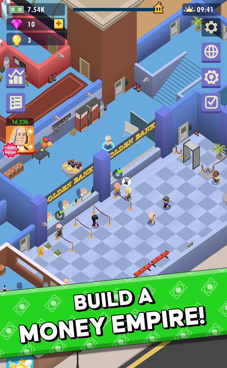 Управляйте своими собственными банковскими играми, печатайте деньги, обслуживайте клиентов, выдавайте кредиты и разбогатейте в новейших играх Idle Business Tycoon. Заботьтесь о финансах, как в играх с кассой, управляйте денежными потоками, как в играх с деньгами, и развивайте свой бизнес в банковских играх, чтобы стать миллиардером в играх с магнатами. Банковский симулятор Tycoon Games Совет дал вам полный контроль над отделением Idle Bank. Работайте менеджером банка, чтобы увеличить капитал и получить повышение в кэш-играх. Обслуживайте клиентов, увеличивайте приток кэш-игр, улучшайте помещения для развития бизнеса в Bank Games. Управление персоналом Управляйте персоналом Idle Bank, нанимайте консультантов, банкира, кассира, сотрудников службы поддержки и службы безопасности в играх Idle Business Tycoon. Управляйте своими финансами, оплачивайте расходы Idle Bank и зарплату сотрудников, как в Bank Job Simulator. Развивайте бизнес-магнаты Обновите оборудование, чтобы повысить эффективность и обеспечить бесперебойную работу бизнес-кэш-игр в режиме ожидания. Принимайте правильные финансовые решения и разумно используйте деньги, чтобы расширить бездействующие банковские игры. Разблокируйте хранилище игр с деньгами и отдел печати наличных, чтобы развивать свой бизнес и стать миллиардером Tycoon Games. Получить богатые деньги игры! Испытайте, каково это принимать финансовые решения, как миллиардер, в простоя Business Tycoon. Обслуживайте клиентов, увеличивайте приток наличности, делайте больше игр на деньги и разбогатейте в банковских играх. Ограбление банка в режиме ожидания Используйте игры на деньги, чтобы улучшить свои помещения, и наймите сотрудников службы безопасности, чтобы предотвратить ограбление банка. Сотрудники службы безопасности противодействуют грабителям банка в случае незанятого ограбления банка. Особенности игры Idle Bank: Управляйте своими банковскими играми Обслуживайте клиентов Idle Games Найм банковского персонала Денежные игры Управление финансами Tycoon Games Обновить резервный банк оборудования Разблокируйте новые области Кассовые игры Игры с распечаткой денег Предотвратить ограбление банка